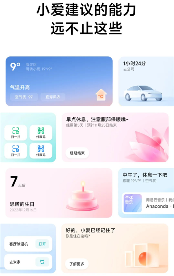 사용자의 이용 습관, 장면, 위치, 네트워크 상태 등을 기반으로 아침 일정 알림을 적극적으로 푸시하고, 지하철역에서 탑승 코드를 적극적으로 팝업 하고, 외출할 때 불을 끄십시오.