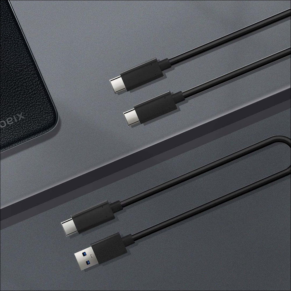 Xiaomi Portable Solid State Drive 1TB는 안정적인 고속 데이터 전송을 추구하기 위해 Type-C to Type-C 전송 케이블과 Type-C to USB-A 전송 케이블을 액세서리로 제공합니다.