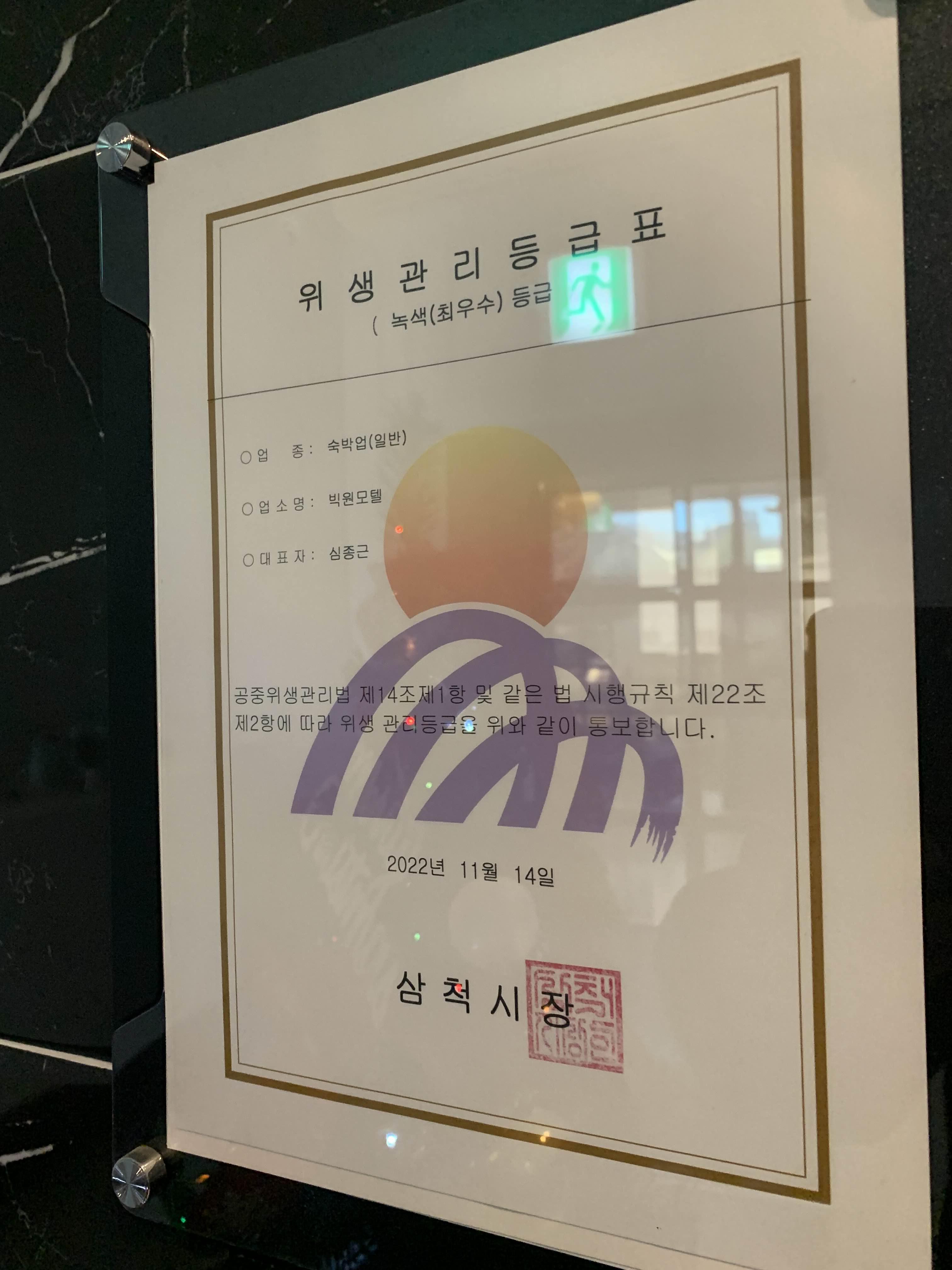 출장지의 숙박시설 선택의 첫 번째 기준은.... 깔끔!! 바로 깨끗한 숙박시설을 찾게 되더군요. 숙박시설이 대부분 깨끗해 보이기는 하지만.... 너무 냄새나고 더러운 곳이 많아서...(아무 데서나 잘 자고 그랬는데... 이제는 나이를 먹어서 그런지... 깨끗한 곳을 찾게 되더군요) 위생관리등급표에는 최우수 등급이라는 안내문이 보여서... 마음에 들더군요.ㅎㅎ