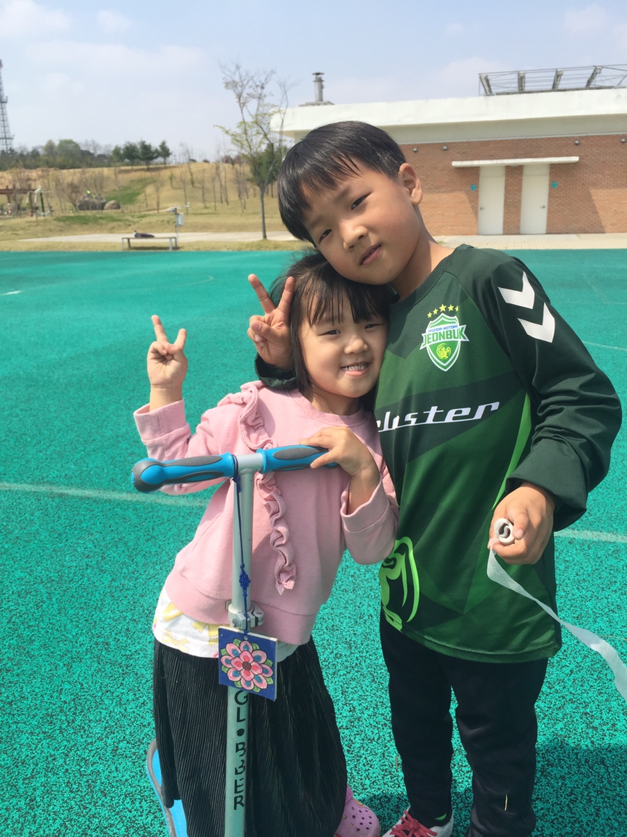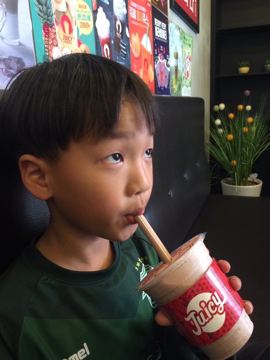 훈련이 끝나고도 친구들과 한 시간가량 축구하며 신나게 놀았네요.ㅎㅎ 소율이는 아빠와 운동기구를 하나하나 구경하며 선우를 기다렸네요. 그린스쿨이 끝나면 간식으로 쥬시 방문하여 쥬스 하나씩 입에 물고~~ 점심 식사를 위해 전북대 방문^^
