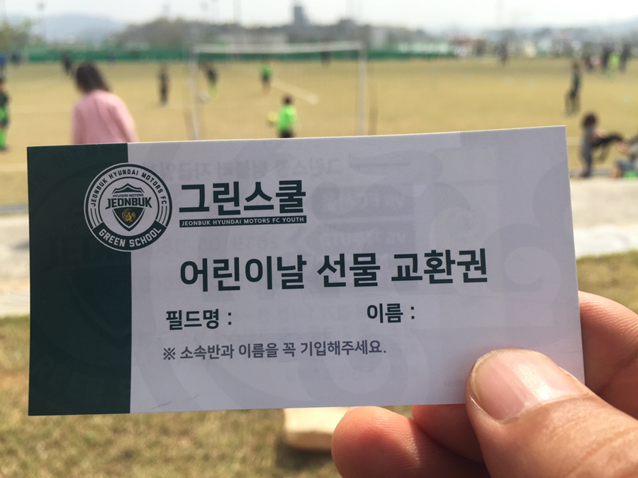 아 참!!! 간식과 함께 그린스쿨에서 아이들에게 어린이날 선물 교환권도 나누어 주었습니다. 선물은 텀블러(물병)인데.. 홈경기가 있는 날 경기장에서 지급해주네요.ㅎㅎ