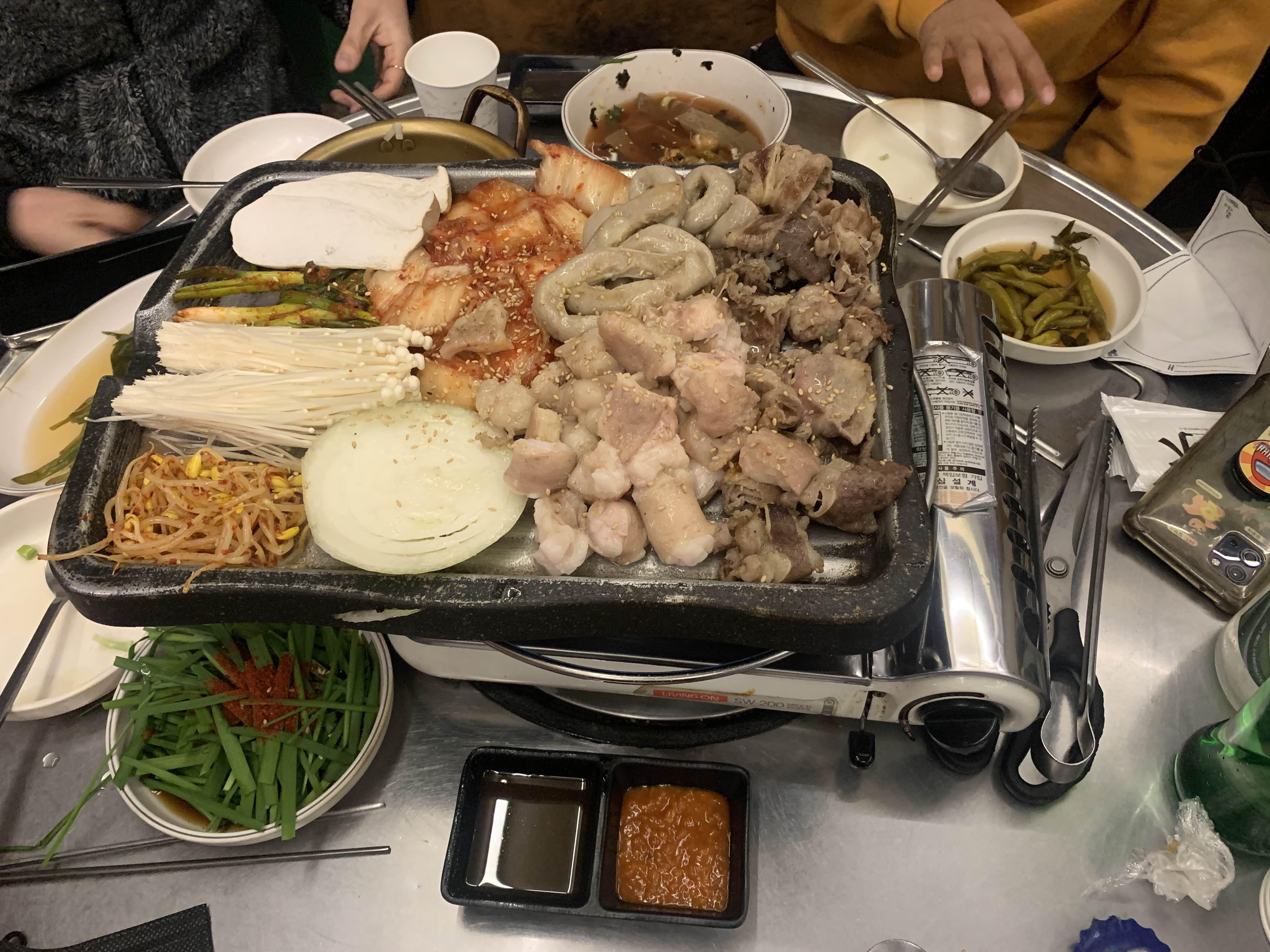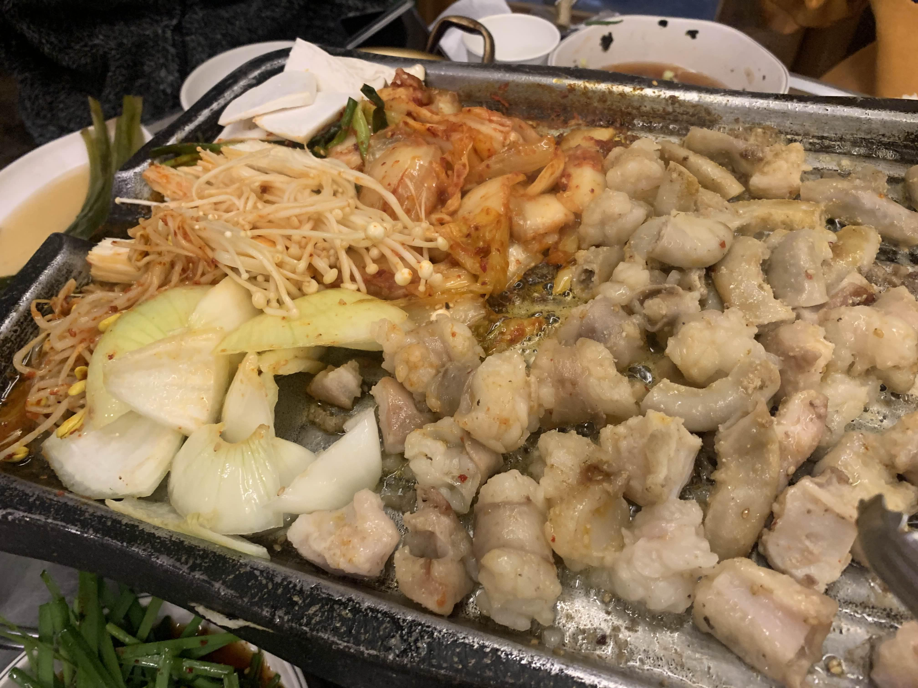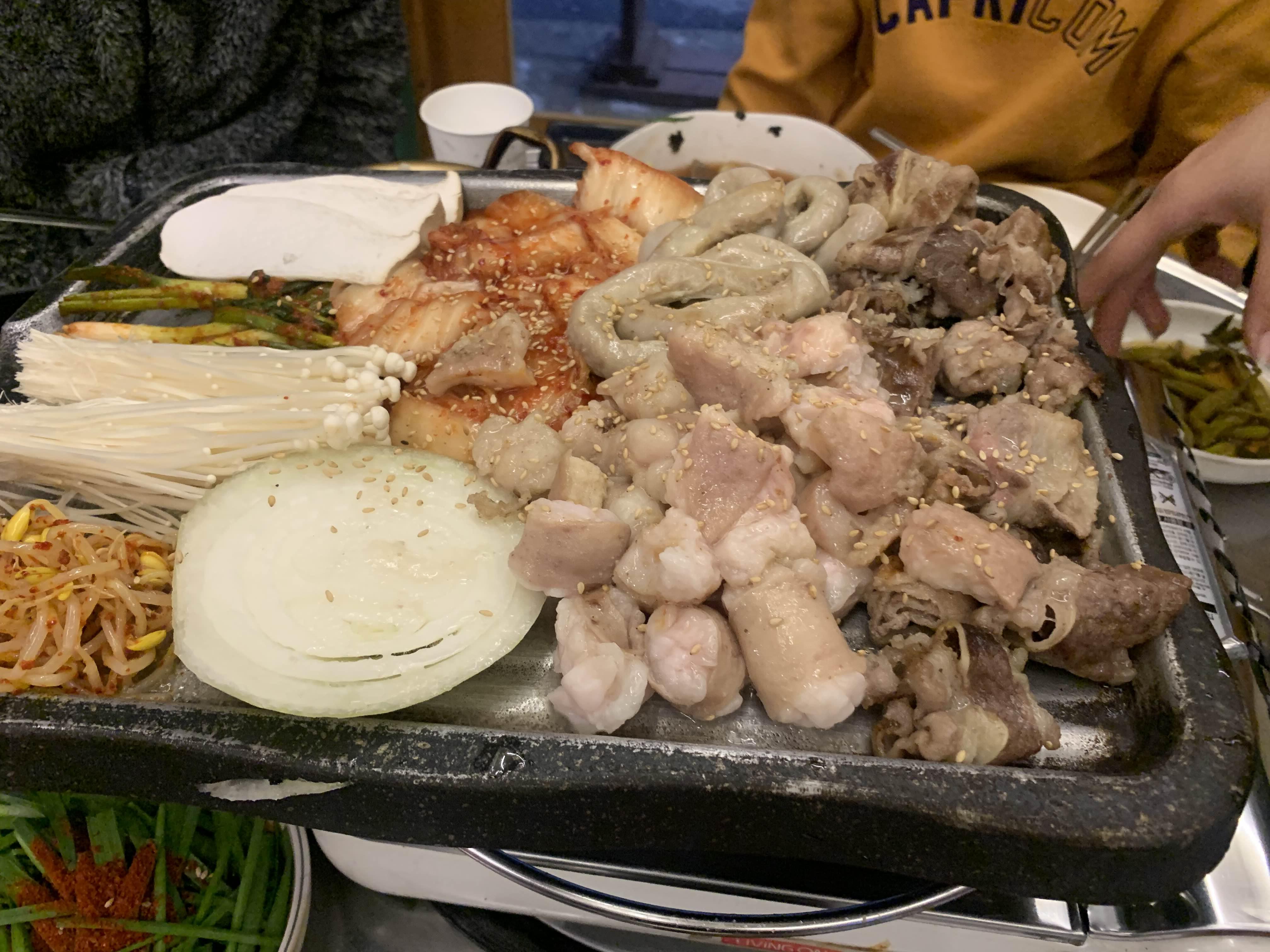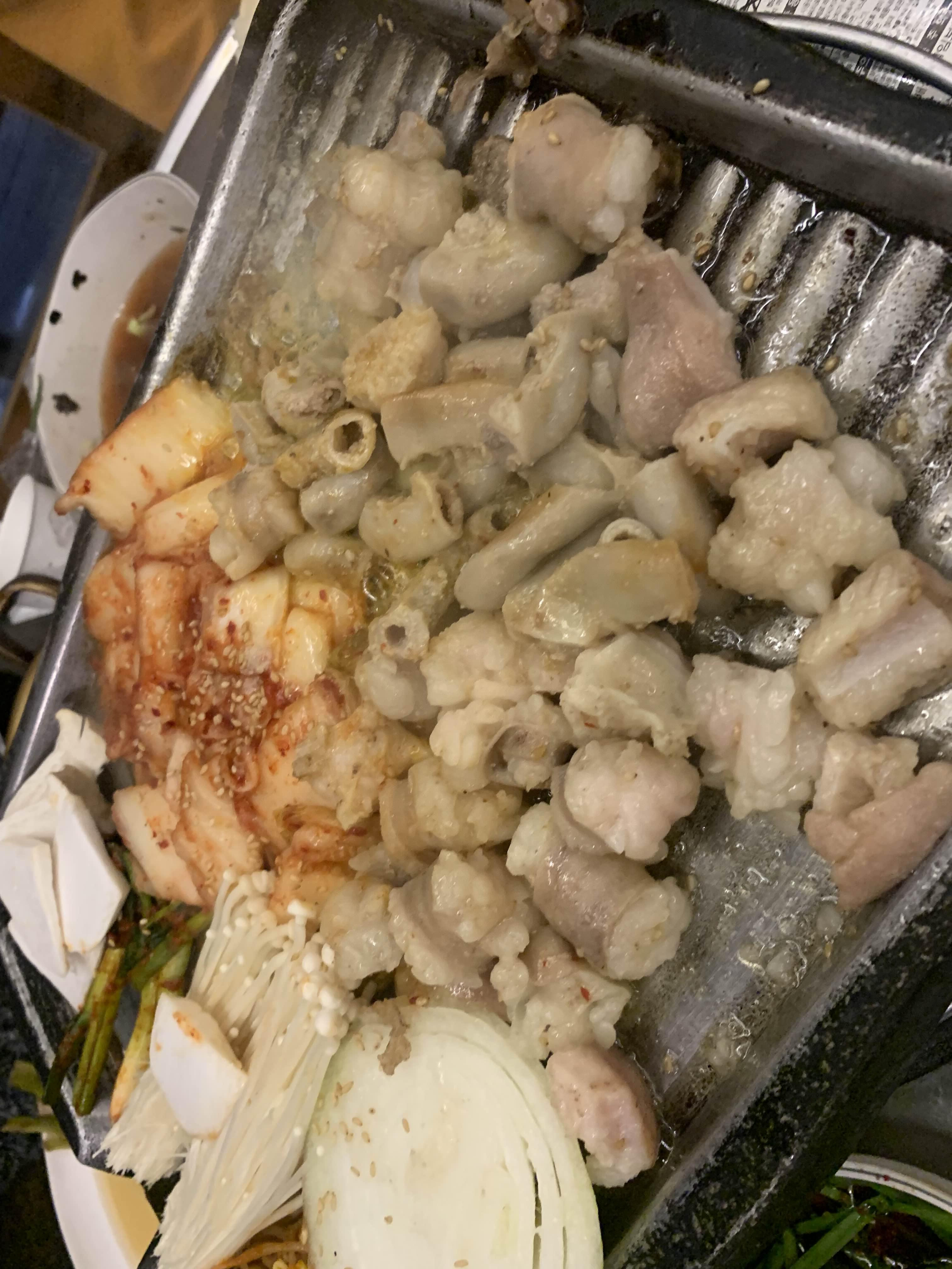곱창의 비주얼은... 나름, 불판이 좀 부족하다는 느낌이 들더군요. 이 불판 사이즈는 딱 2인분 주문하면 괜찮을.... 모둠구이는 4가지(곱창, 대장, 막창, 우삼겹)가 나오는데, 우삼겹을 모두 익혀서 나오더군요. 익혀서 나온 우삼겹을 한입! 조금 질깃한 식감이라... 반으로 잘라서 먹으니 괜찮더군요.