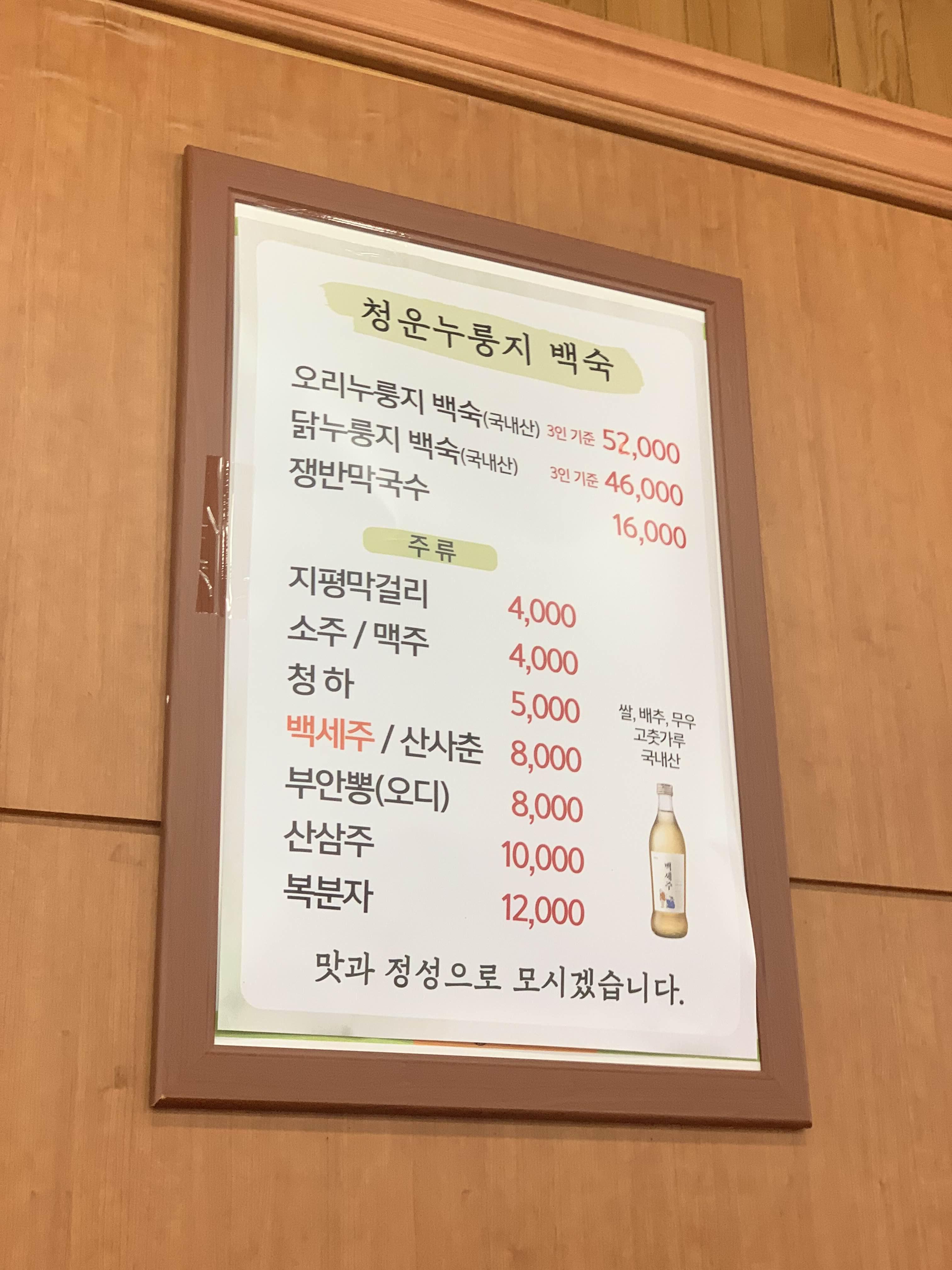 그리 길지 않은 점심시간에 식사를 하기 위해서는 사전 예약!!! 예약하기 위해 전화를 걸어보았다. 오리인지 닭인지 메뉴를 미리 말해달란다.... 무슨 메뉴가 잘 나가냐고 물어보니 "닭"이라고 하신다! 닭으로 예약!ㅎㅎ 가격은 46,000원으로... 3인 기준으로 되어 있으나, 4명이 먹어도 괜찮을 정도의 양이다! 닭고기 양은 그리 많지 않지만;;; 누룽지가 올려진 죽이 많아서;;; 4인이 먹기에도 충분하다.
