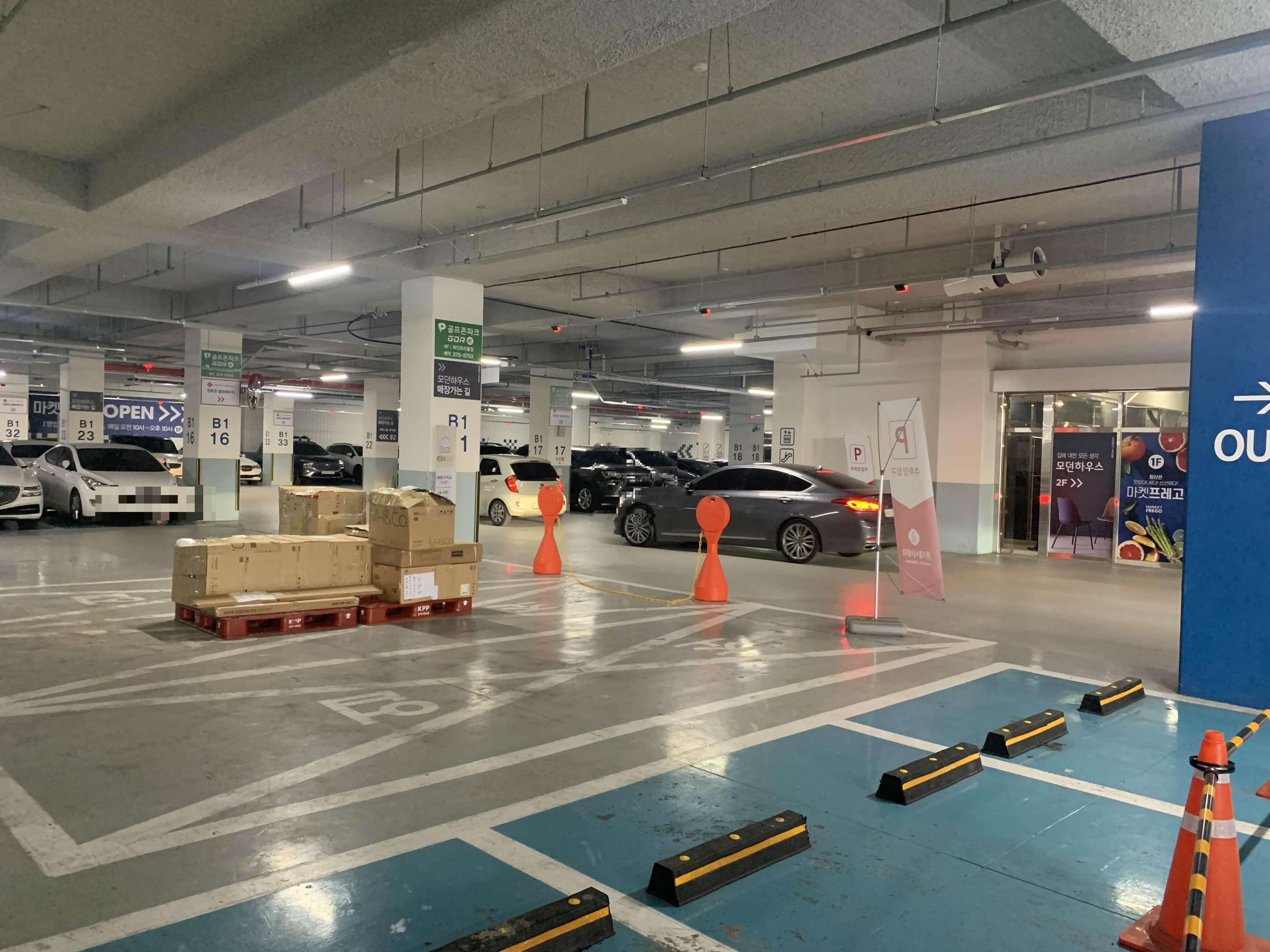 파인트리몰의 지하 주차장은..... 내부 사람 이동 동선이.. 차량과 혼선이 좀 있다;;; 입구 방향도 헷갈려서.... 사람들이 이동 동선에 라인이 그려지면 좋을 듯싶다.