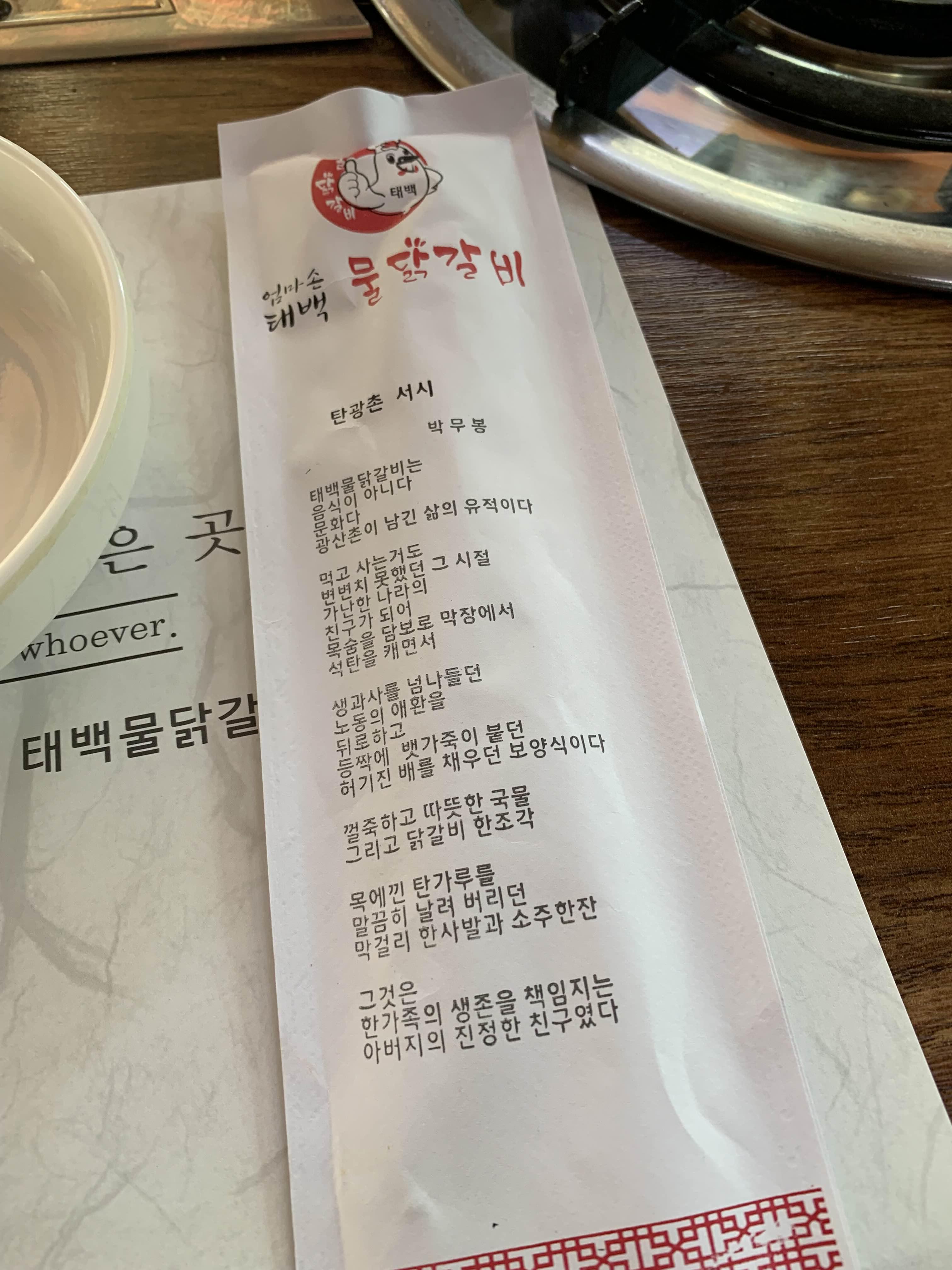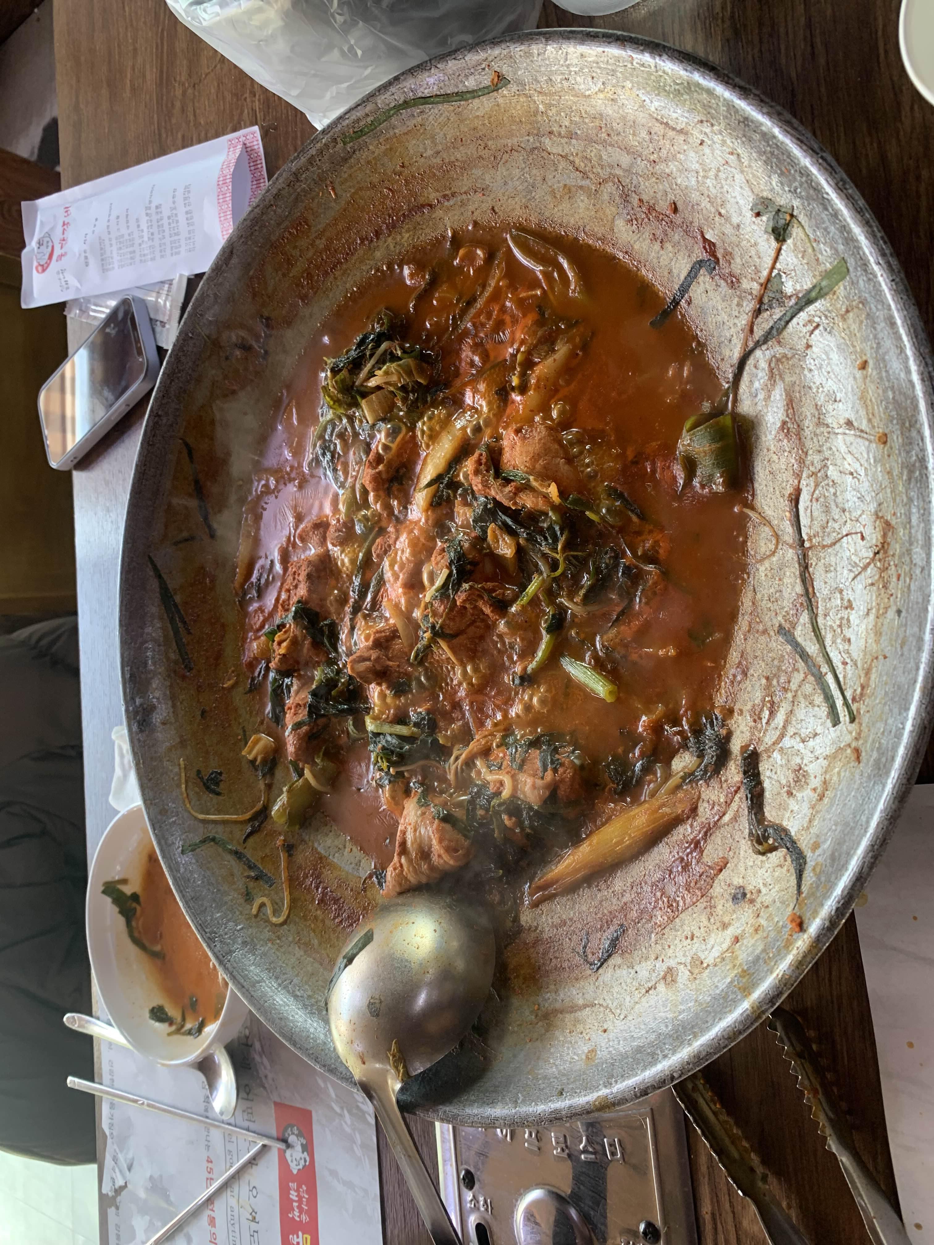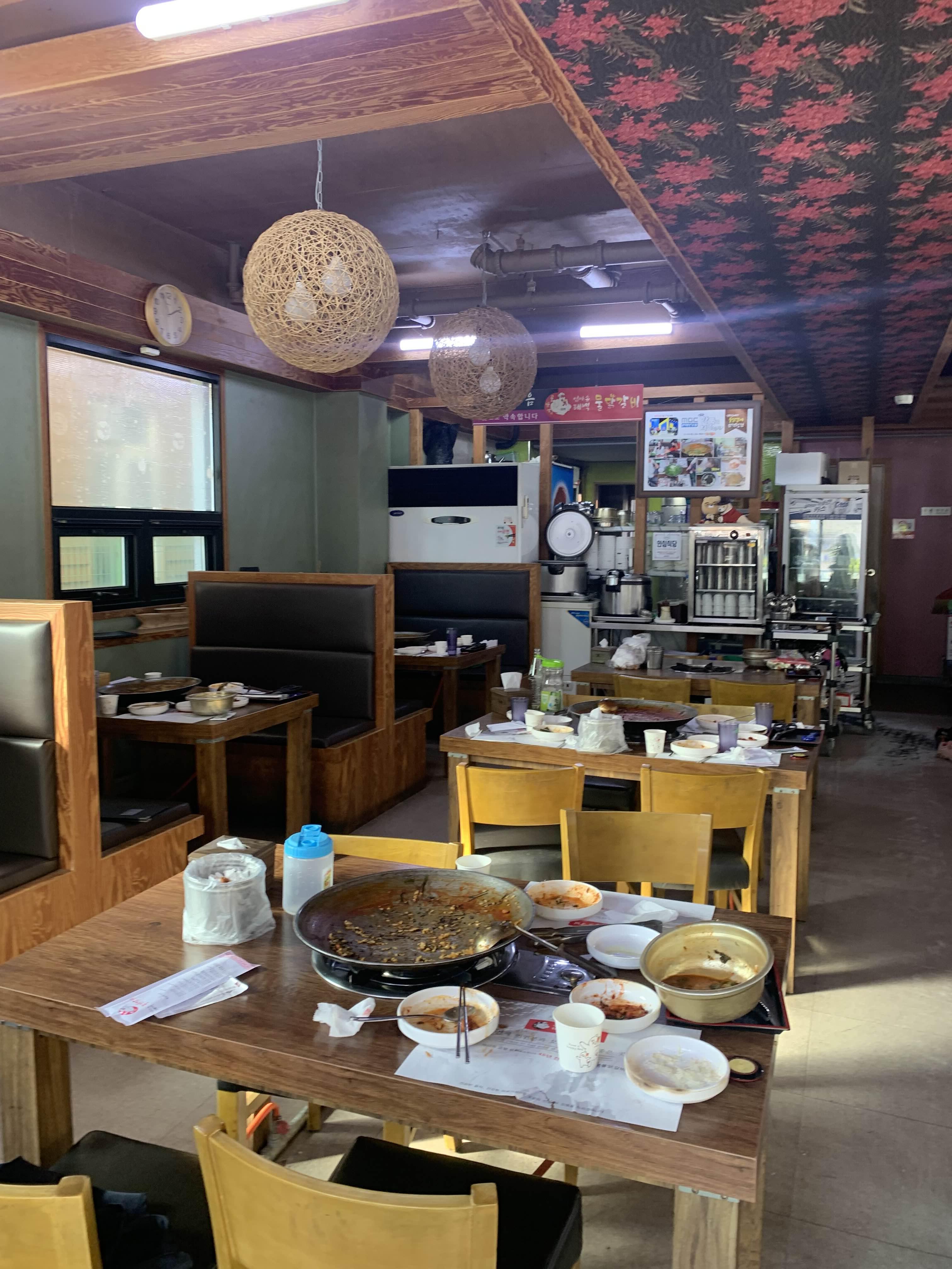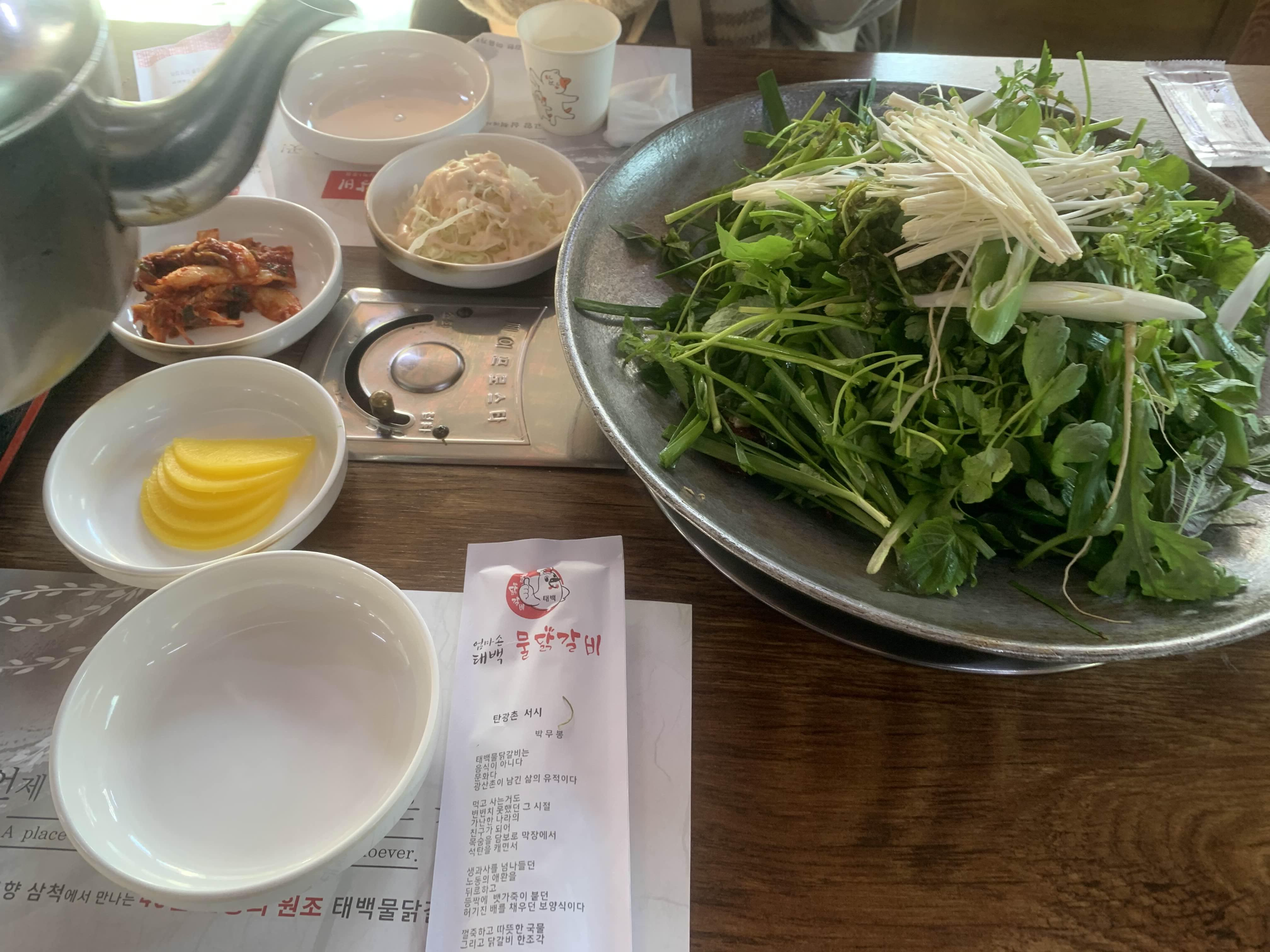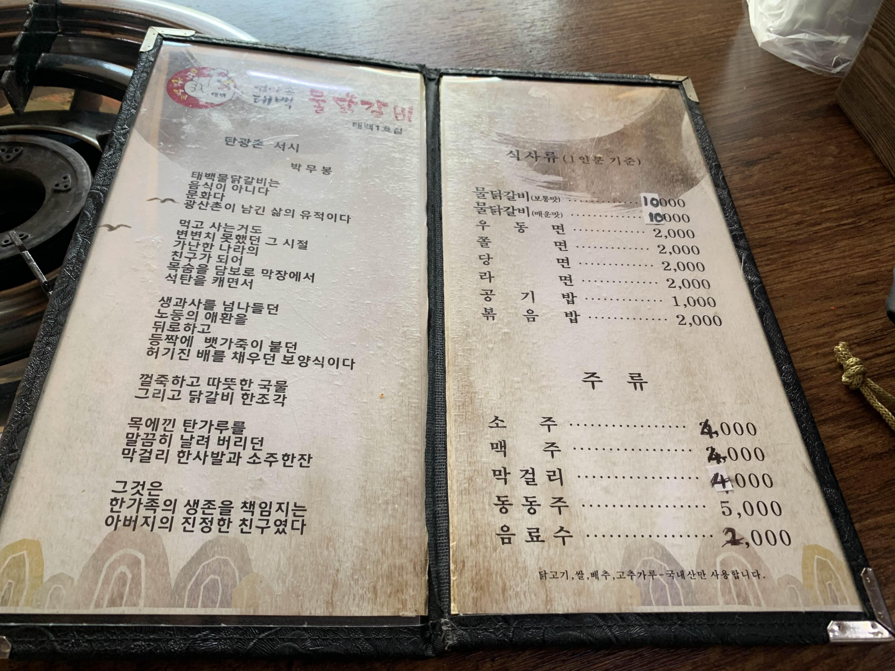 오전 회의가 늦어지며.... 연달아 점심식사 시간이 늦어졌다. 삼척에 물닭갈비가 유명하다 하여... 나름 맛집이라 불리는 물닭갈비 식당을 방문하였다. 하지만!!! 그 식당은 정기휴무!!ㅠㅠㅠ 그래서... 대안이라 생각한 널 유명한 물닭갈비 식당에 방문하였다. 메뉴판을 스캔하니... 단일메뉴! 보통맛과 매운맛 2가지라... 기본이 보통맛으로 주문해 보았다.