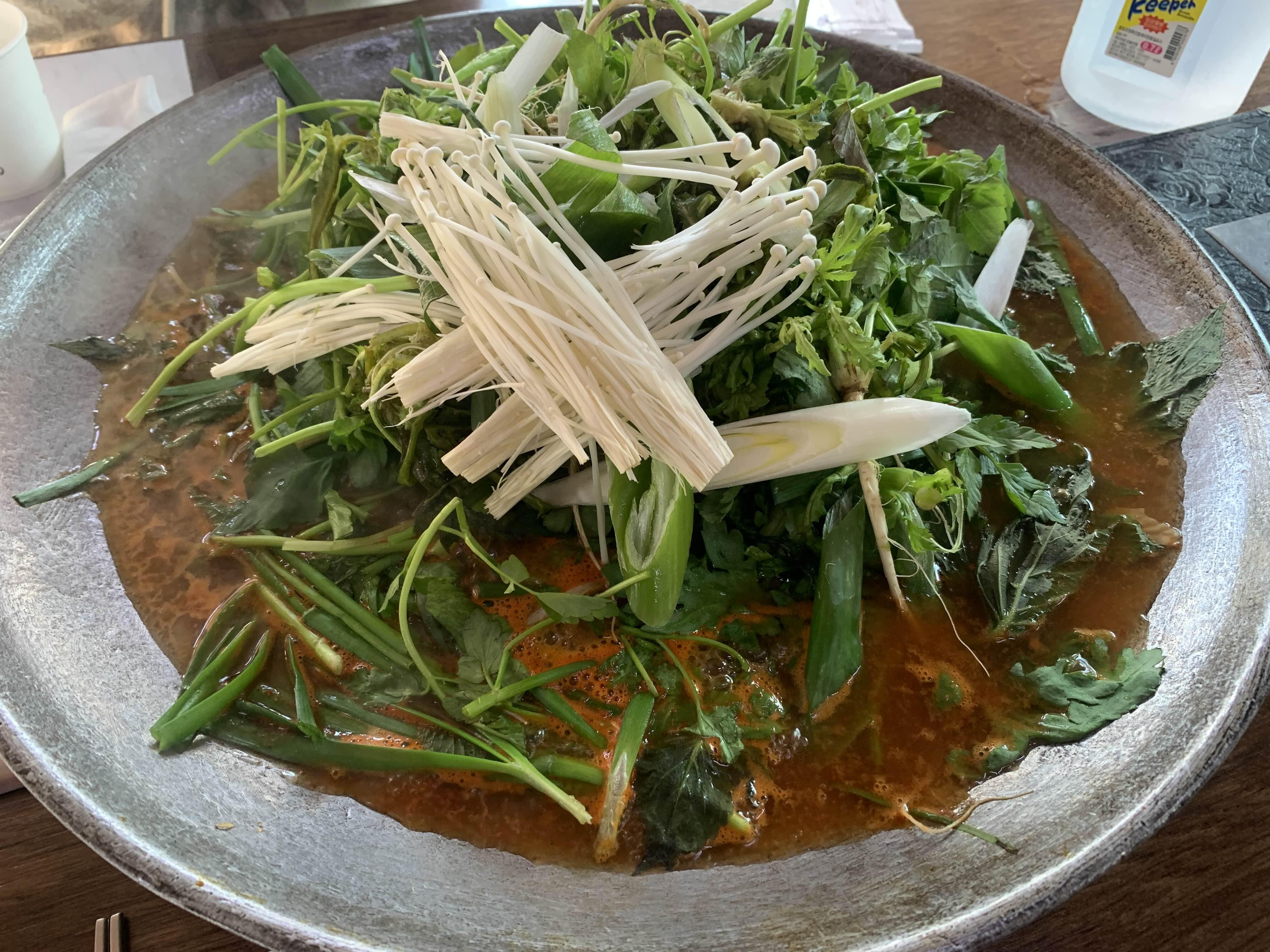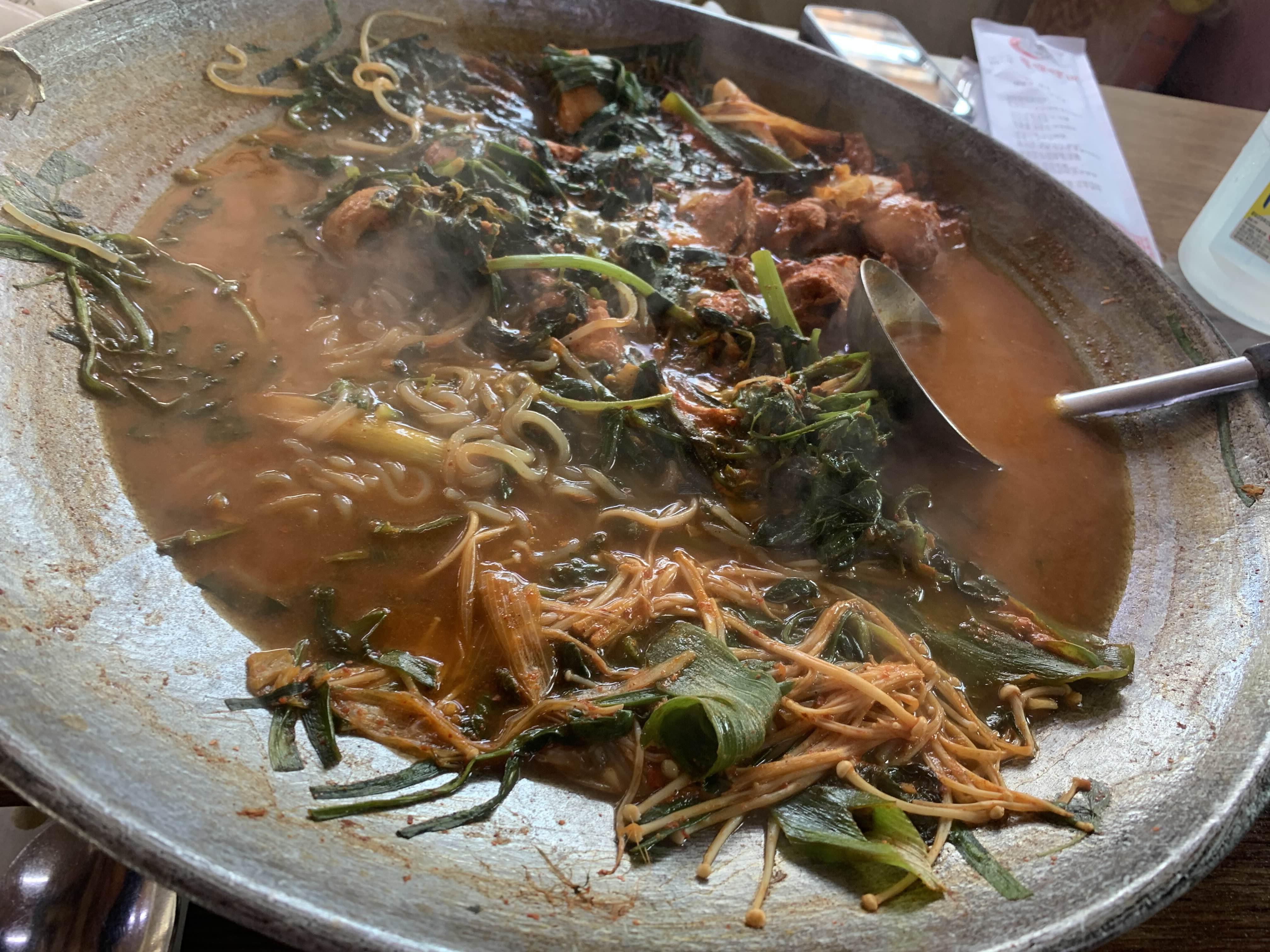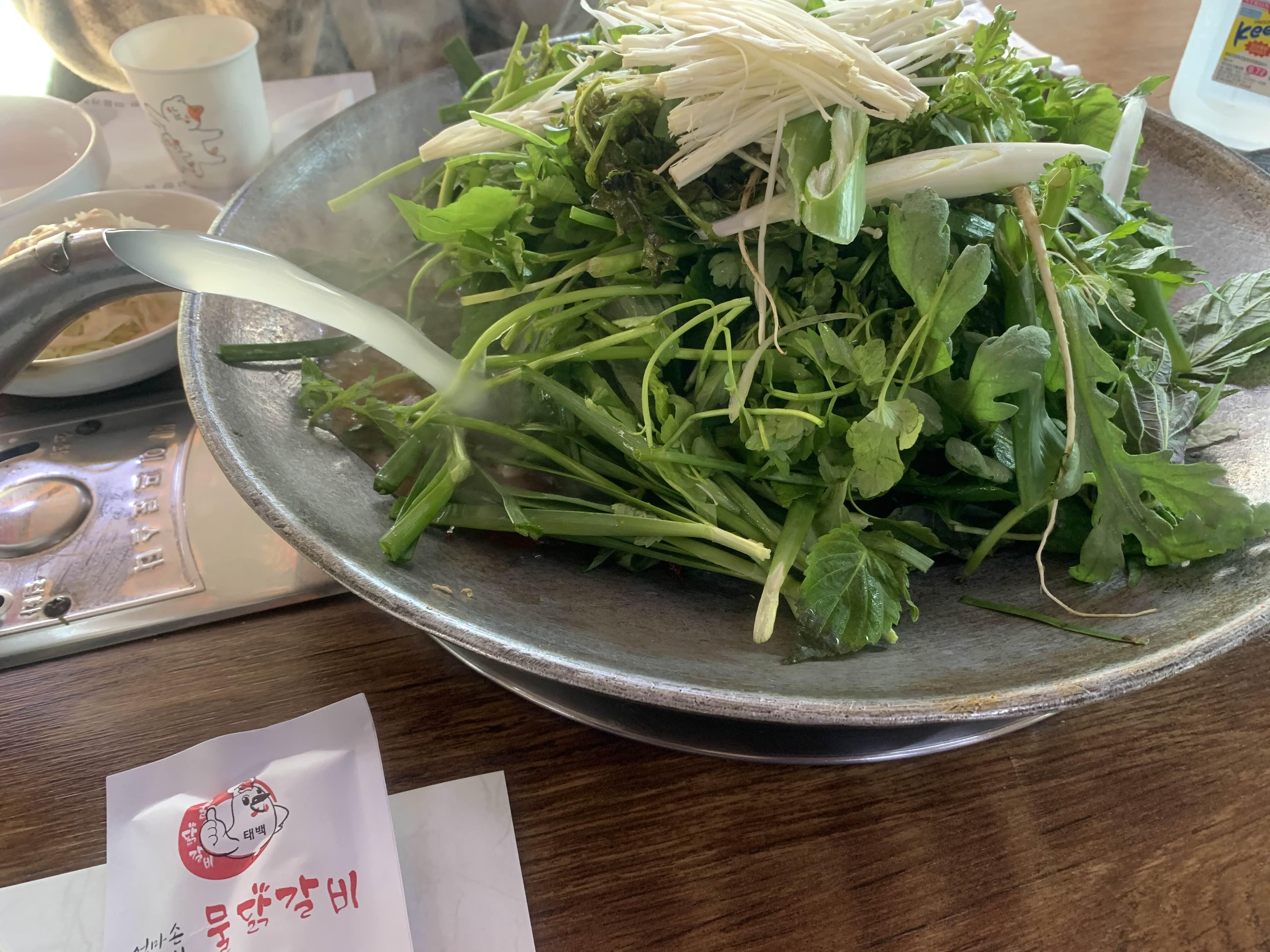 물닭갈비의 비주얼은..... 내 눈을 사로잡았다. 무슨 닭갈비 비주얼이 아닌.... 야채탕의 느낌? 건강한 느낌이 많이 들었다. ㅎㅎ 닭갈비의 양배추나 양파가 아닌... 푸성귀가 다양하게 들어있어서... 건강하게 비주얼에 먹기 전부터 기분이 좋아졌다.