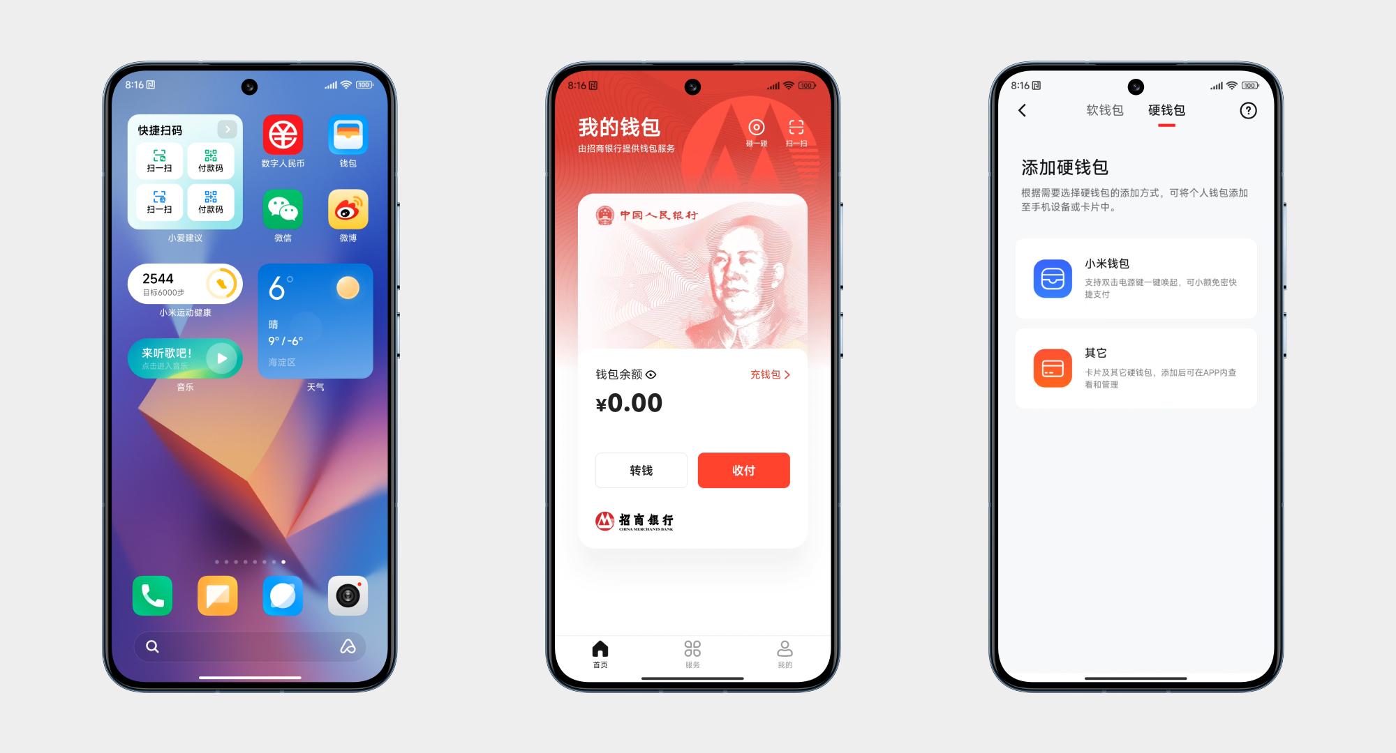 Xiaomi 휴대폰 사용자는 Digital RMB 앱을 열고 "My-Hard Wallet"을 클릭한 다음 페이지 오른쪽 상단 모서리에 있는 "+" 기호를 클릭하고 "Xiaomi Wallet"을 선택한 다음 페이지의 지침에 따라 추가를 완료합니다. 하드 지갑의. 현재 Xiaomi 13, Xiaomi 13 Pro, Xiaomi MIX 4, Redmi K60, Redmi K60 Pro, Redmi K60E, Redmi Note 12 Pro Extreme Edition을 지원합니다.