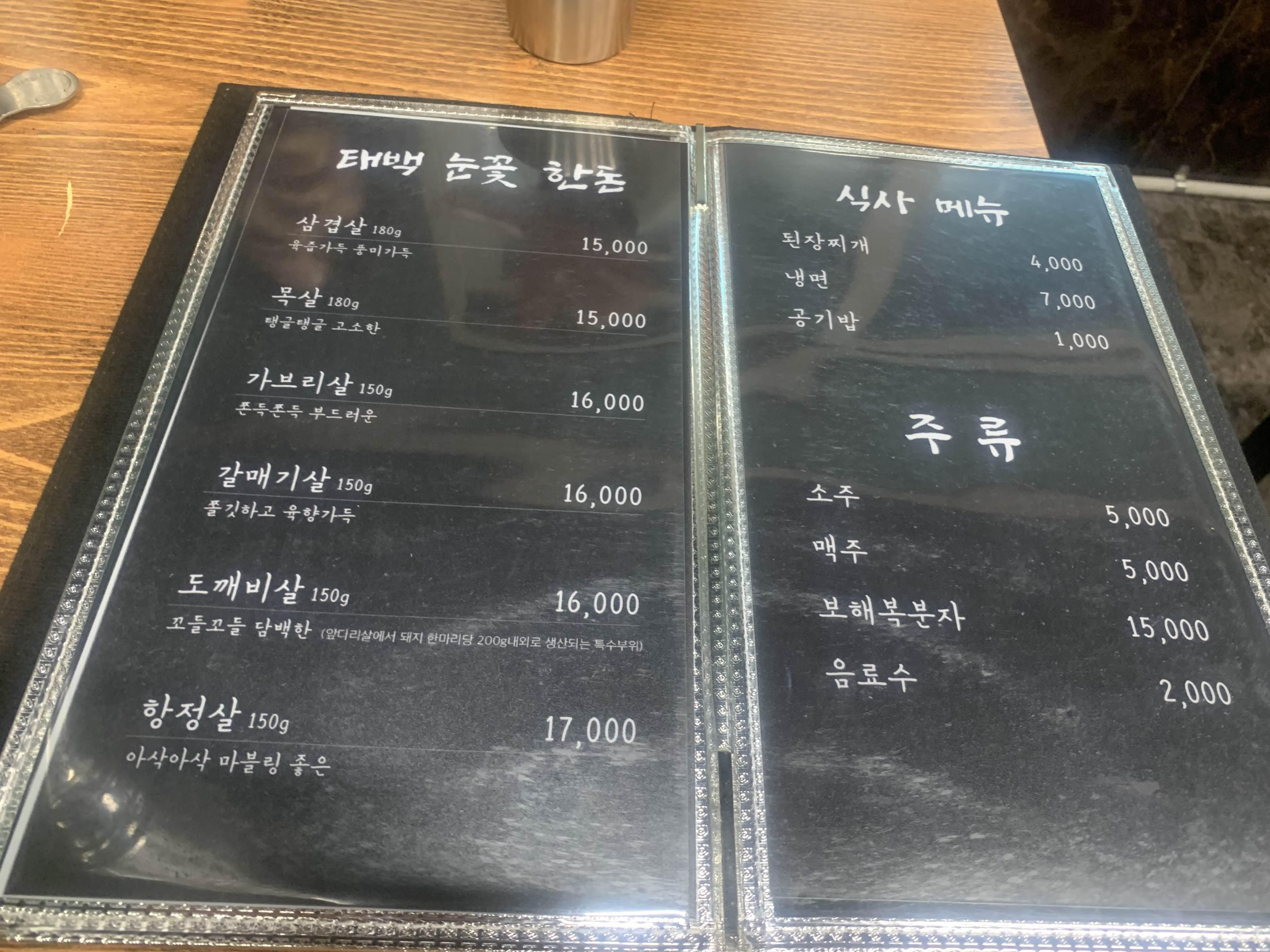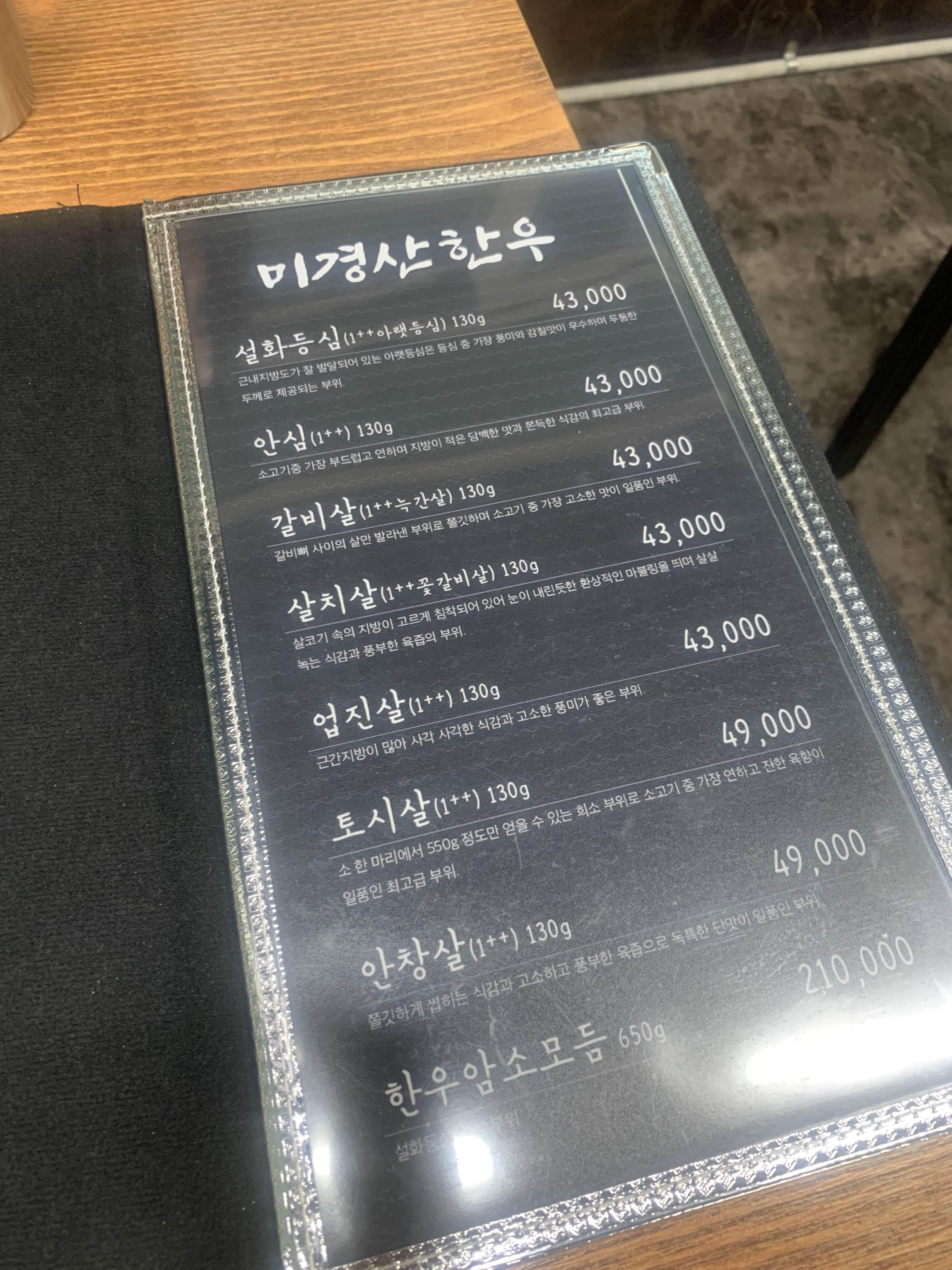 식당에 방문하여 고기를 주문하지도 않았는데... 불판 주위에 쌀뜨물을 부어주셨다. 쌀뜨물은.... 고기 기름이 흘렀을 경우 기름이 잘 튀기지 않는다고 한다.ㅎㅎ 메뉴판을 펼쳐보고... 깜짝 놀라였다!! 사전에 메뉴판을 보았을 때.... 가볍게 맛있는 고기를 맛보는 식당으로 알고 있었는데....(기존에 메뉴와 현재 메뉴가 많이 달라진 거 같다.)