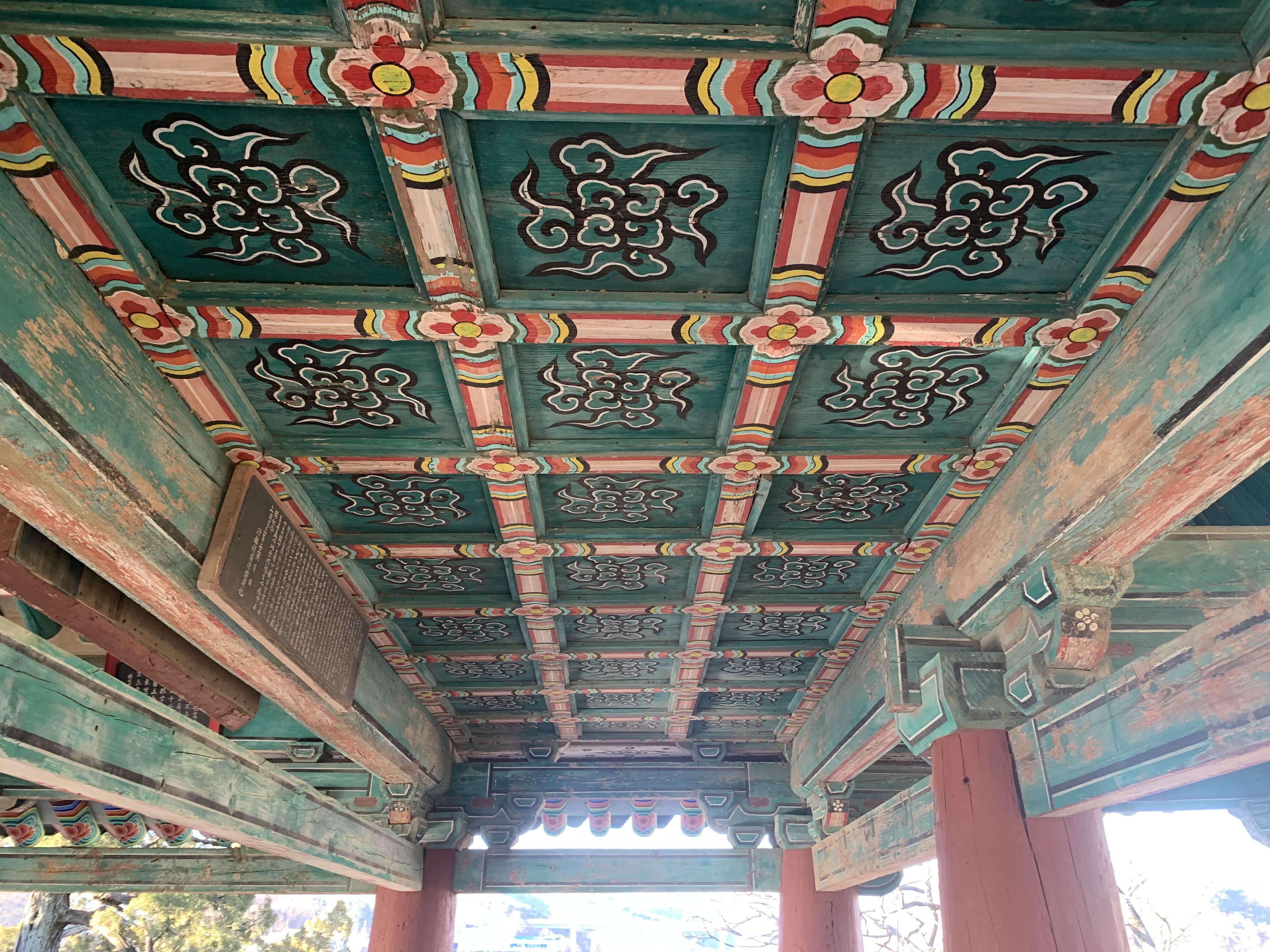 죽서루에는 연등천장과 우물천장이 있다고 한다. 우물천정은 아파트 거실에 있는 천정으로 움푹 우물처럼 들어간 천정 모양이다. 하지만.... 연등천장!? 무슨 천정일까? 처음 들어본 단어이다. 연등천정을 찾아보니... 한옥에 구조물이 드러난 천정 형태인... 마감이 없는 천정을 뜻한다고 한다. ㅎㅎ