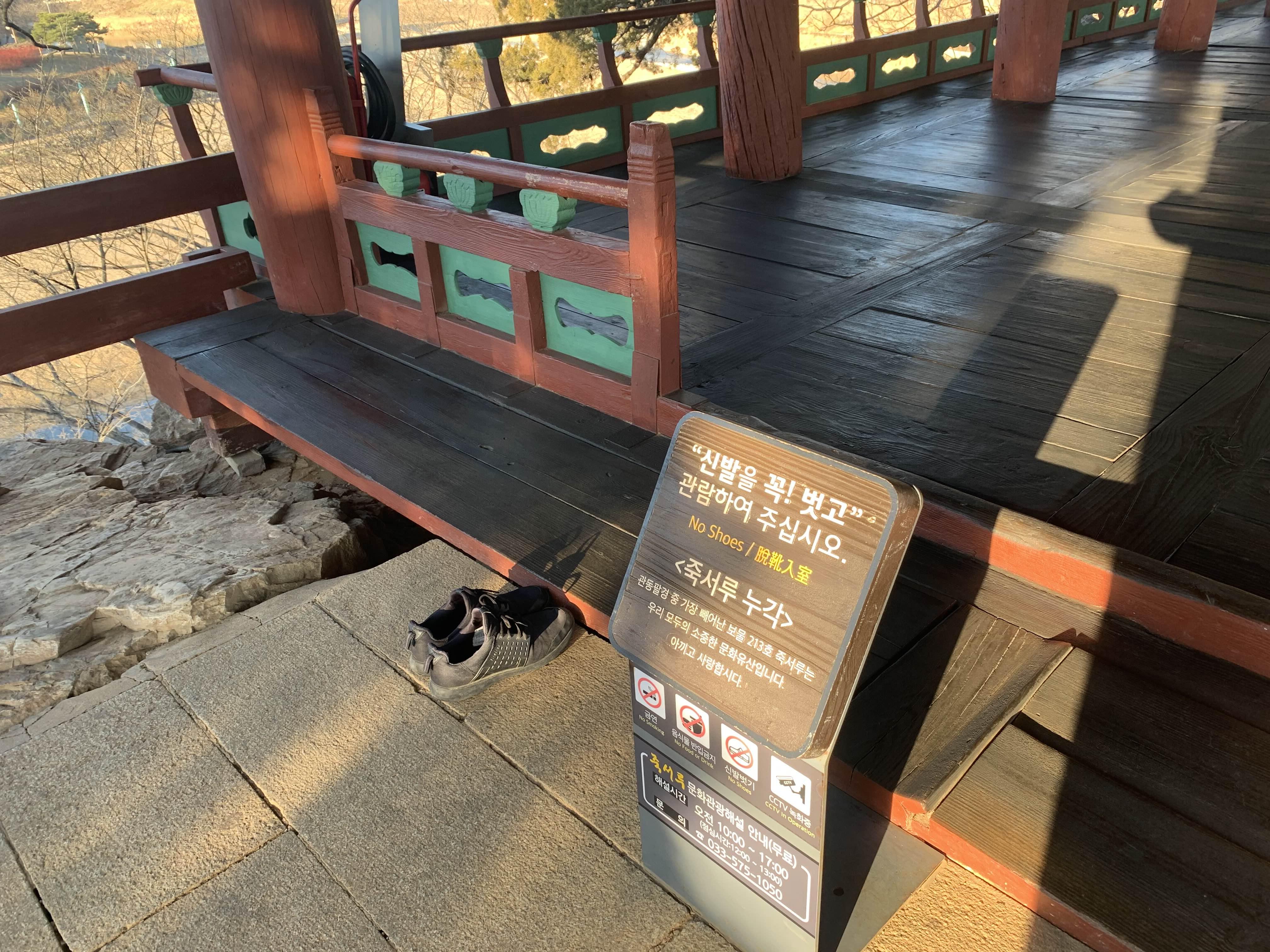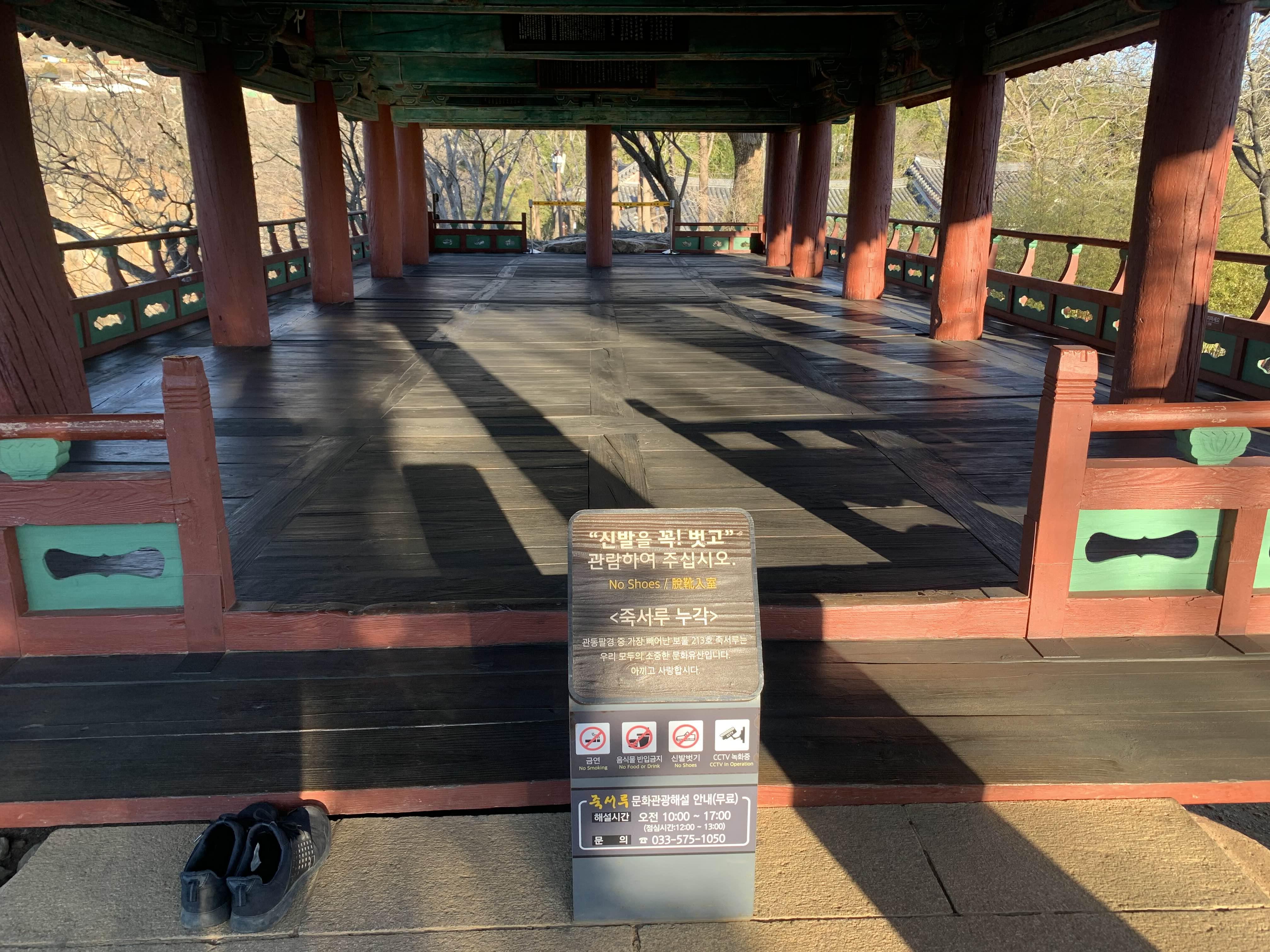 죽서루 입구에는 "신발을 꼭 벗고 관람"하라는 안내문이 보인다. 안내문 보다, 나의 시선을 사로잡은 건!! 바로 한편에 준비된 신발이다. 신발을 놓여 있으나!! 안내문 보다 이리 놓인 신발에 맞추어 나도 신발을 놓아야 한다는 생각이 들었다.