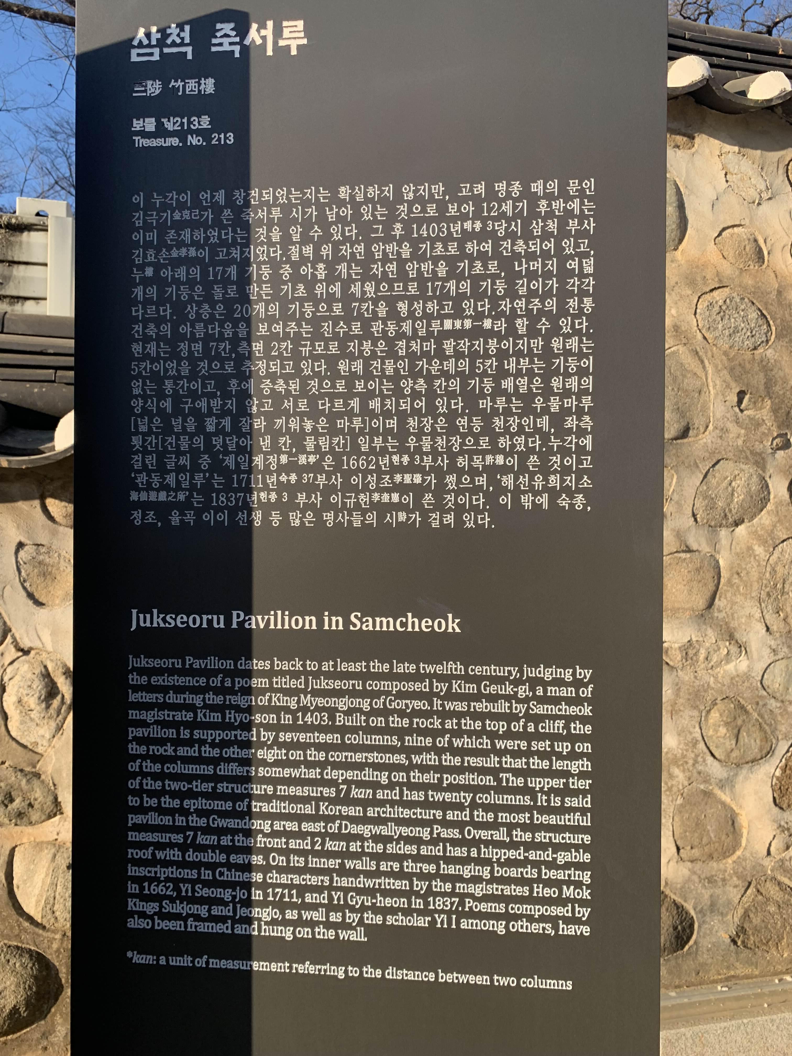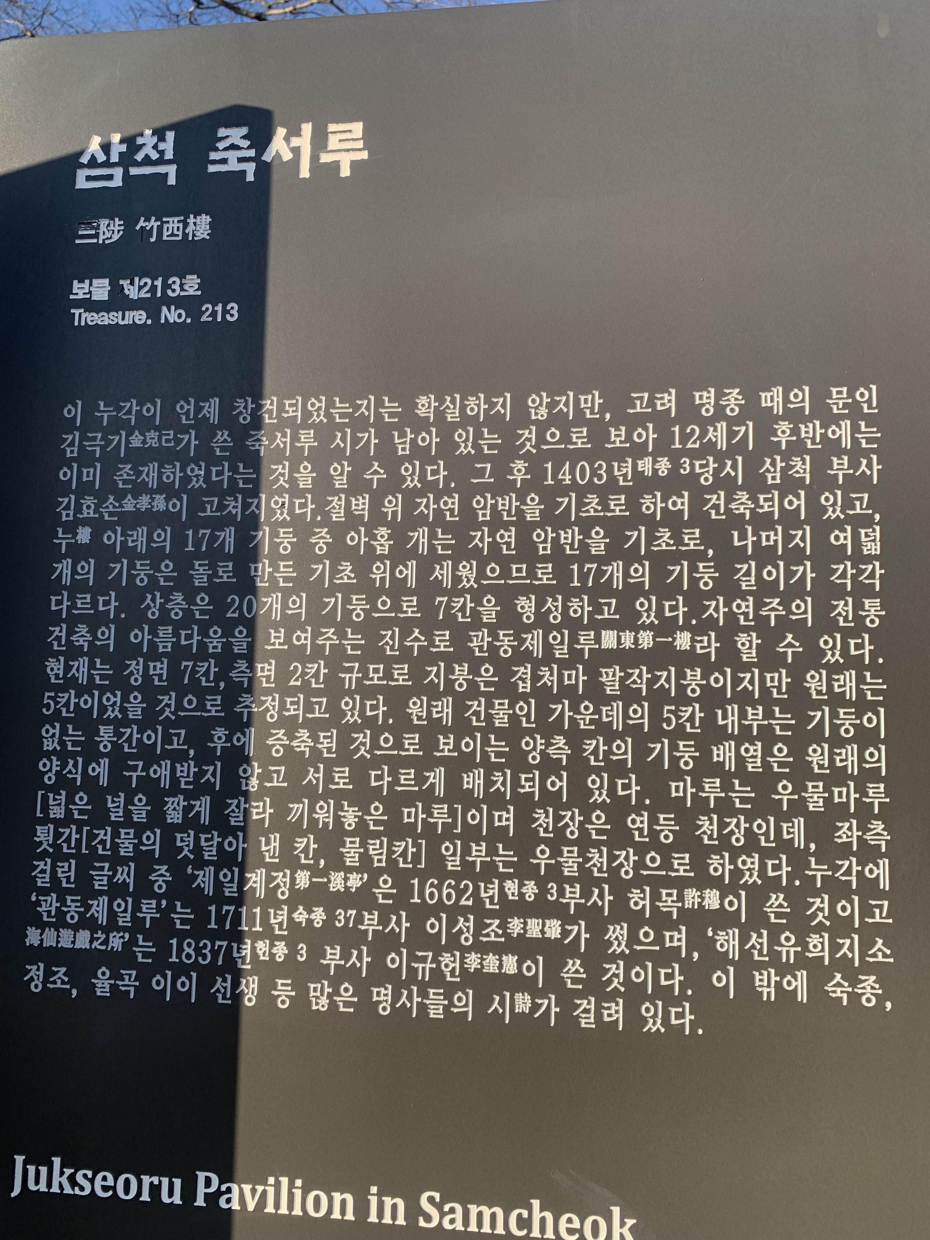 오늘은 삼척 오십천과 태백산의 경관을 관람하는 누각! 죽서루에 방문해 보았다.