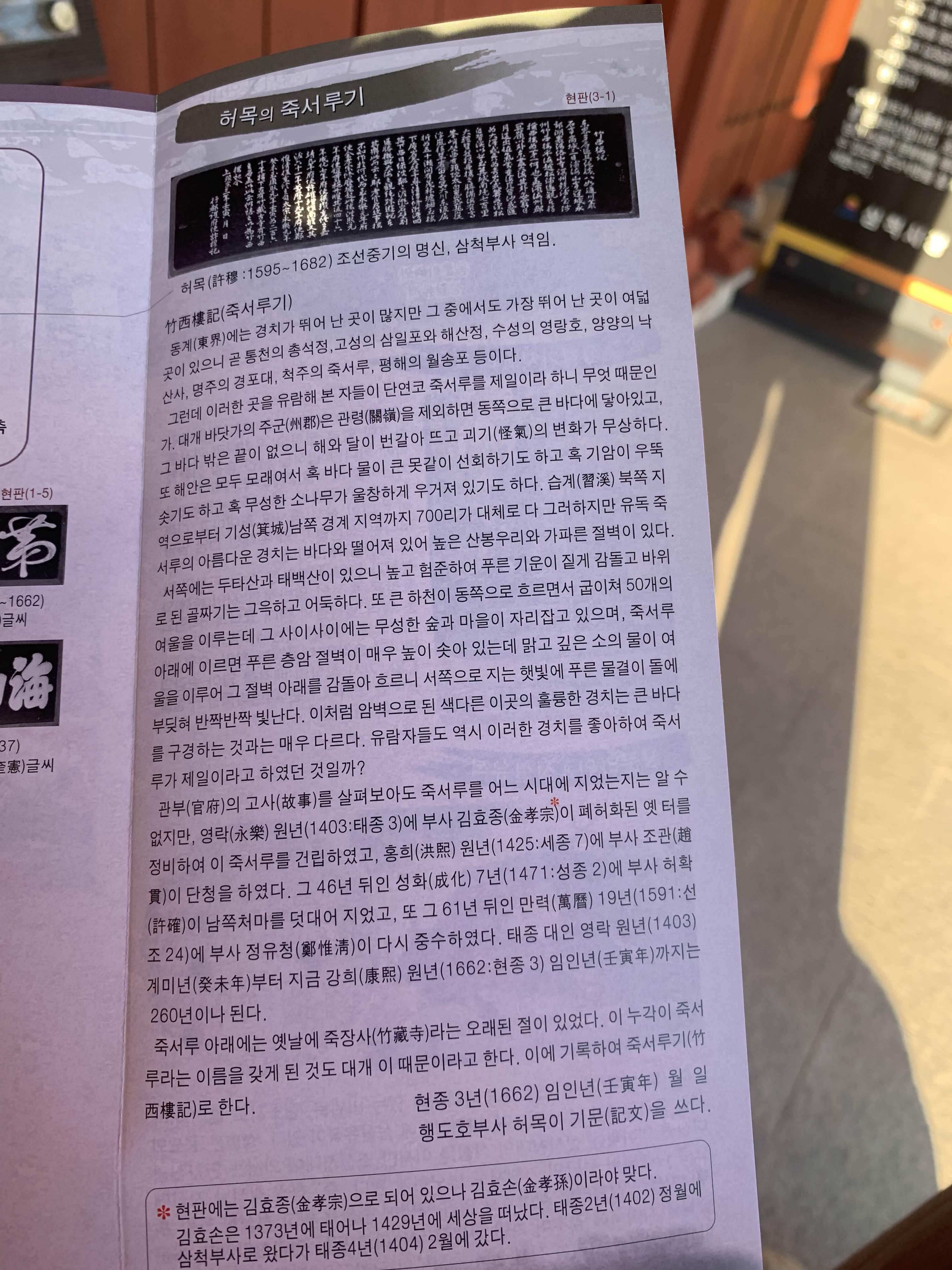 입구에 준비된 관광안내 책자를 읽으며 기다렸다. 9시가 정각에 죽서루 정문이 오픈되었다.