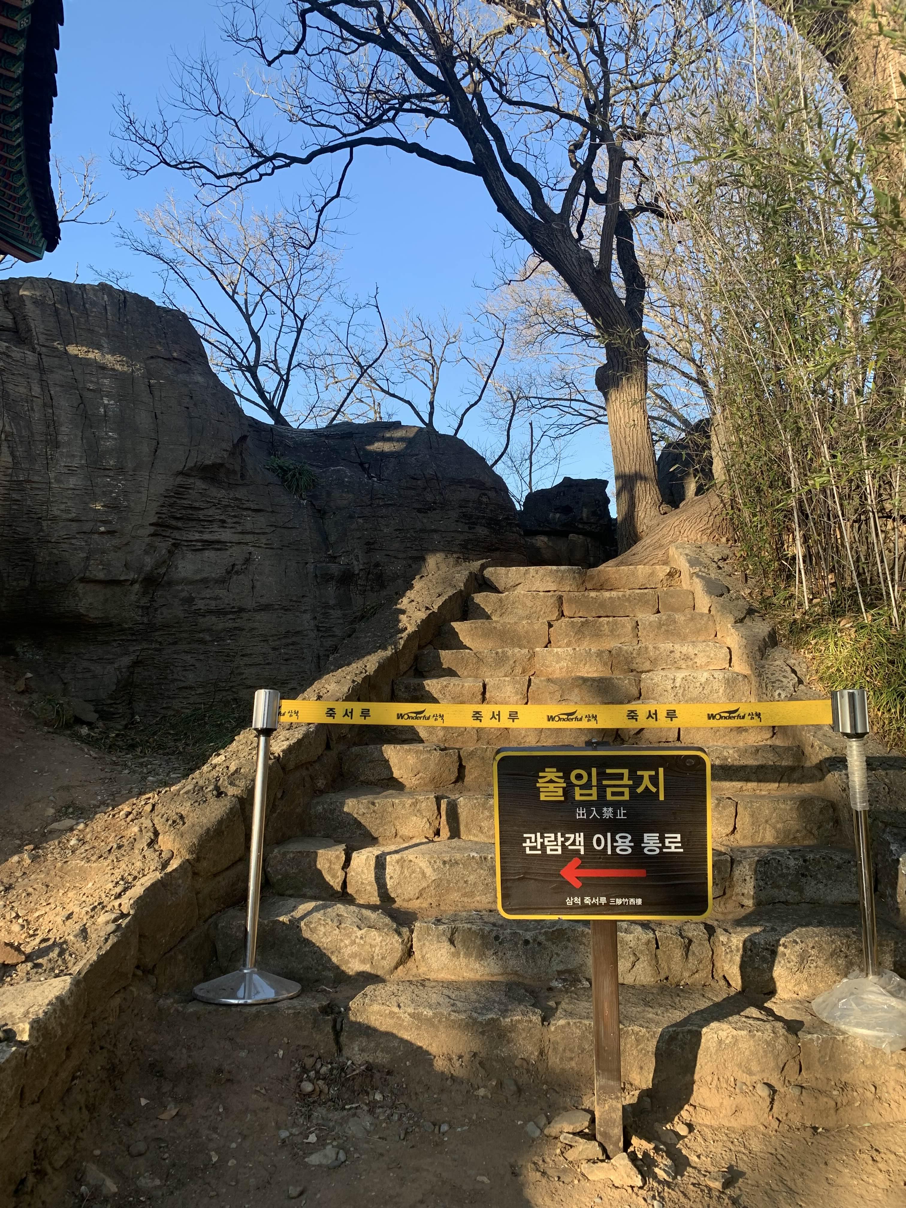 죽서루 오른쪽 입구에는 출입금지 안내문이 보였다. 왼쪽의 위 출입문으로 죽서루 안쪽으로 들어갈 수 있다.