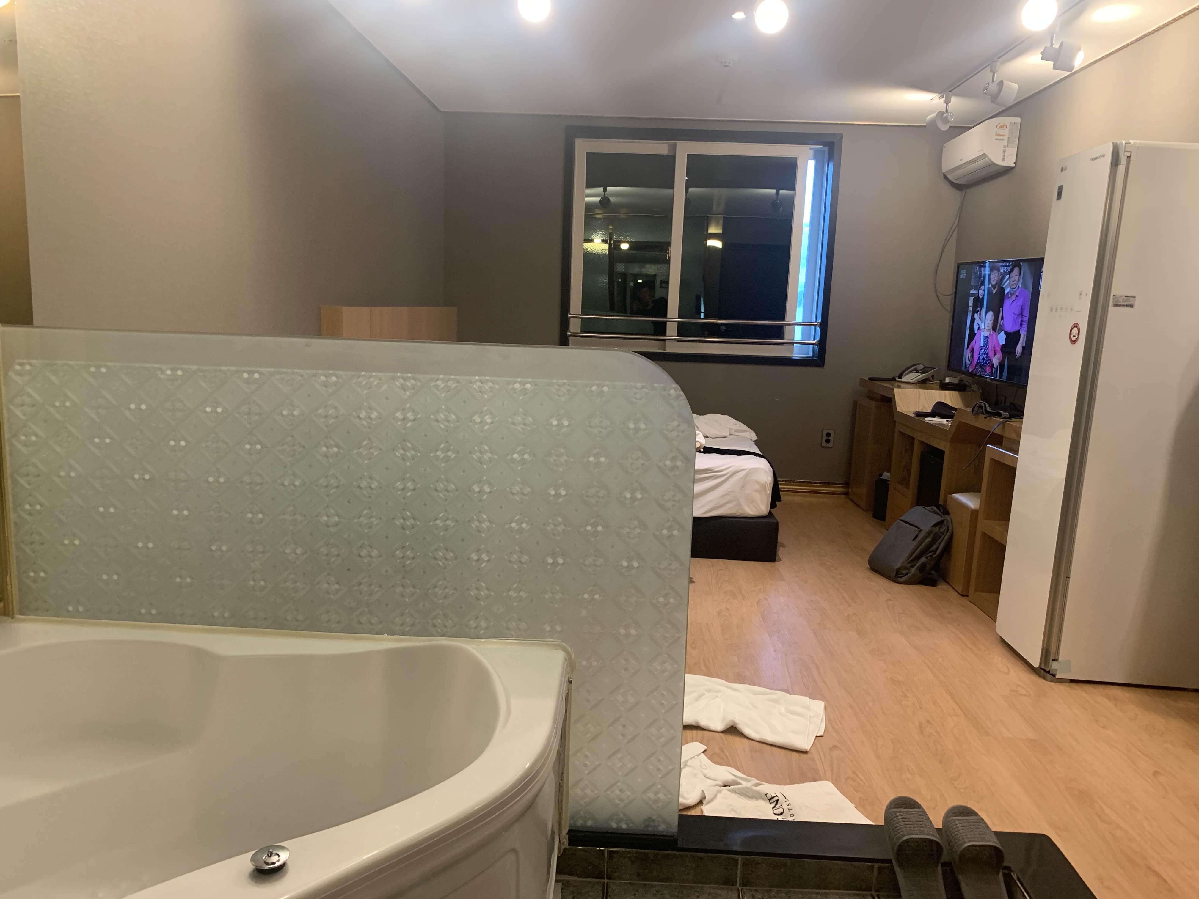 화장실 욕조가... 오픈형이었습니다. 욕조에 물을 받아서.....