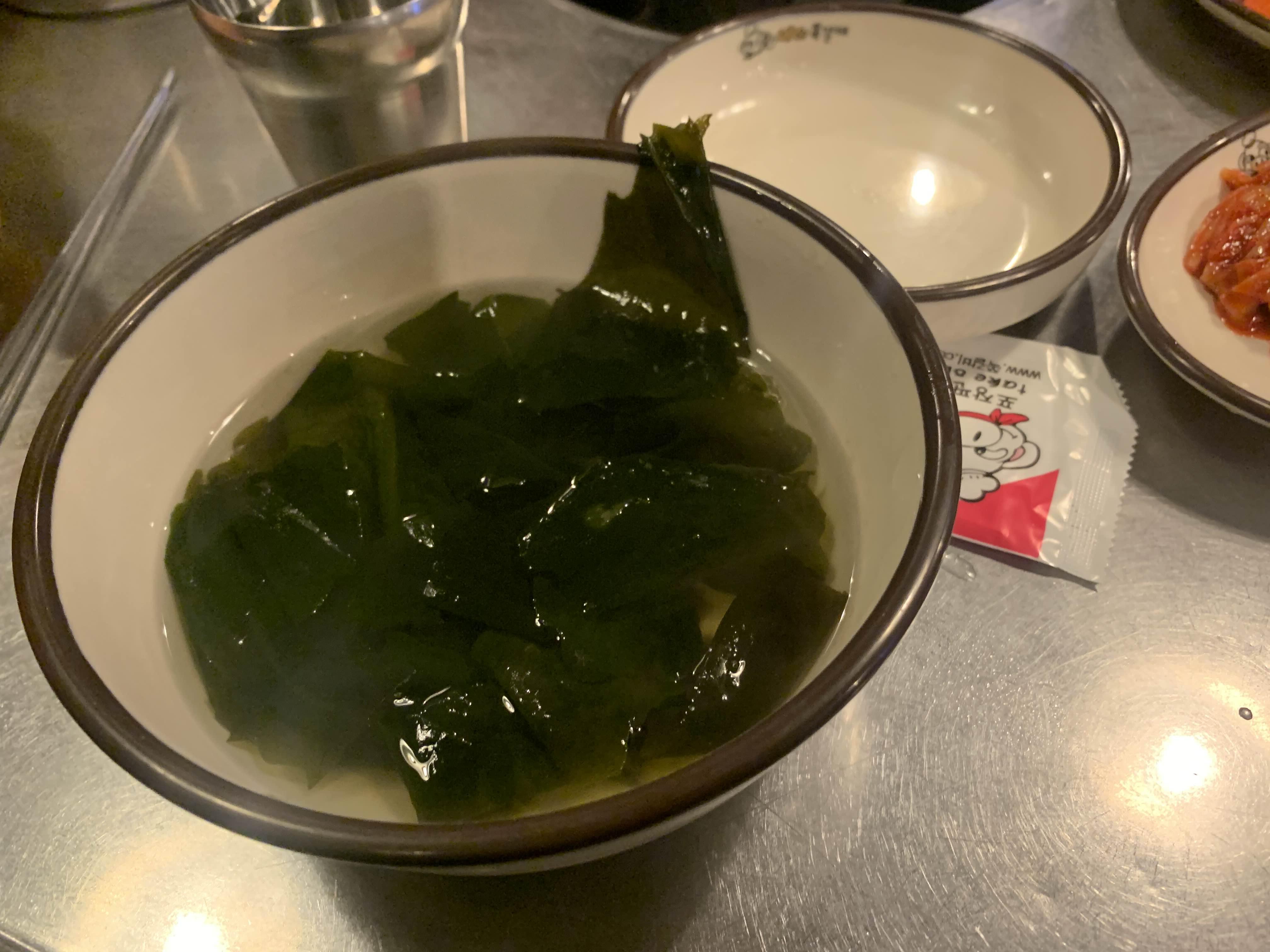 주문하고 얼마 되지 않아 밑반찬이 나온다. 밑반찬으로 무절임, 콩나물무침, 오이/당근과 미역국!! 술 마시는 식당은 요!! 국물이 있어야 좋은데... 여기는 기본 미역국이 나오니, 술 마시는 최적의 장소인 거 같다.ㅎㅎ