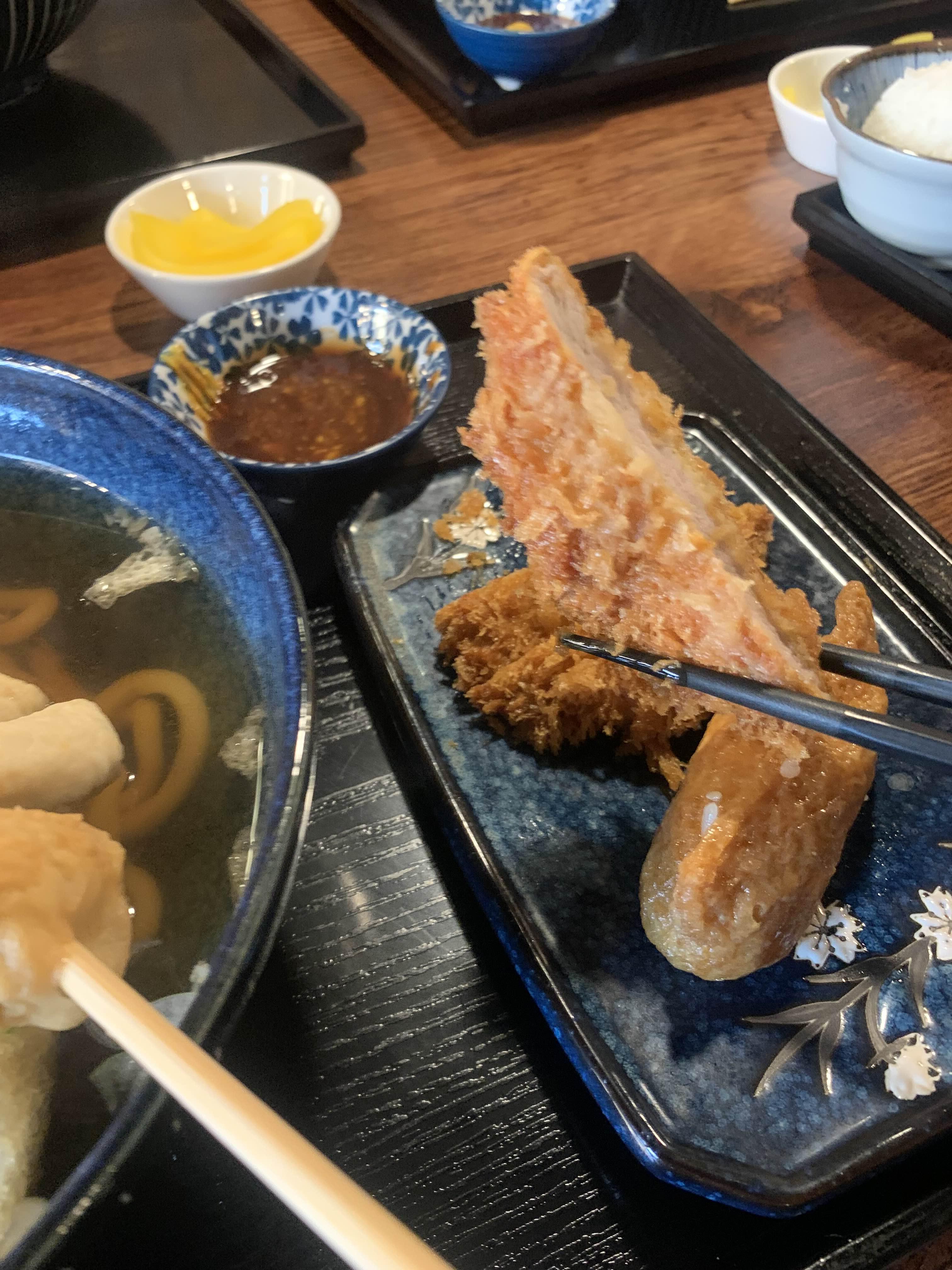 우동을 주문하고 잠시!! 어묵우동 세트가 나왔습니다. 어묵우동과 돈가스 그리고 유부초밥 하나가 나왔습니다. 점심식사 한 끼로.... 나에게는 약간 부족한 양이었습니다. 그래도.... 배는 채워야 하니.... 국물을 많이 마셔주었습니다. ㅜㅜ 돈가스는..... 기존 돈가스 전문점을 고려하여 맛을 보았는데.... 나름 나쁘지 않더군요.