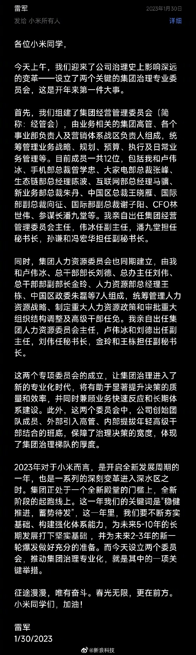 Sina Technology News 1월 30일 오후 Lei Jun은 Xiaomi가 운영 관리 위원회와 인사 위원회라는 두 개의 그룹 관리 전문 위원회를 구성했다고 알리는 내부 서신을 발표했습니다.