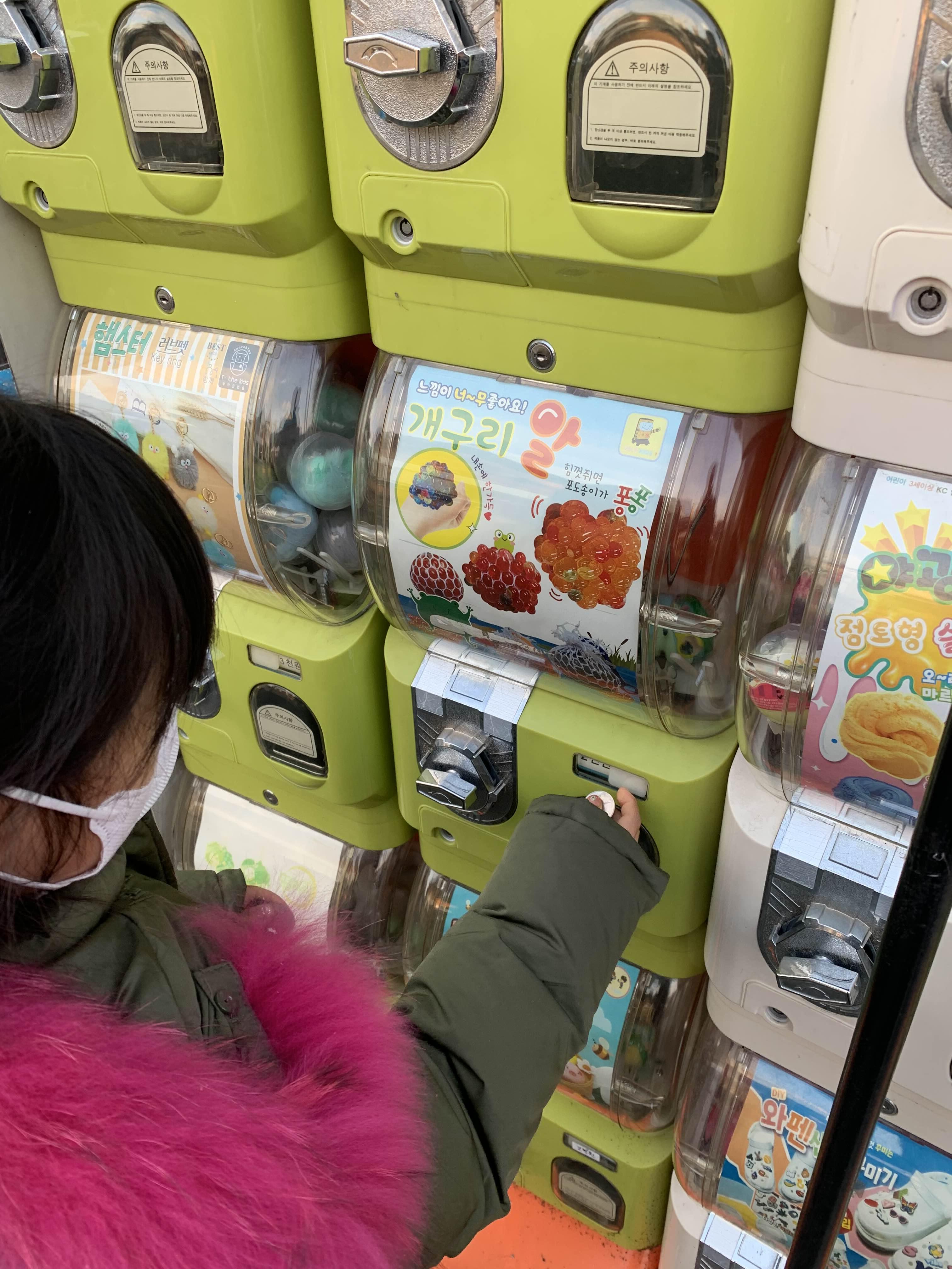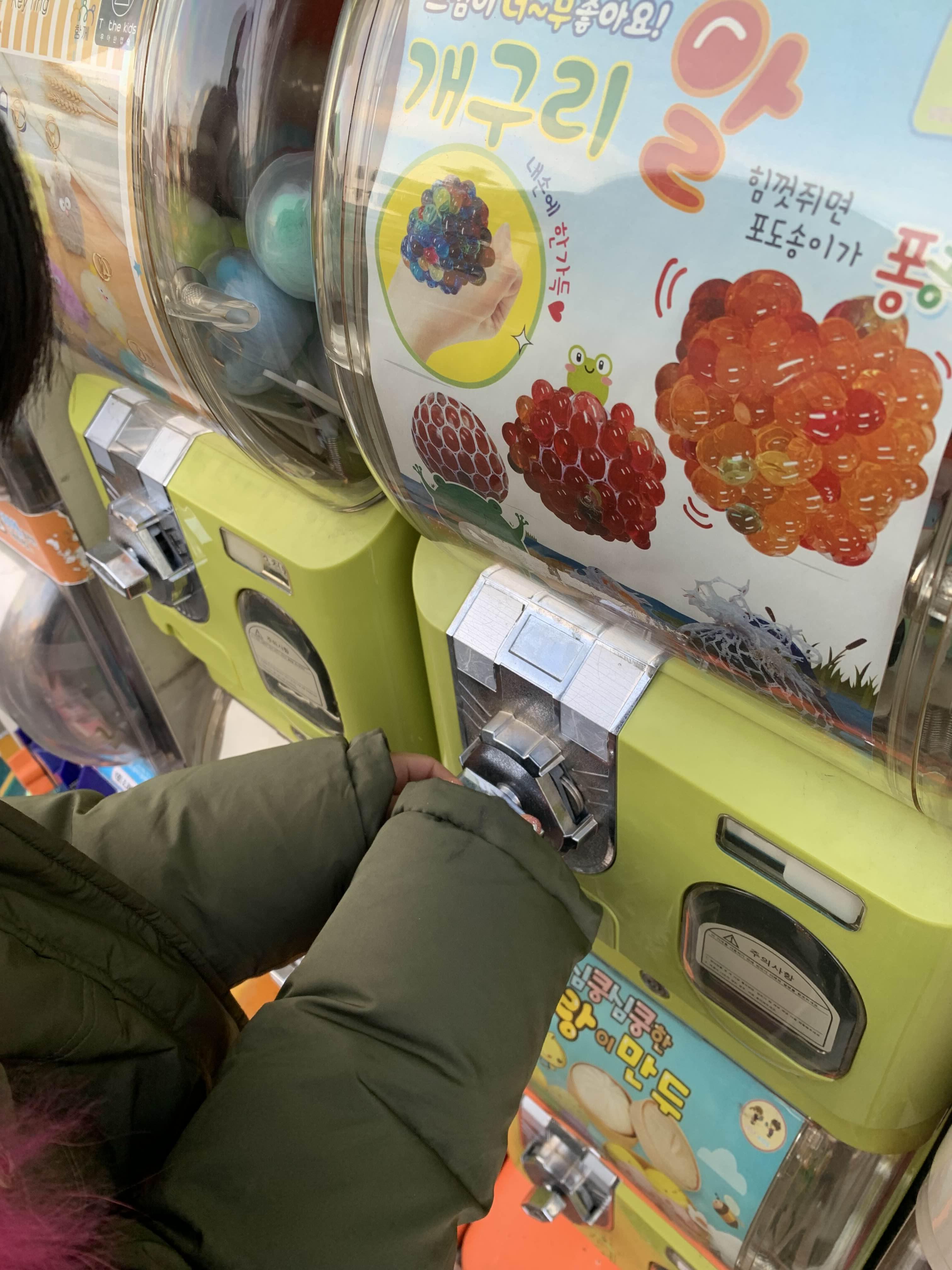 아이는 개구리알.... 뽑기 게임기에 눈이 꼽혀 있었다. 바로 동전 4개를 넣어주고... 뽑기 기계를 돌려본다.