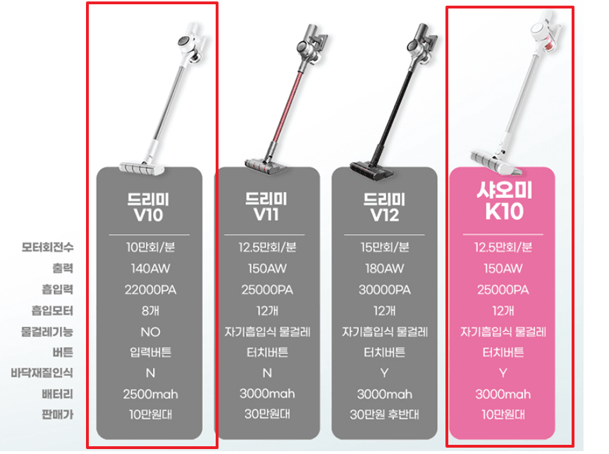 기존 드리미 제품과 아주 유사한 제품의 샤오미 제품이다. 아무래도 기술이나 품질관리를 샤오미가 담당하다 보니 제품이 유사하다. 이번에 구매한 샤오미 K10 제품은 드리미 V10 제품과 큰 차이는 액정이 표시된다는 점(배터리 용량이 0~100으로 숫자로 표시되고, 한번 버튼 클릭하여 연속 작동 : 기존에는 버튼을 계속 누르고 있어야 작동)이 가장 큰 차이점이었다.