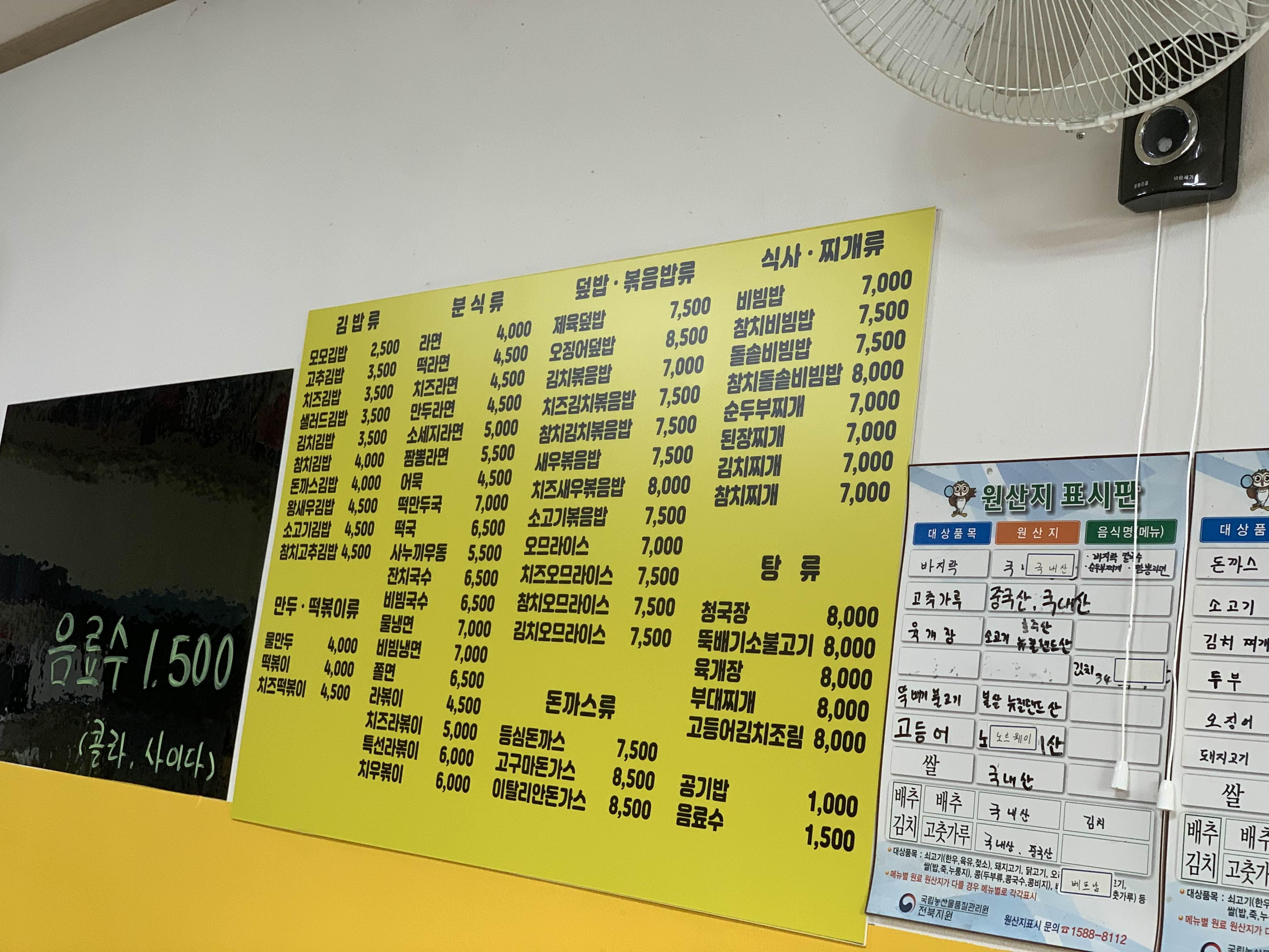 김밥은 사전에 포장 주문하였다. 기본 김밥인 모모김밥 2,500원, 치즈 김밥 3,500원 그리고 샐러드 김밥 3,500원으로 하나씩 주문했다. 메뉴판을 스캔하니.... 상당히 많은 메뉴가 즐비했다. 메뉴판을 보면... 꼭 김밥천국을 연상케 하는 메뉴판이었다.