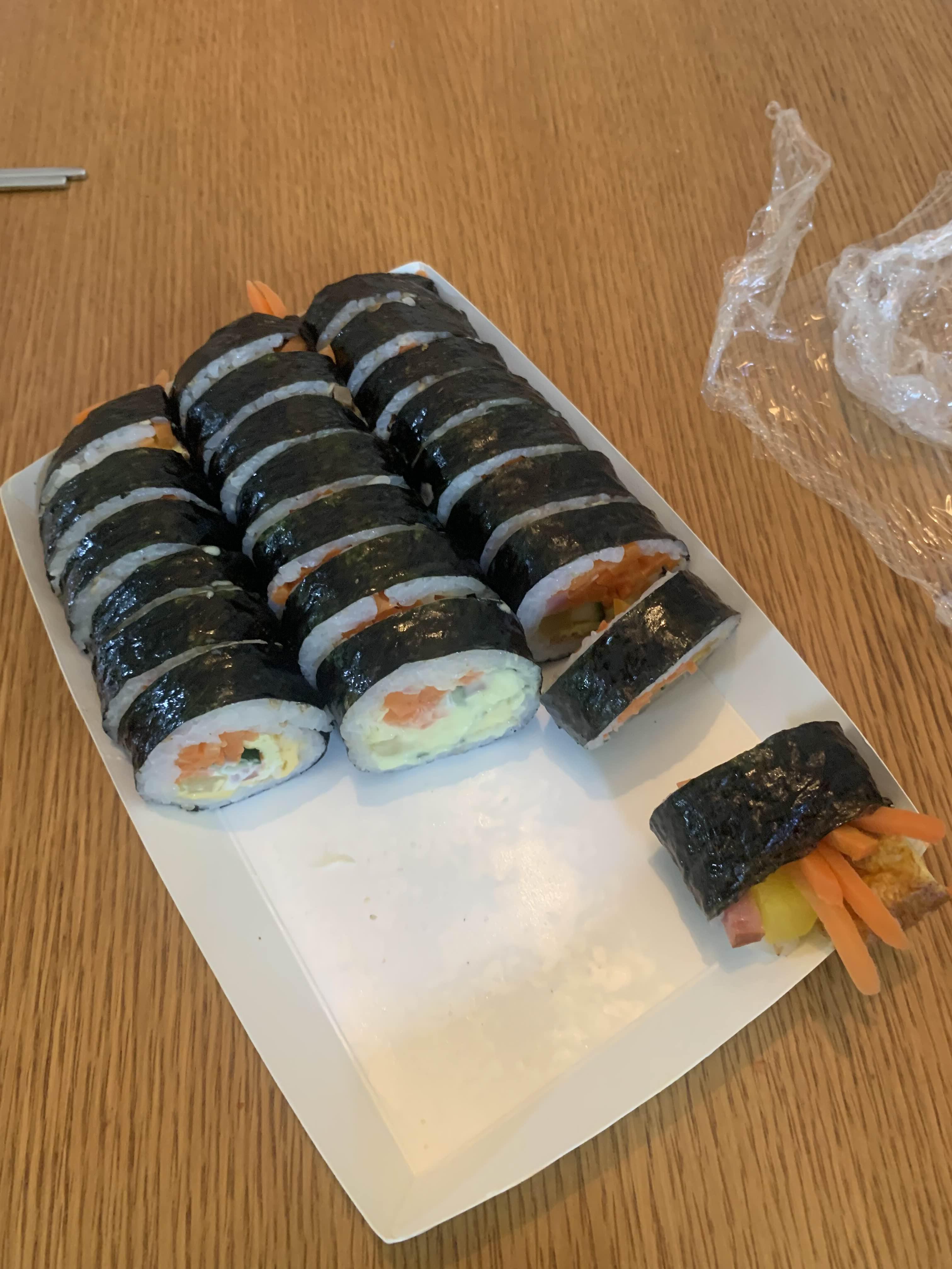 평소 아이들이 즐겨 사 먹는다는 김밥을 포장해 보았다.