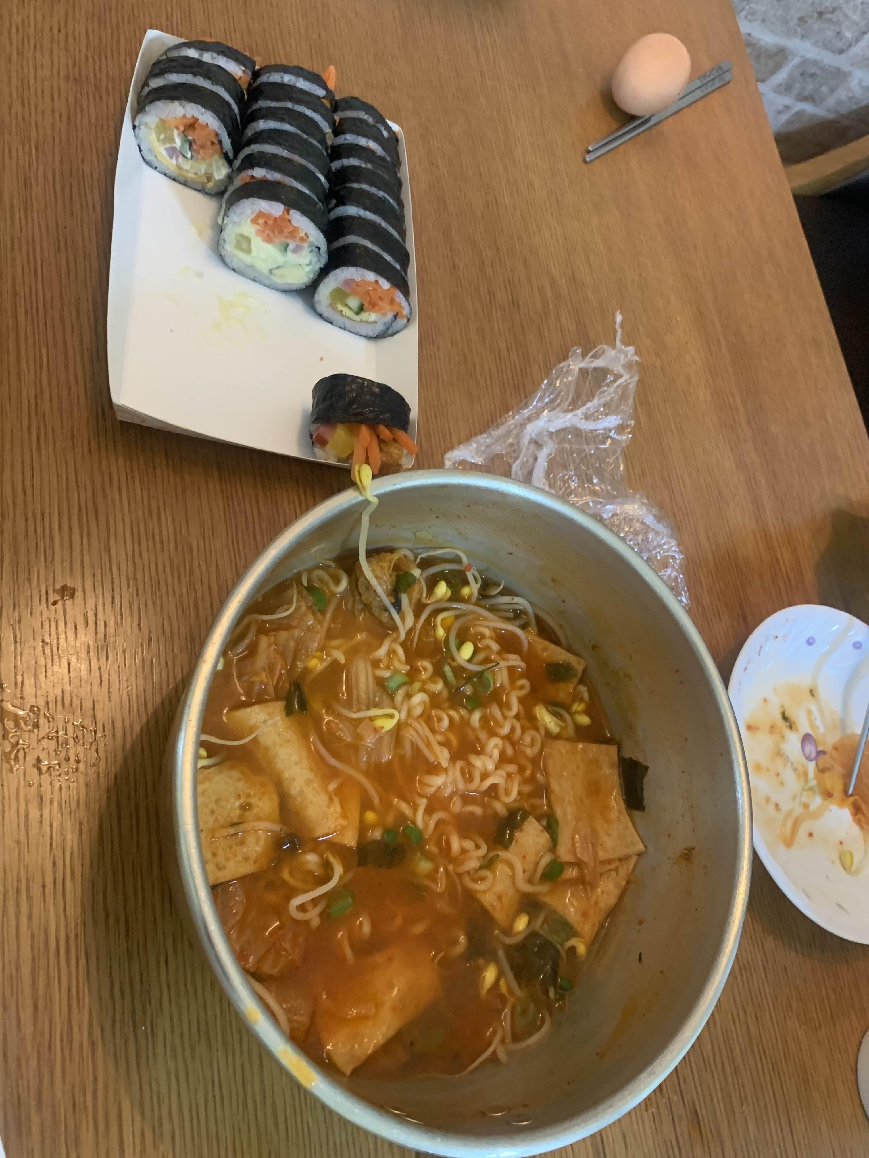 김밥을 포장하고... 집에서 라면을 끓여 보았다. 콩나물과 어묵 그리고 김치를 이용한 라면!!! 김밥 중 치즈 김밥은 아이가 가장 좋아하는 김밥.... 모모 기본 김밥도 꽤 맛이 괜찮았다.
