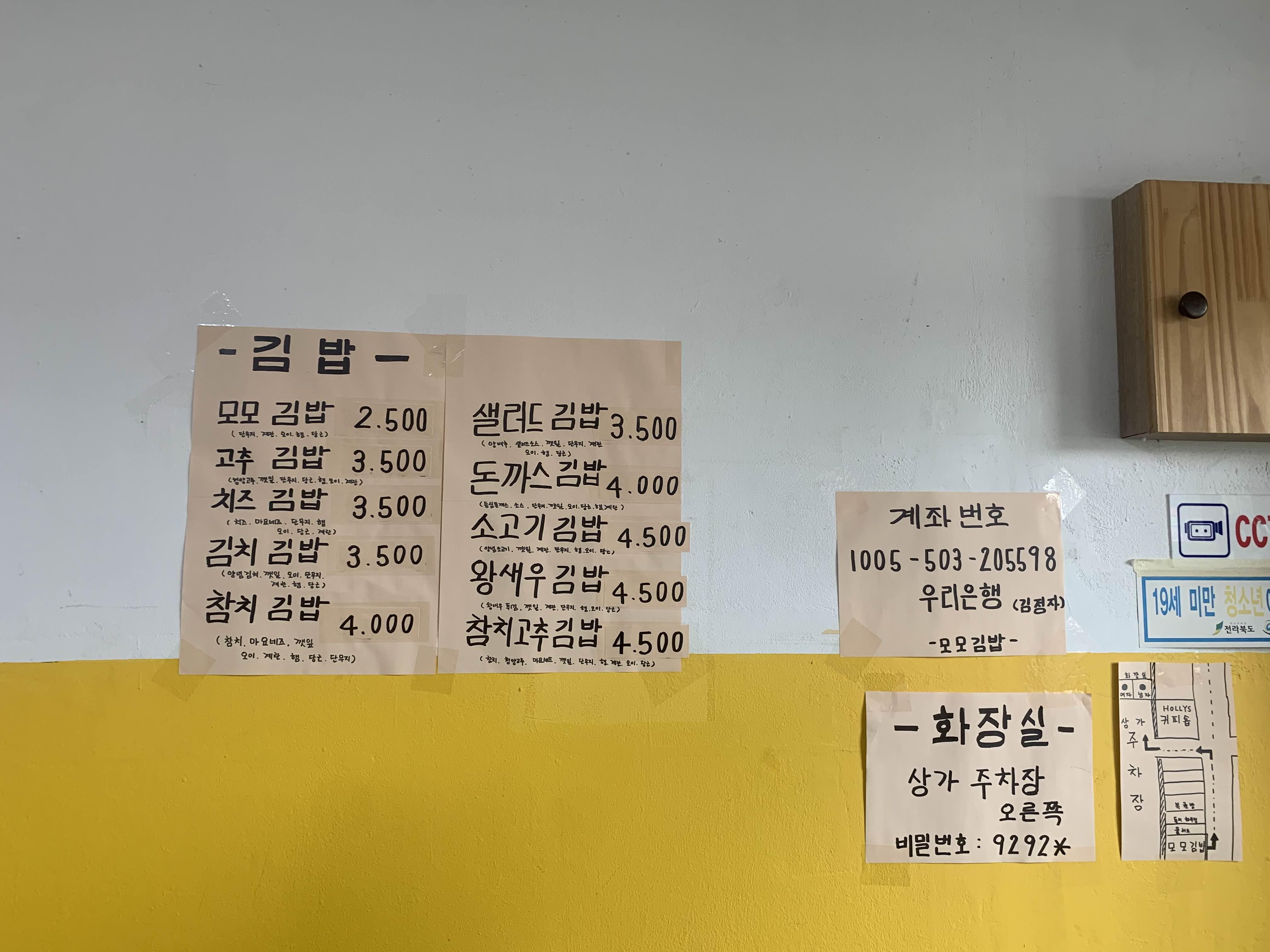 김밥은 사전에 포장 주문하였다. 기본 김밥인 모모김밥 2,500원, 치즈 김밥 3,500원 그리고 샐러드 김밥 3,500원으로 하나씩 주문했다. 메뉴판을 스캔하니.... 상당히 많은 메뉴가 즐비했다. 메뉴판을 보면... 꼭 김밥천국을 연상케 하는 메뉴판이었다.