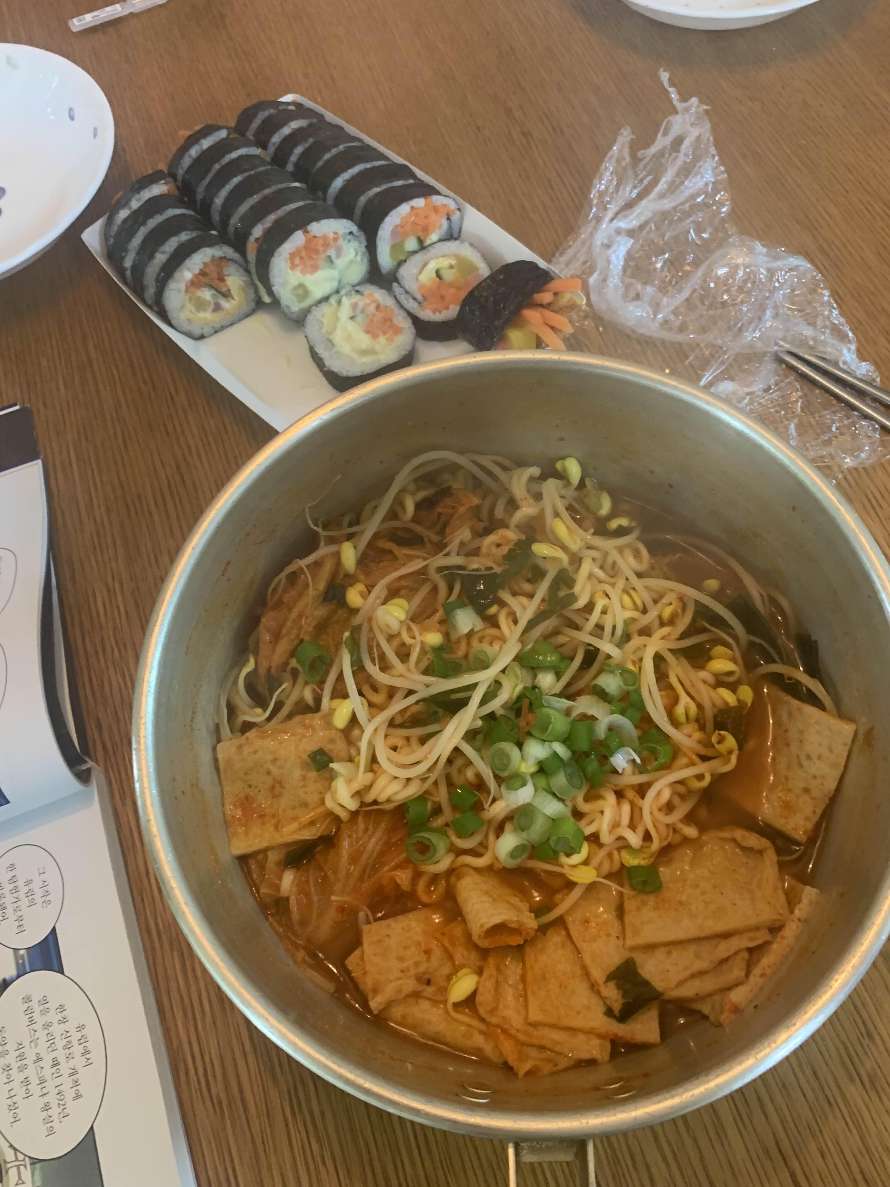 김밥을 포장하고... 집에서 라면을 끓여 보았다. 콩나물과 어묵 그리고 김치를 이용한 라면!!! 김밥 중 치즈 김밥은 아이가 가장 좋아하는 김밥.... 모모 기본 김밥도 꽤 맛이 괜찮았다.
