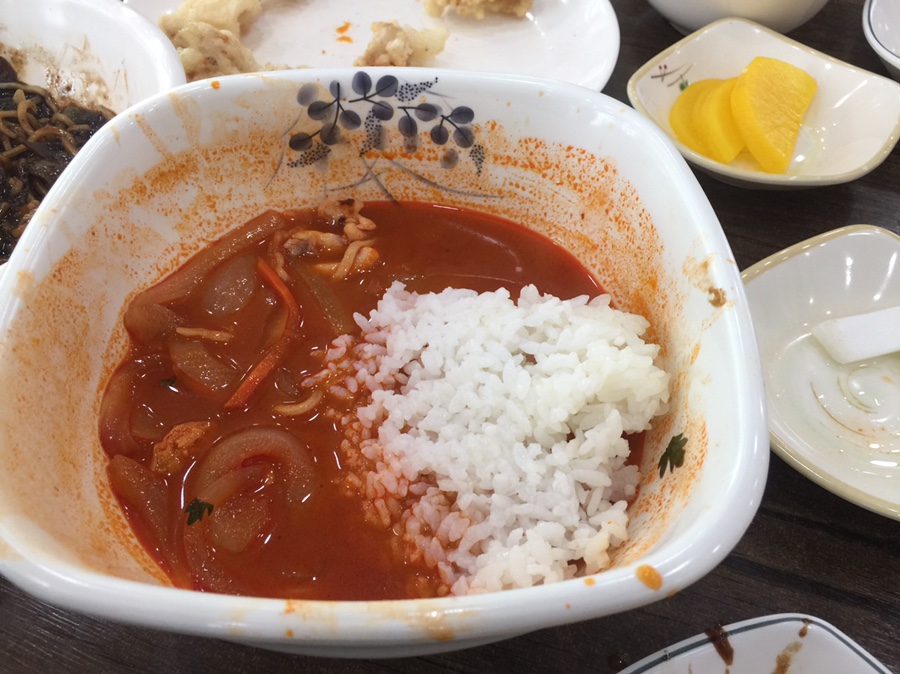짬뽕 국물이 별로라고 와이프에게 이야기하고선.... 공깃밥을 시켜? 아 참!! 여기는 공깃밥이 셀프 코너에 있어서 가져다 먹을 수 있네요. 그래서 공깃밥을 가져다가 짬뽕 국물에 말아서 먹으니 맛있네요.