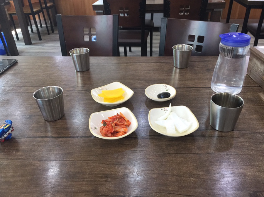 일단 가격은 그렇게 비싸지는 않아요. 탕수육 9,900원, 짜장 4,000원, 짬뽕 6,000원... 그래서 3개 모두 주문하니 19,900원이네요.ㅎㅎ 주문하기 잠시 기다리면 단무지, 김치, 양파와 춘장이 나오네요. 셀프 코너에 추가로 더 가져다 먹게 준비되어 있네요.