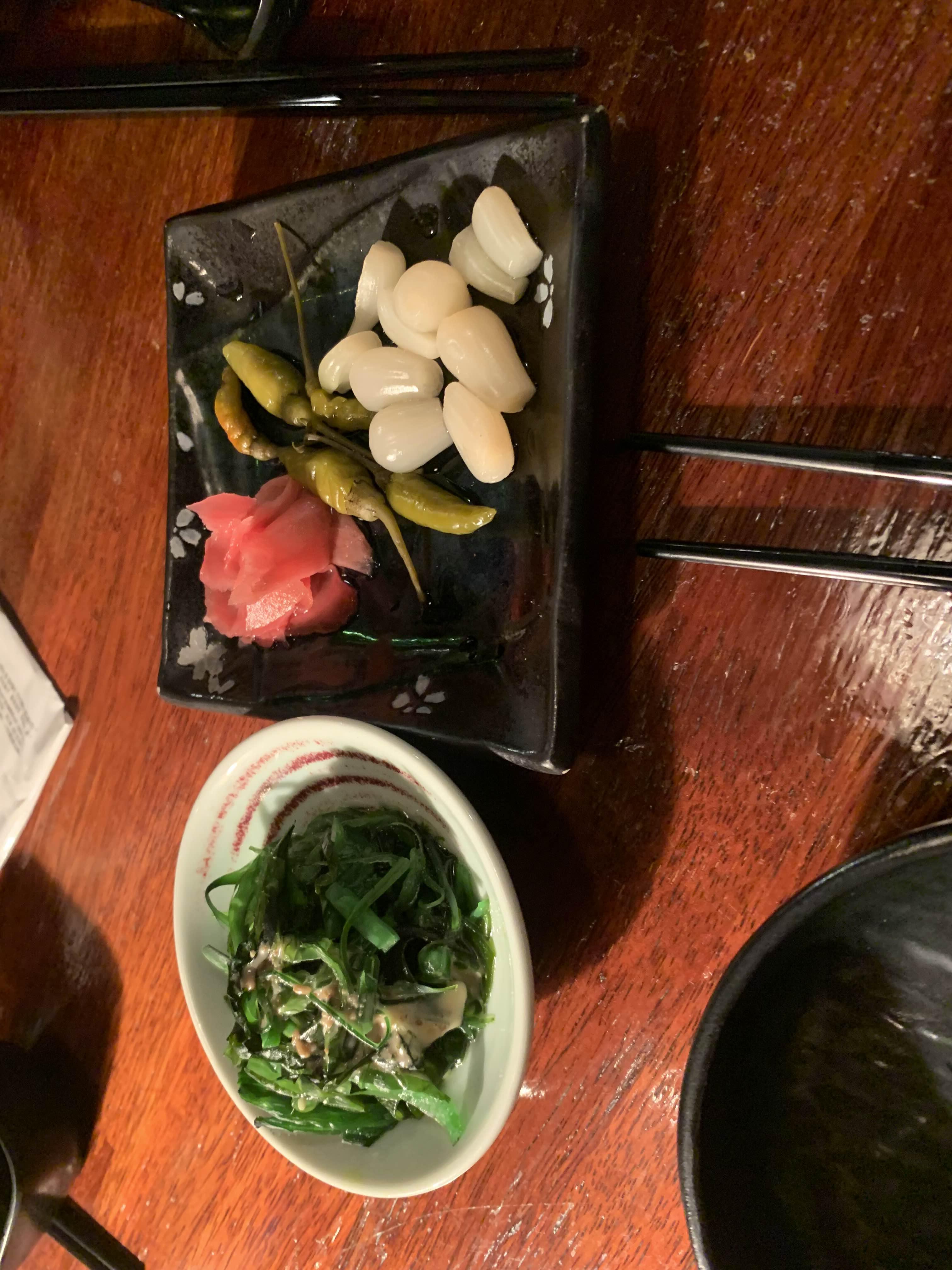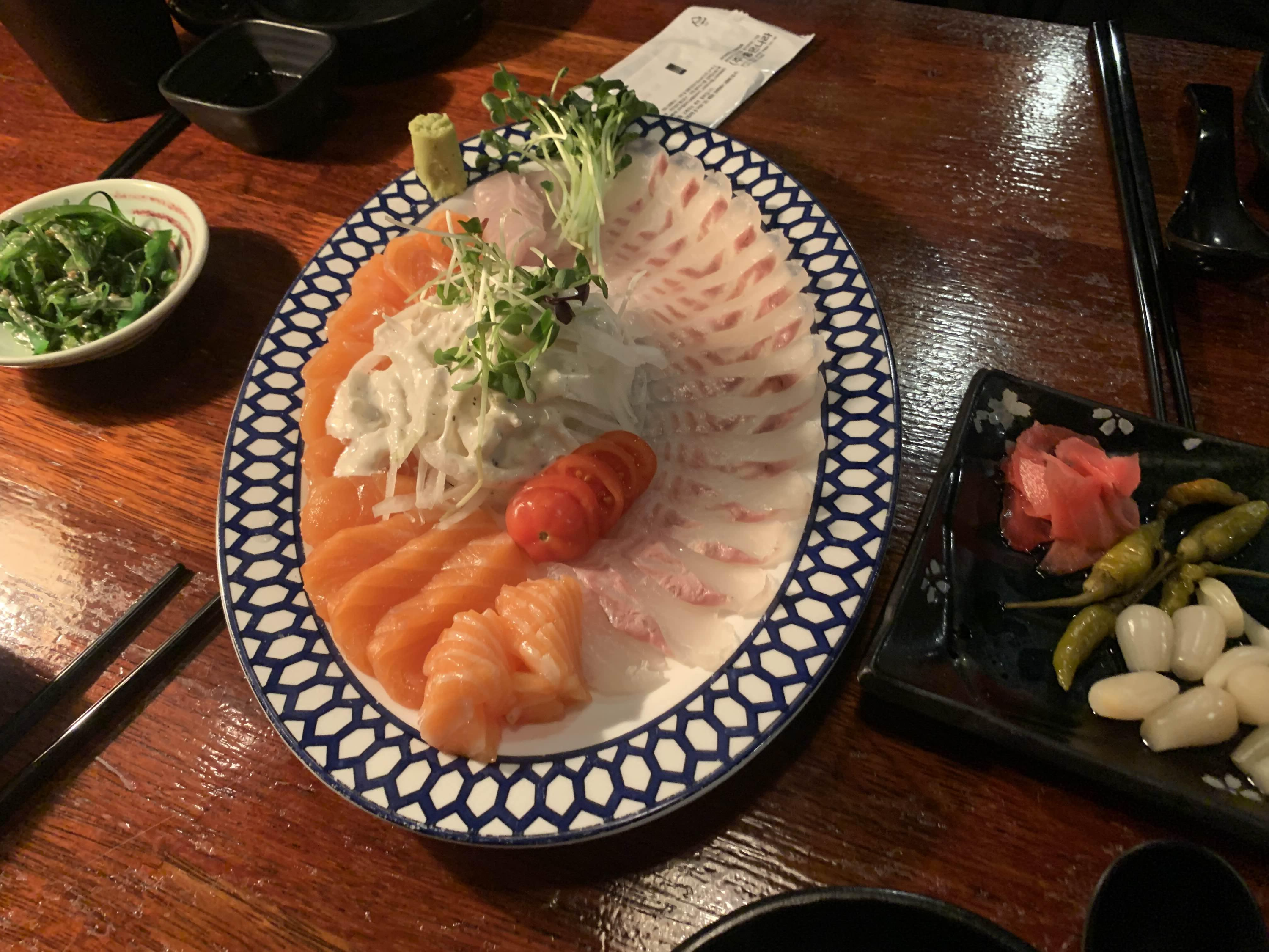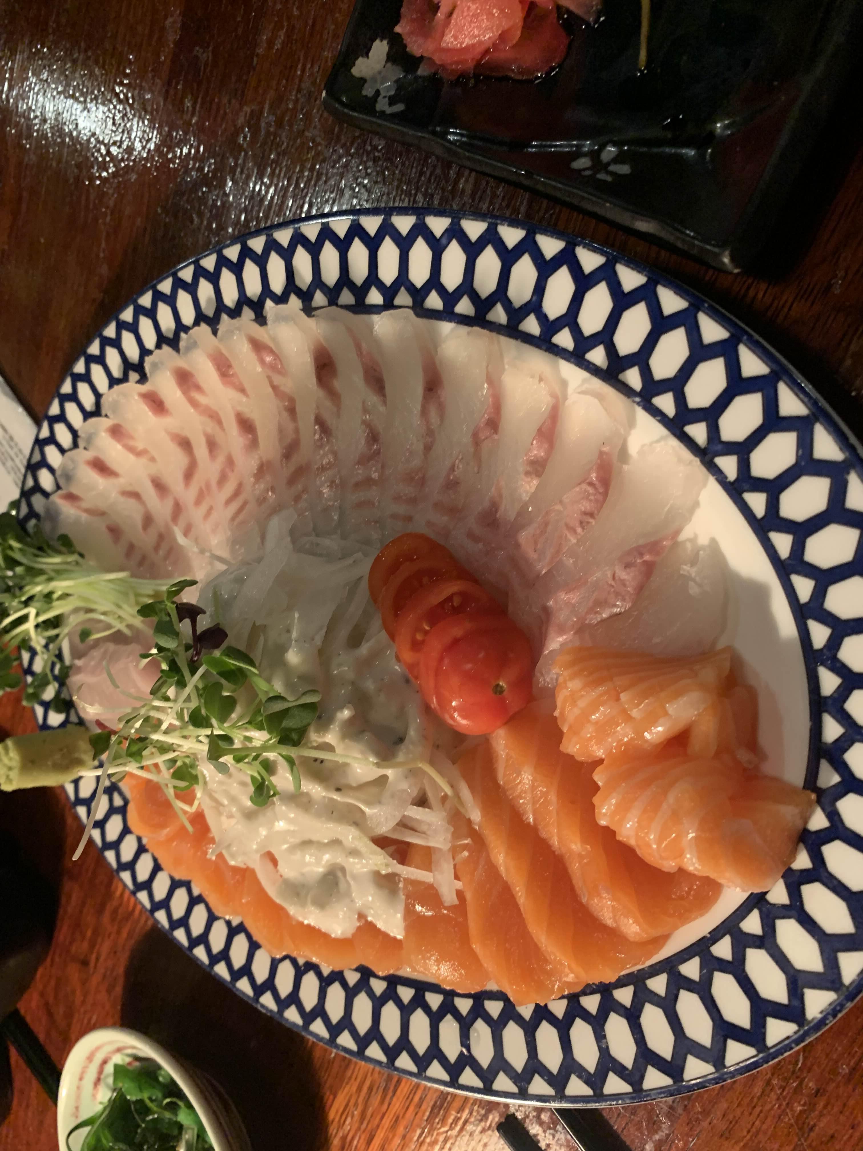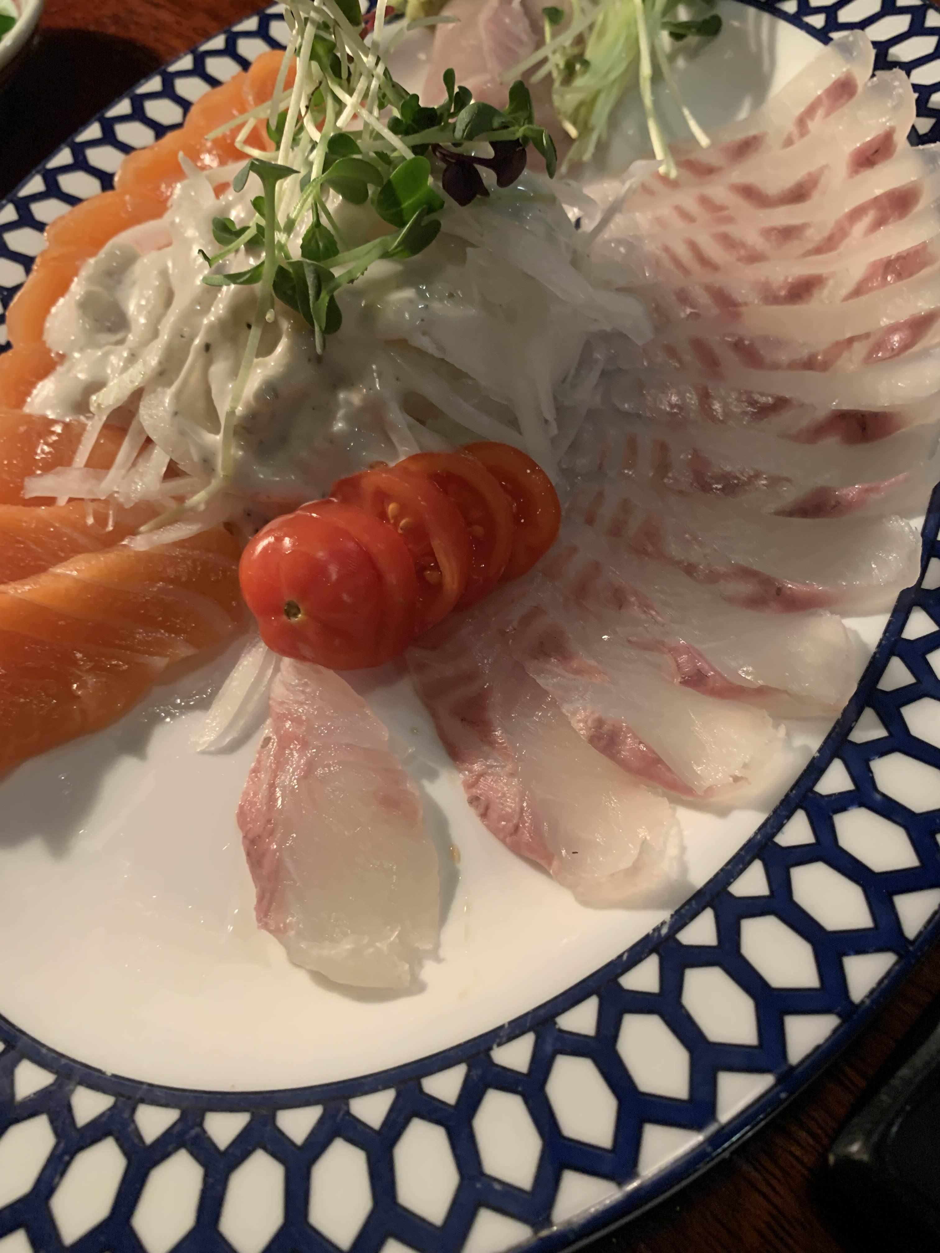 광어+연어 사시미가 먼저 나왔다. 이쁜 일본에서나 볼법한 모양의 접시에 주문한 광어와 연어가 담아져 있다. 그리고 그 위.... 양파 위 소스가 뿌려지고... 그 위 새삭이 올려져 있었다.