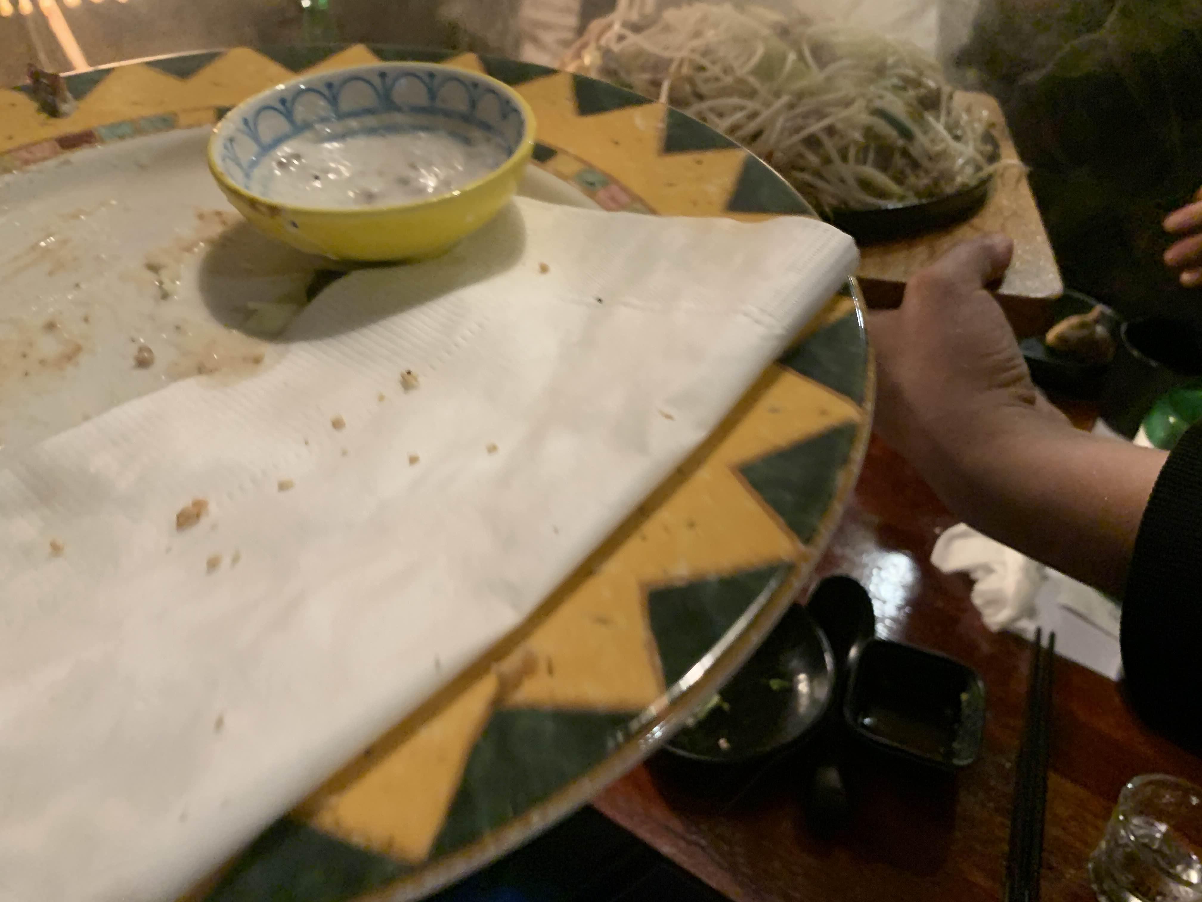 얼큰 해물 짬뽕탕 19,000원 그리고 차돌박이 숙주볶음 17,000원으로 주문했다. 먼저 숙주 볶음이 나왔는데... 숙주의 아삭함과 차돌박이의 담백함이 꽤 괜찮았다. 그리고.... 이 안주를 다 먹어갈 때쯤!!! 음식 그릇 아래에 깔려있는 소스! 꽤 괜찮았다.