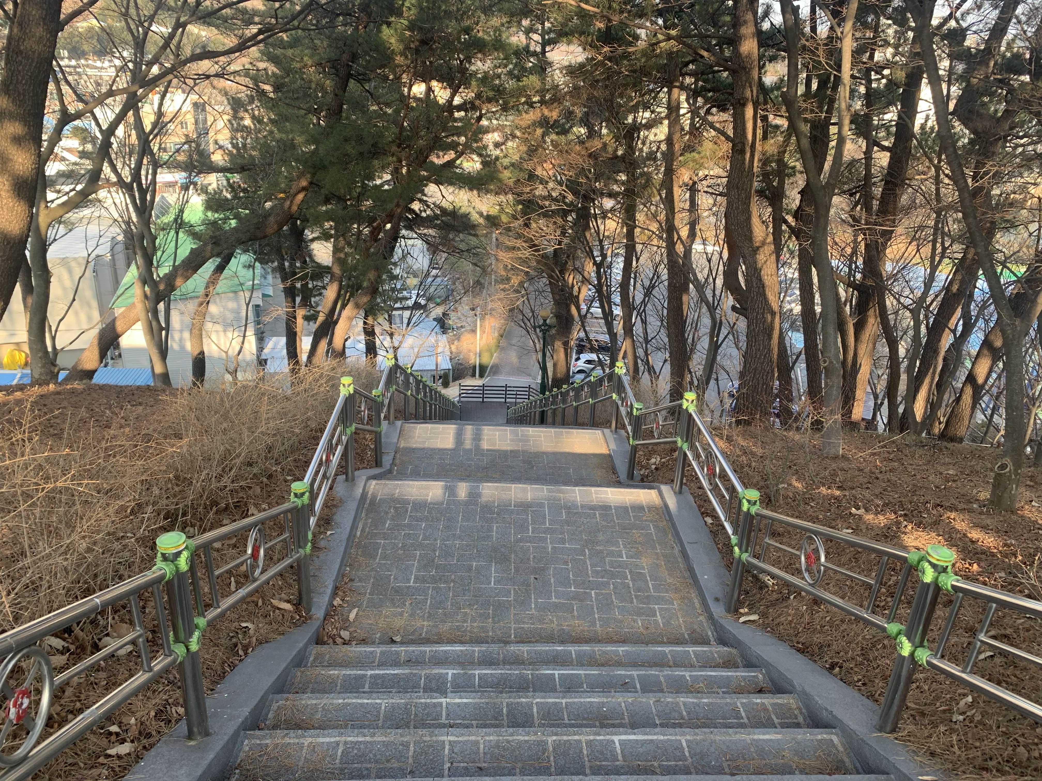 공원 주차장에 차량을 주차하여 계단을 이용하여 올라가는 길이 있고...