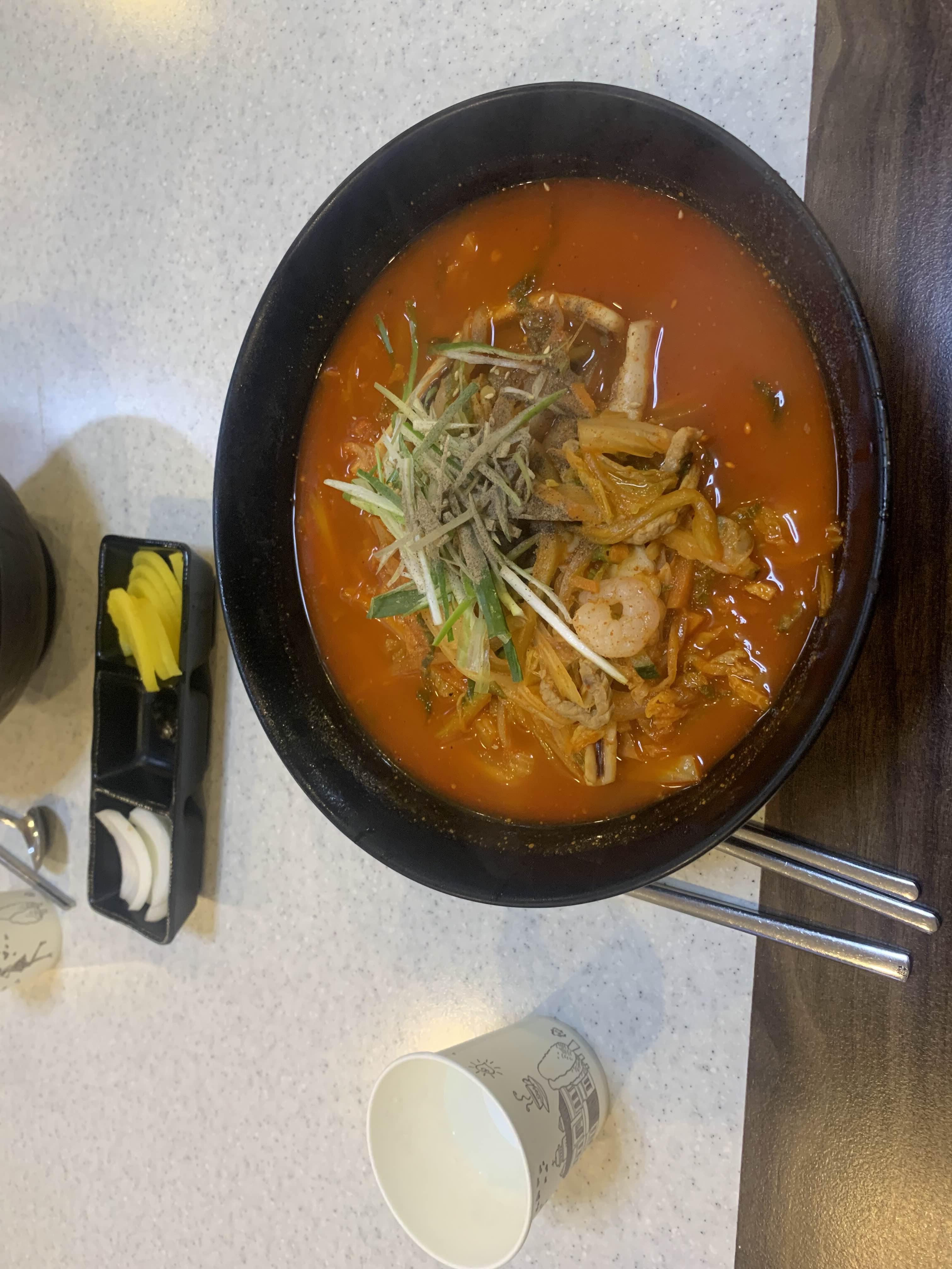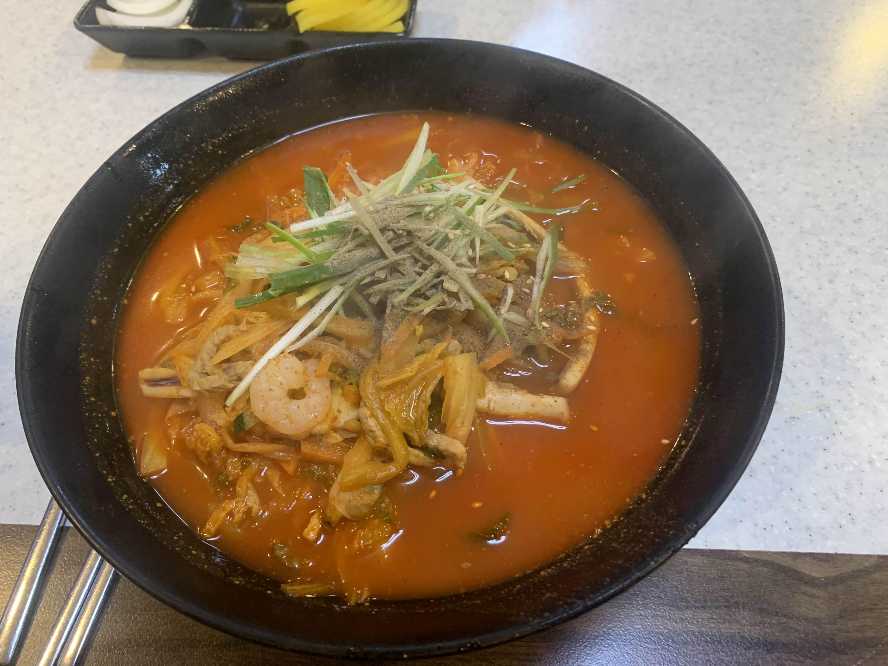 강원도 동해 중앙시장에 위치한 율짬뽕! 짬뽕 위 고명으로 올려진 생파채 그리고 후춧가루!