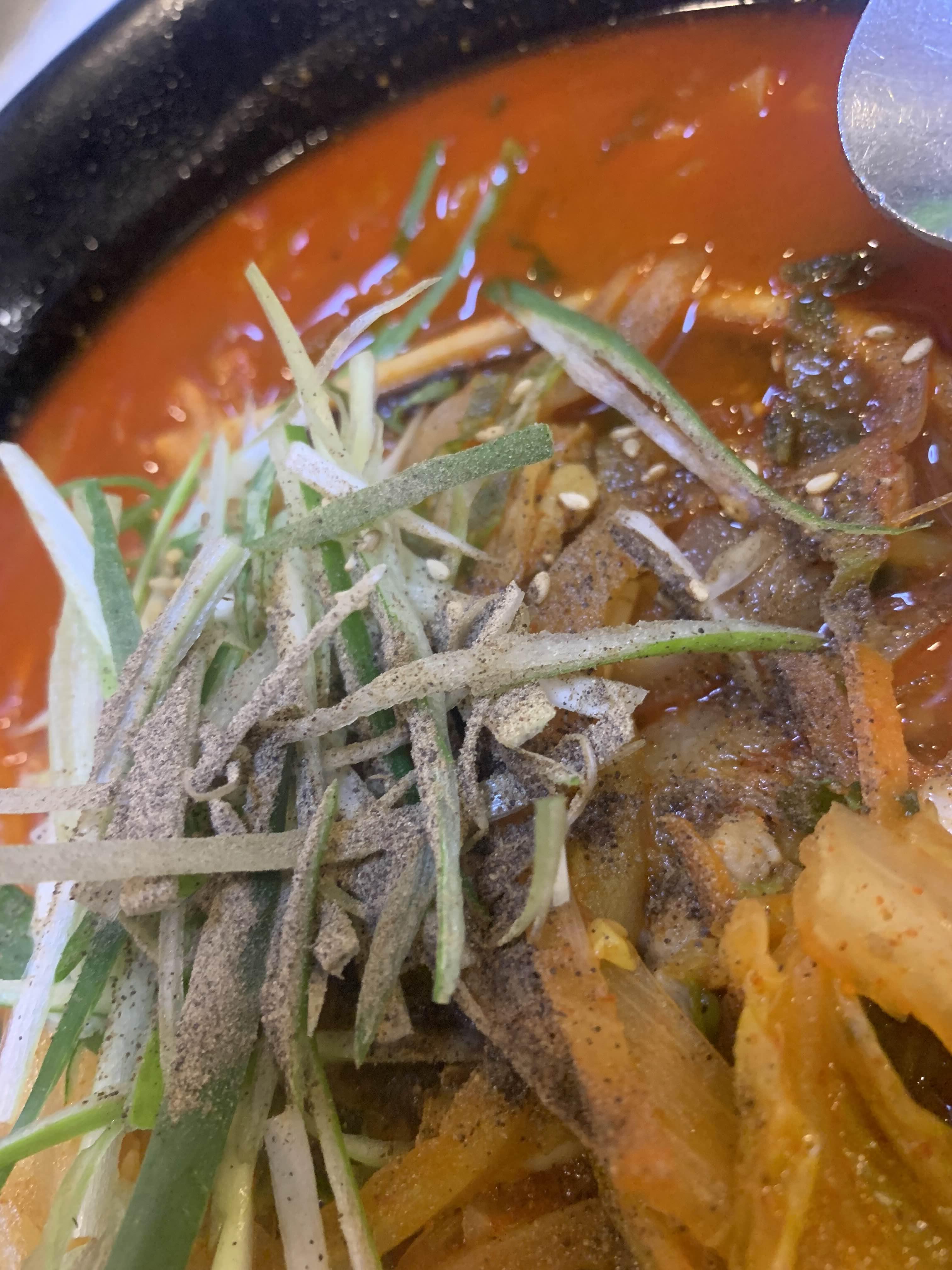 주문한 짬뽕이 나왔는데..... 짬뽕 위 생파채가 올려도 있고, 그 위 후추가 부러져 있더군요. ㅎㅎ 후추... 상당히 많은 양이 뿌려져 약간 당황했습니다. 후추를 싫어하지는 않지만, 이렇게 많이 뿌려진 짬뽕은 근래에 찾아보기 힘든 비주얼이었습니다.