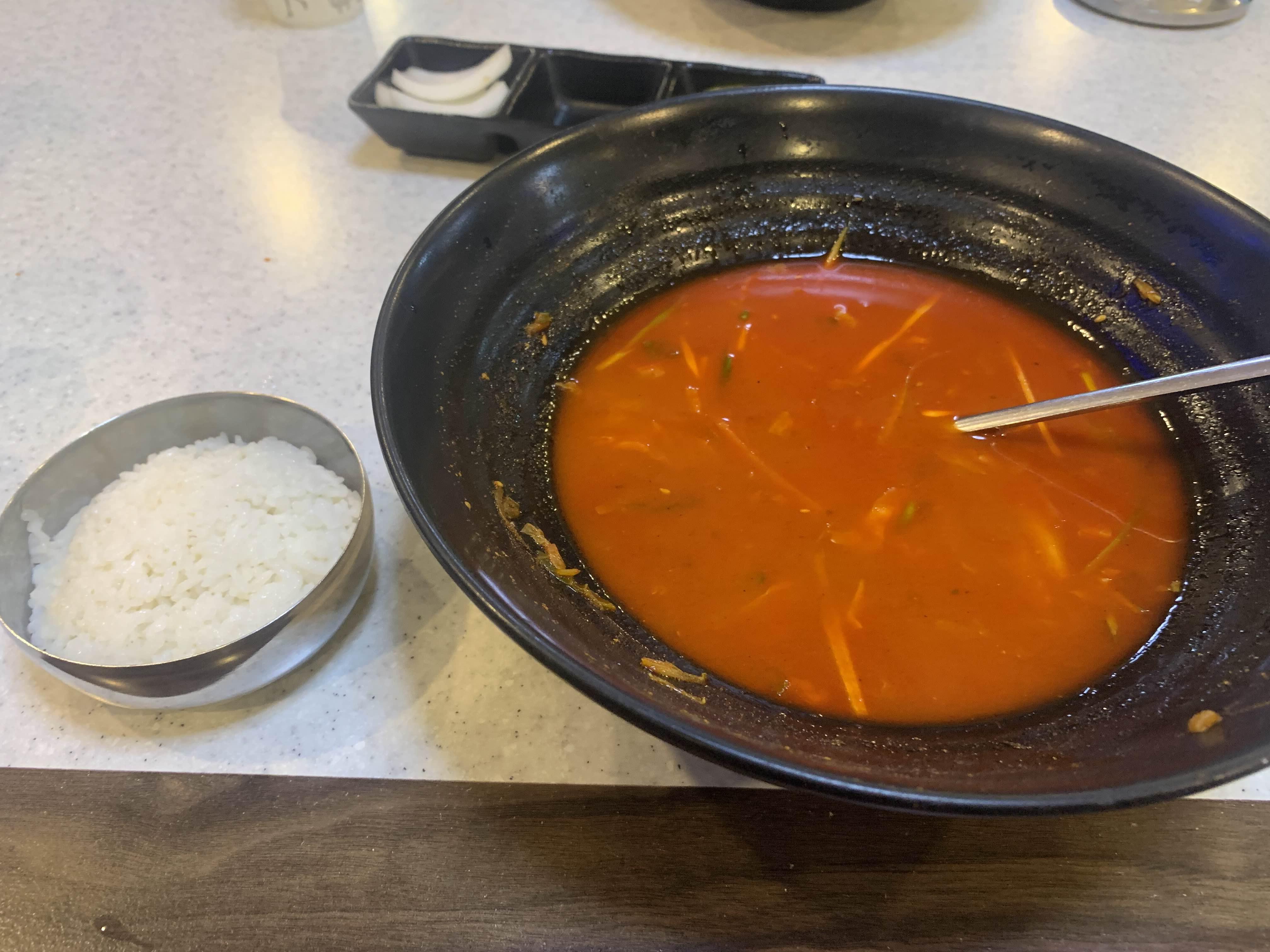 고기와 오징어가 넉넉히 들어가 있어서... 짬뽕을 먹는 내내 먹는 식감이 좋았습니다. 짬뽕 국물이 맛이 좋아, 공깃밥을 주문해 보았습니다. 공깃밥은...... 양이...... 반절도 안 되는 공깃밥이 나오더군요.