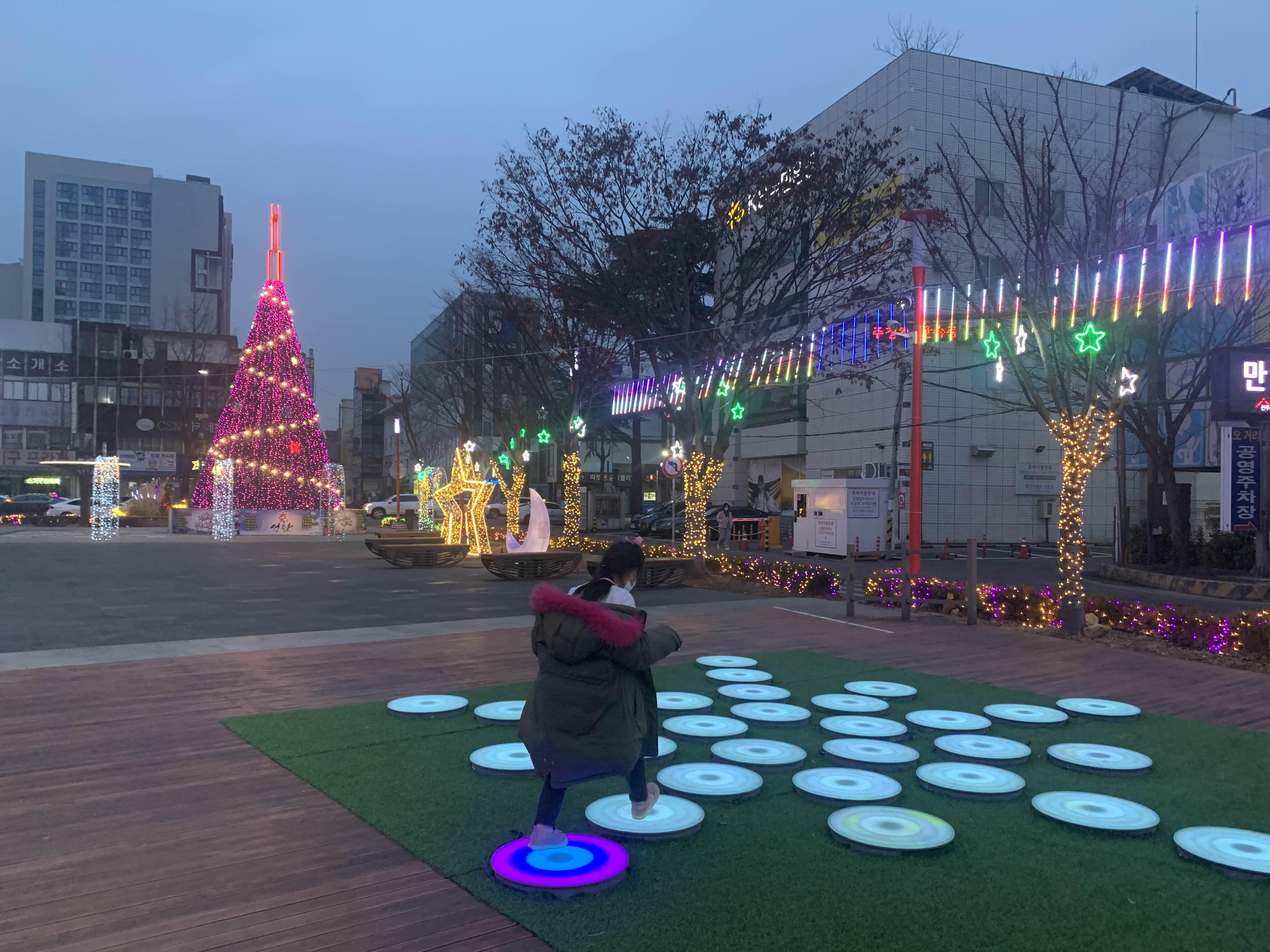 비보이 비석을 뒤로 아이들을 위한 조명발판이 마련되어 있다. 발판을 밝으면, 조명이 바뀐다.ㅎㅎ