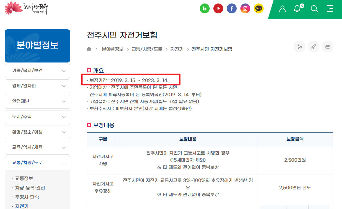 전주시청 > 분야별정보 > 교통/차량/도로 > 자전거 > 전주시민 자전거보험