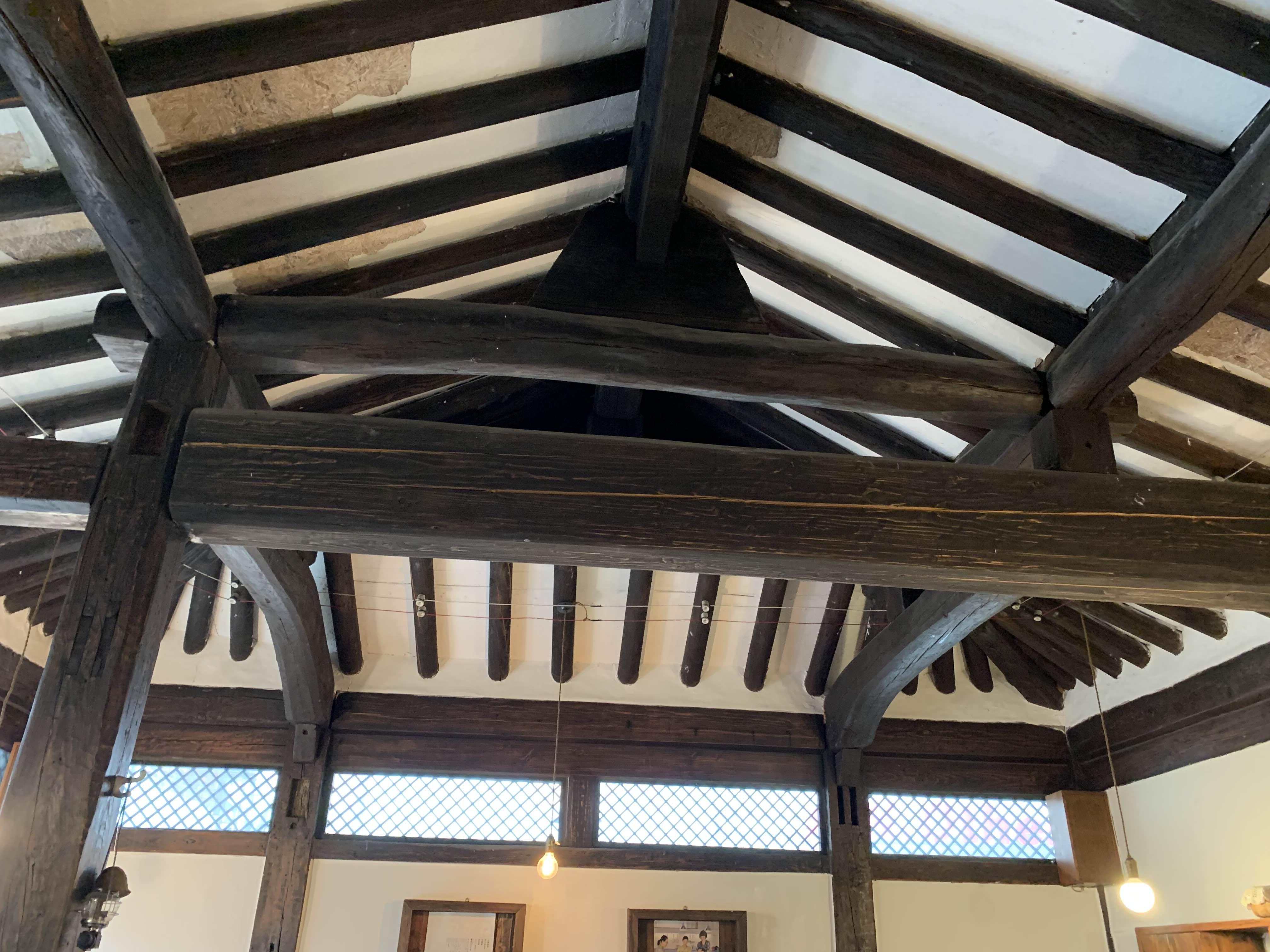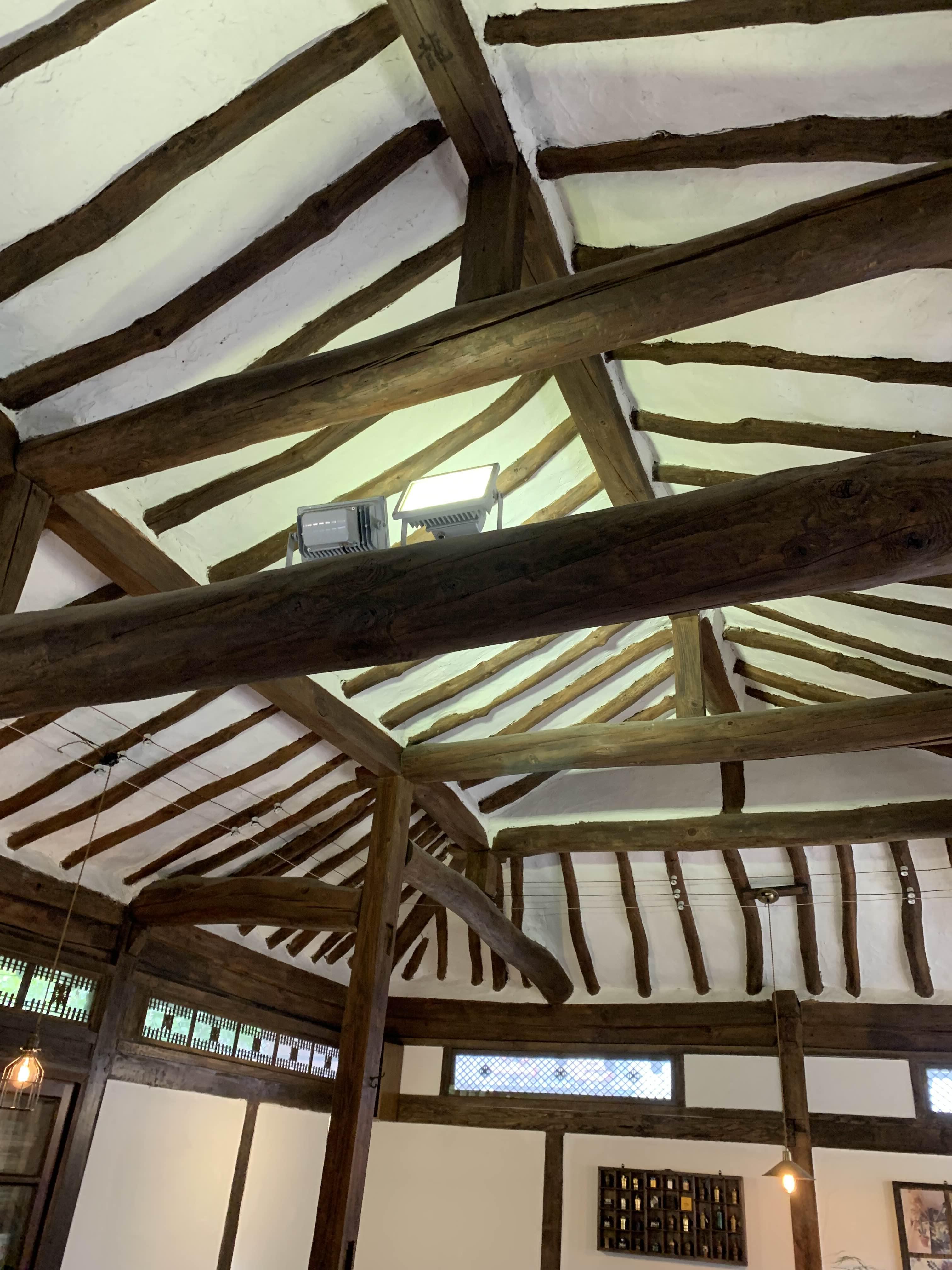 카페에 들어가면... ㄷ형태의 한옥 공간이라, 매장이 한눈에 들어오지 않는다. 주문하는 공간과 복도 공간을 지나며 화장실이 보이고, 그 안쪽 다른 공간이 마음에 들었다. 한옥의 천장은 역시 연등천장으로... 한옥의 대들보, 마룻보와 서까래가 눈에 들어오고... 한옥의 노출천정의 전기선의 고정은 애자! 사기로 된 애자를 이용하여 노출천정의 전선을 깔끔하게 정리되었다.