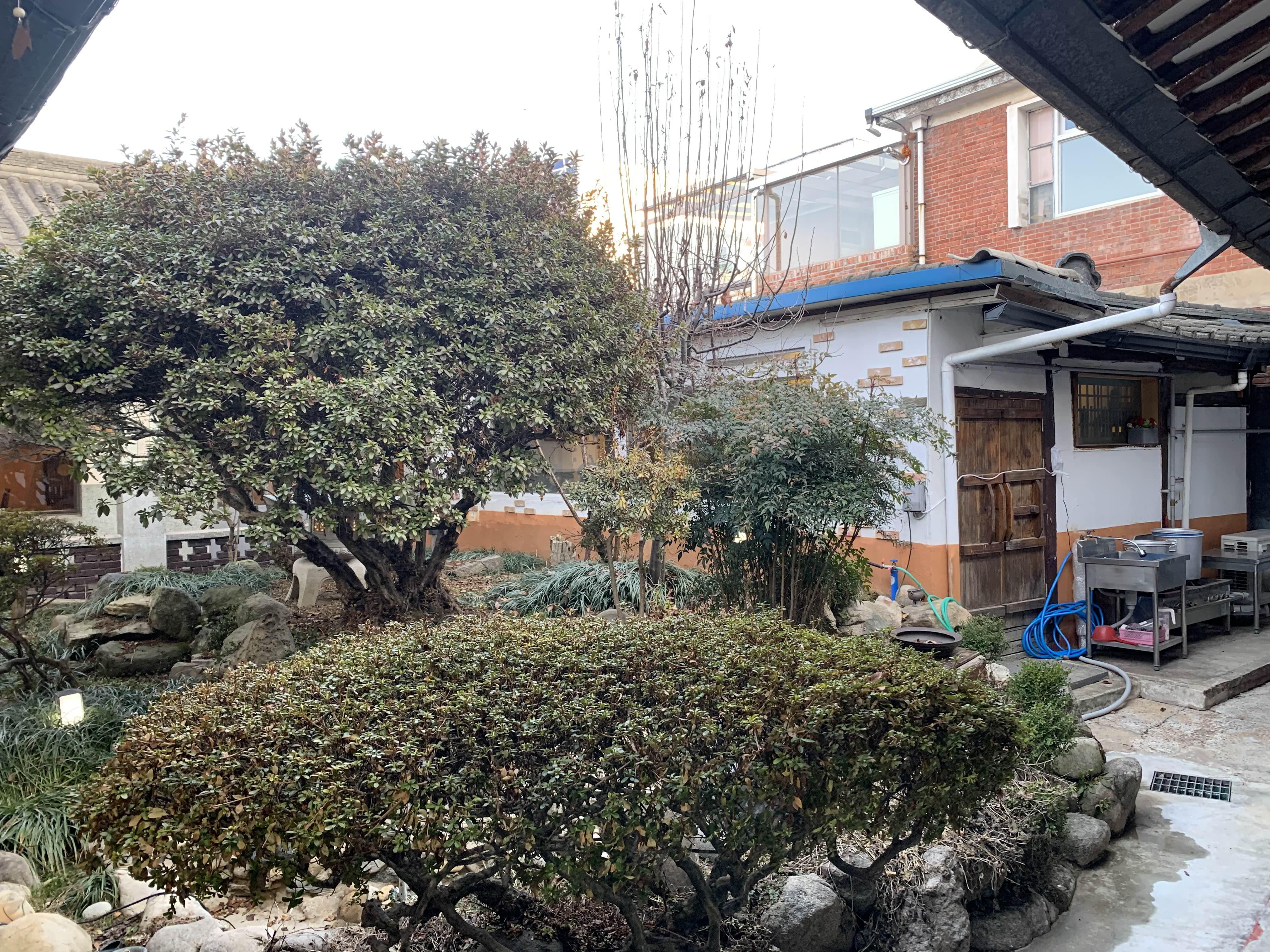 한옥의 내부 공간은 ㅁ형의 사각형으로 중앙에 소나무 반송이 있는데... 반송은 관리가 된 듯 안된 듯.... 오래된 느낌이 들었다. 그리고, 한 편의 난간석과 벽돌의 담장이 눈에 들어왔다.