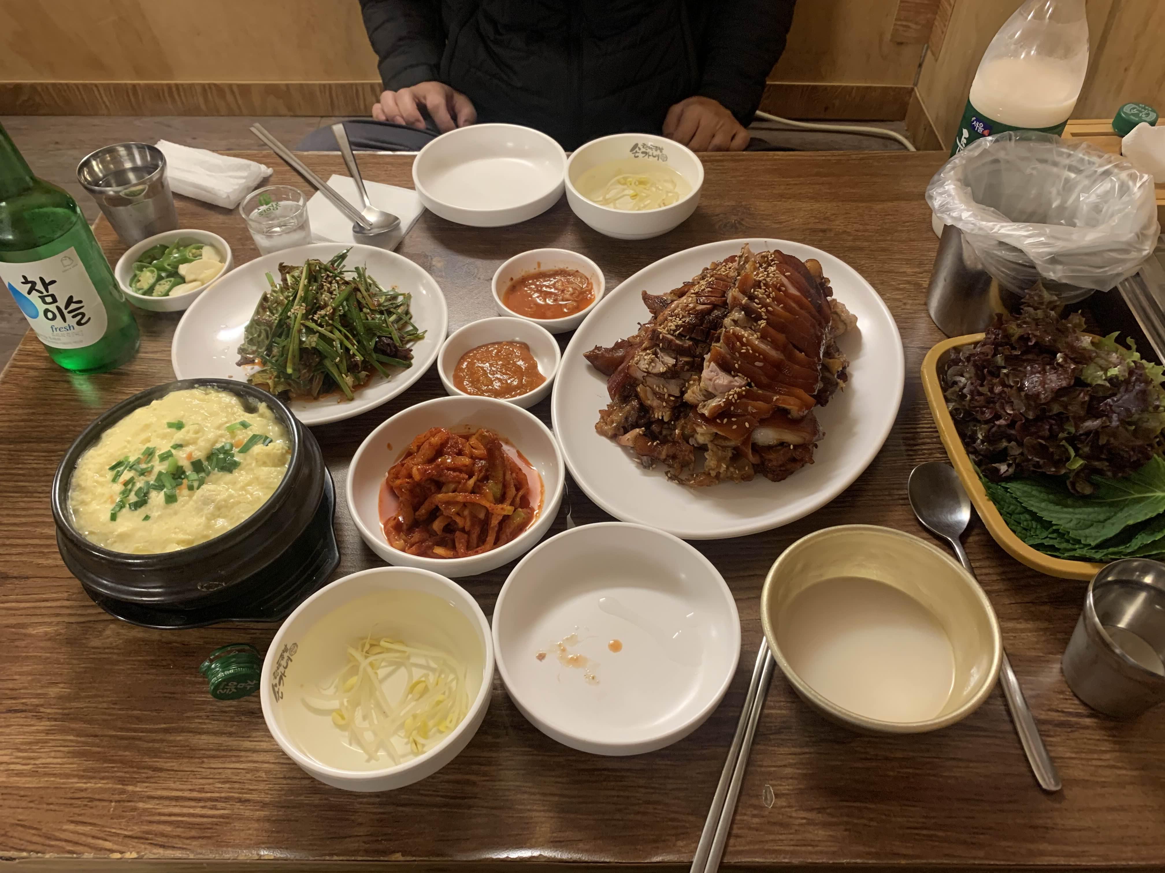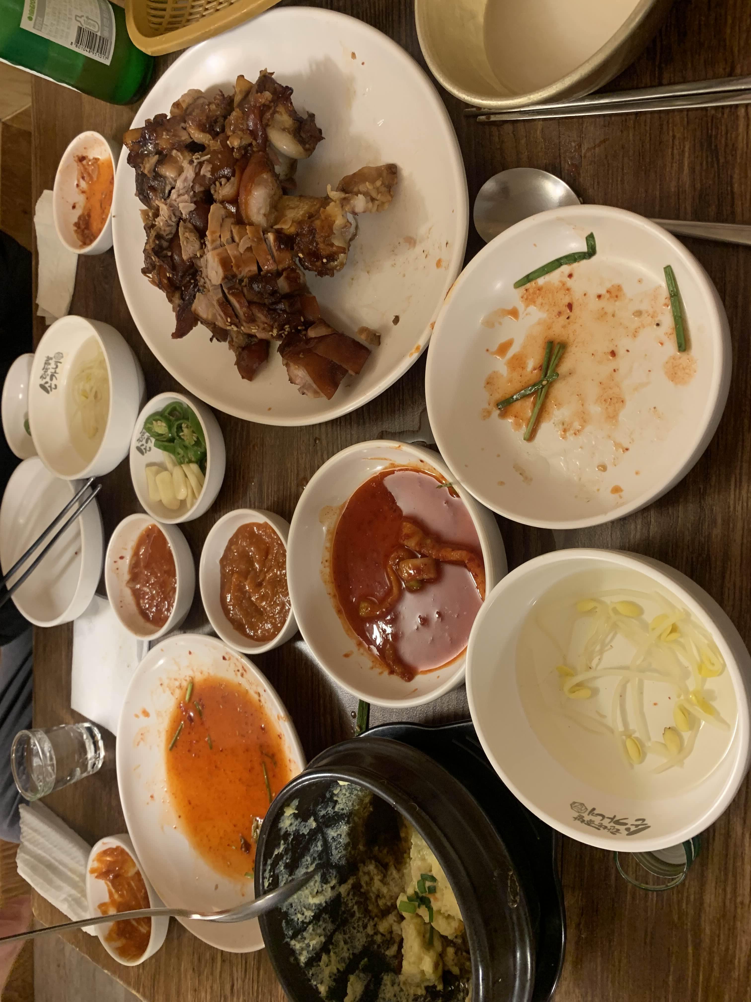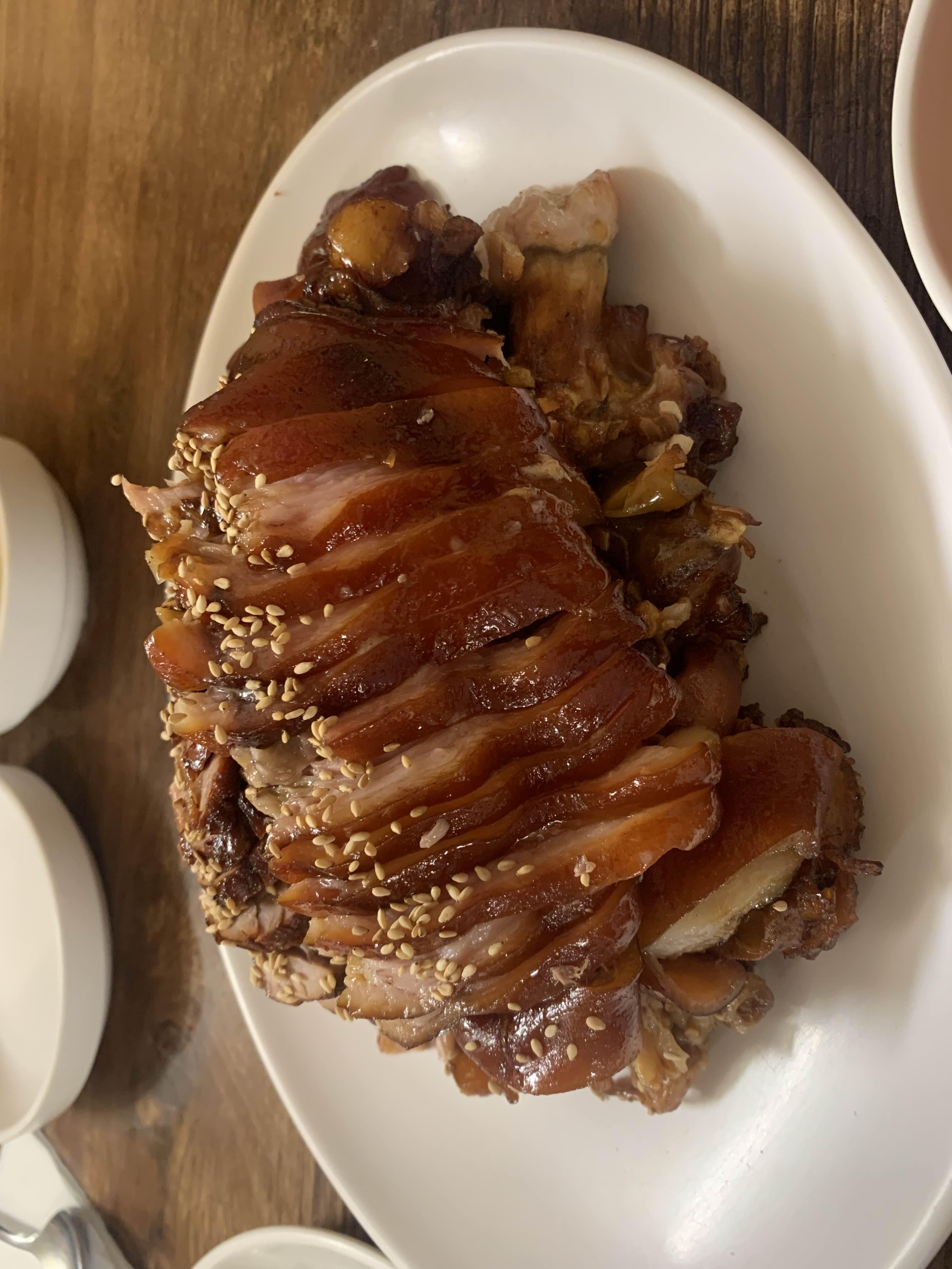 그리고 메인 음식인 족발이 나왔다. 족발이 나와서... 족발은 새우젓만 찍어서 맛보는데.... 족발이 정말 부드러웠다. 쫄깃한 식감이 아니라.... 뭐랄까? 동파육처럼 부드러운 돼지고기를 먹는 식감이랄까? 족발은 좀 질겨야 하는데... 이런 식감도 나쁘지 않았다.