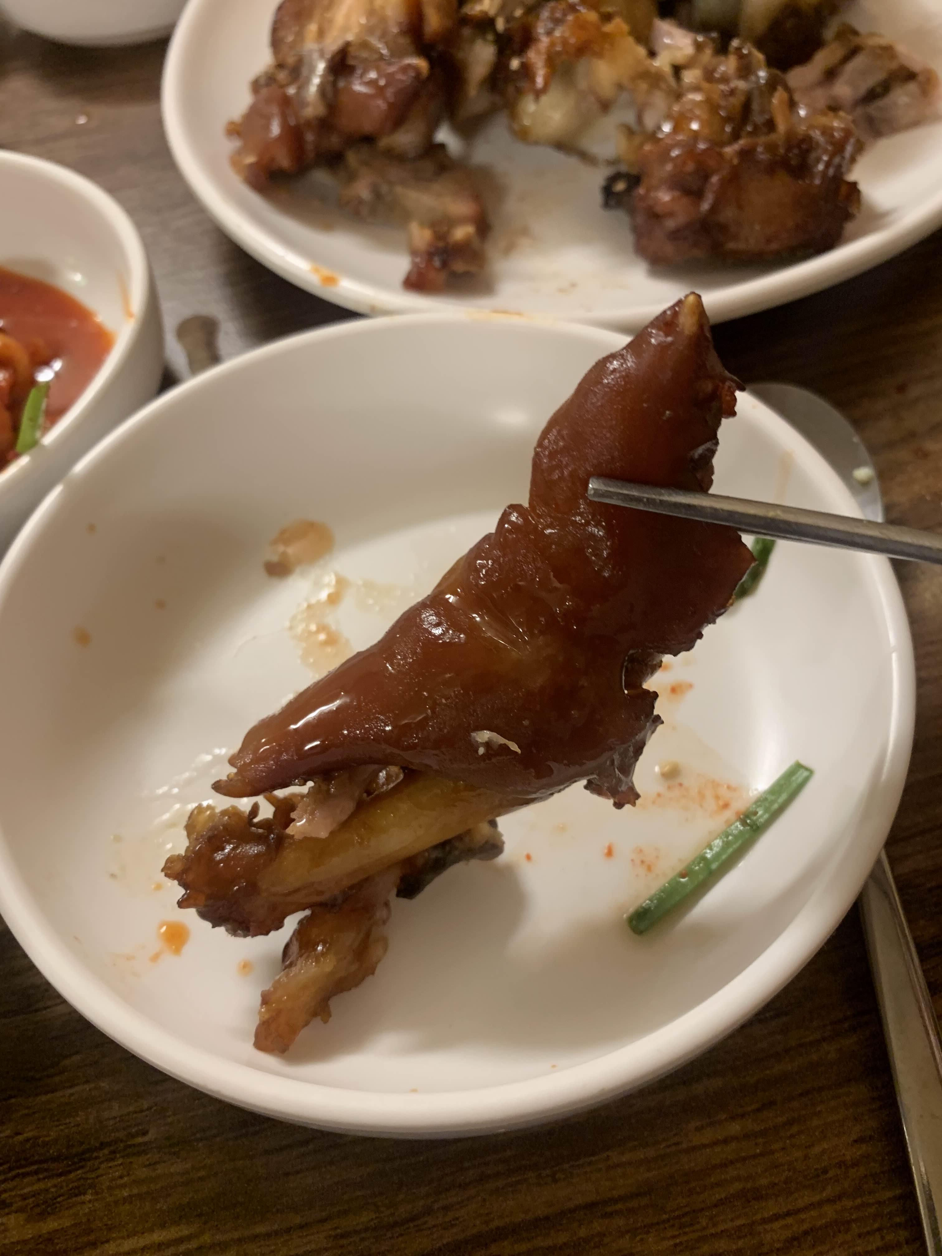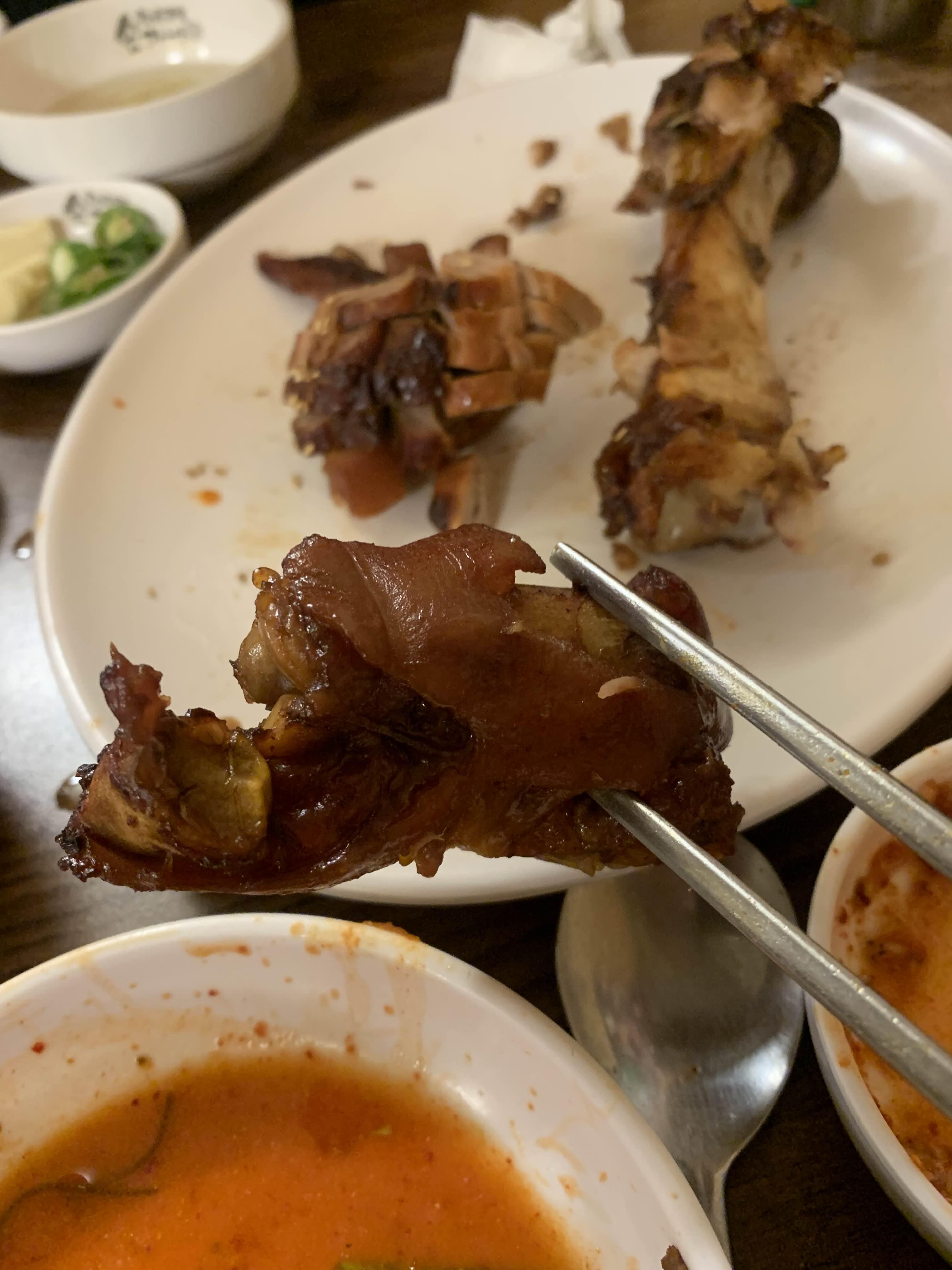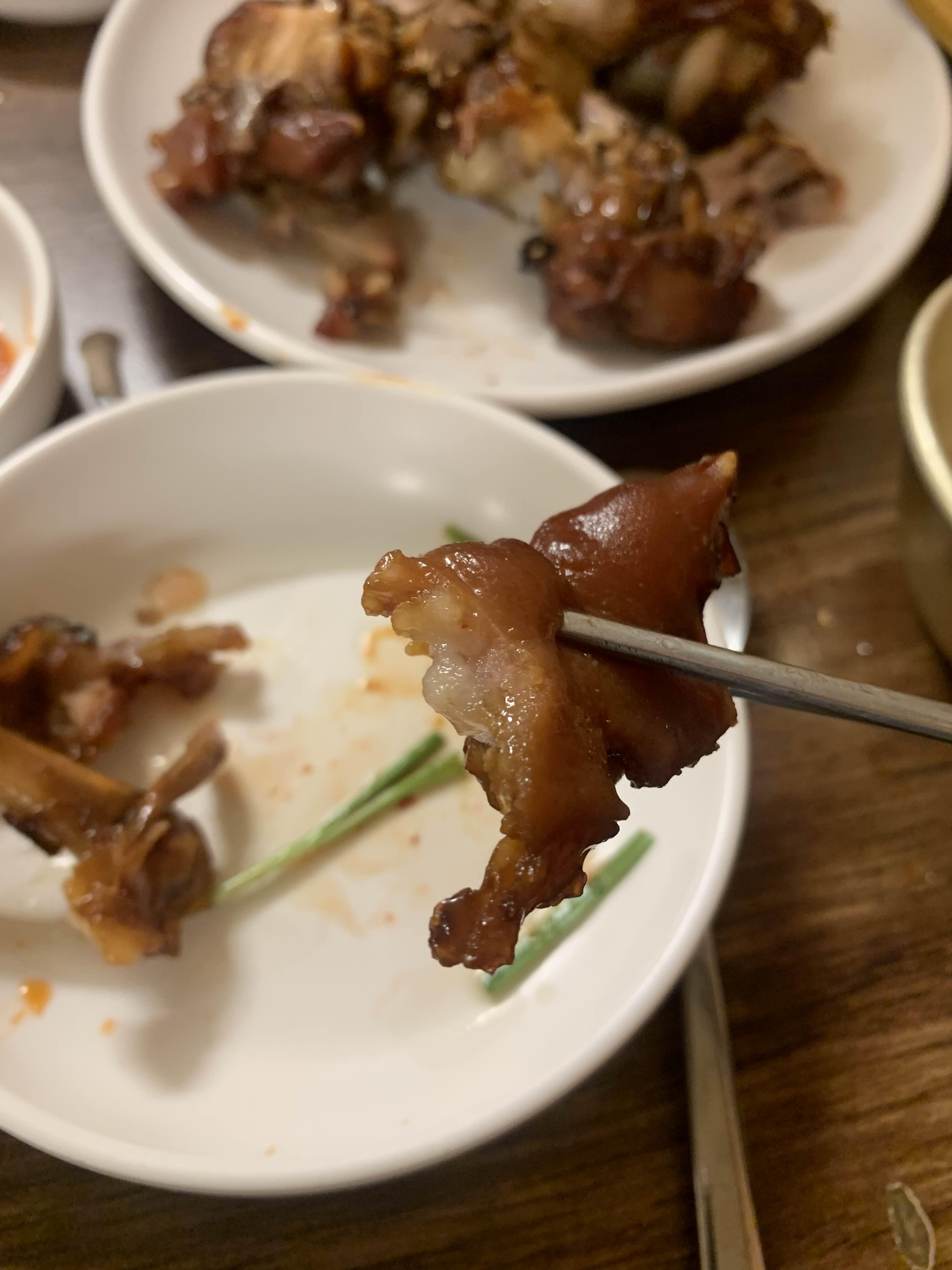 족발을 어느 정도 먹을 때쯤... 다리 부분을 뜯으니, 평소 느끼는 쫄깃한 식감이 느껴지는데.. 그 쫄깃함이 연하게 쫄깃한 느낌이랄까?