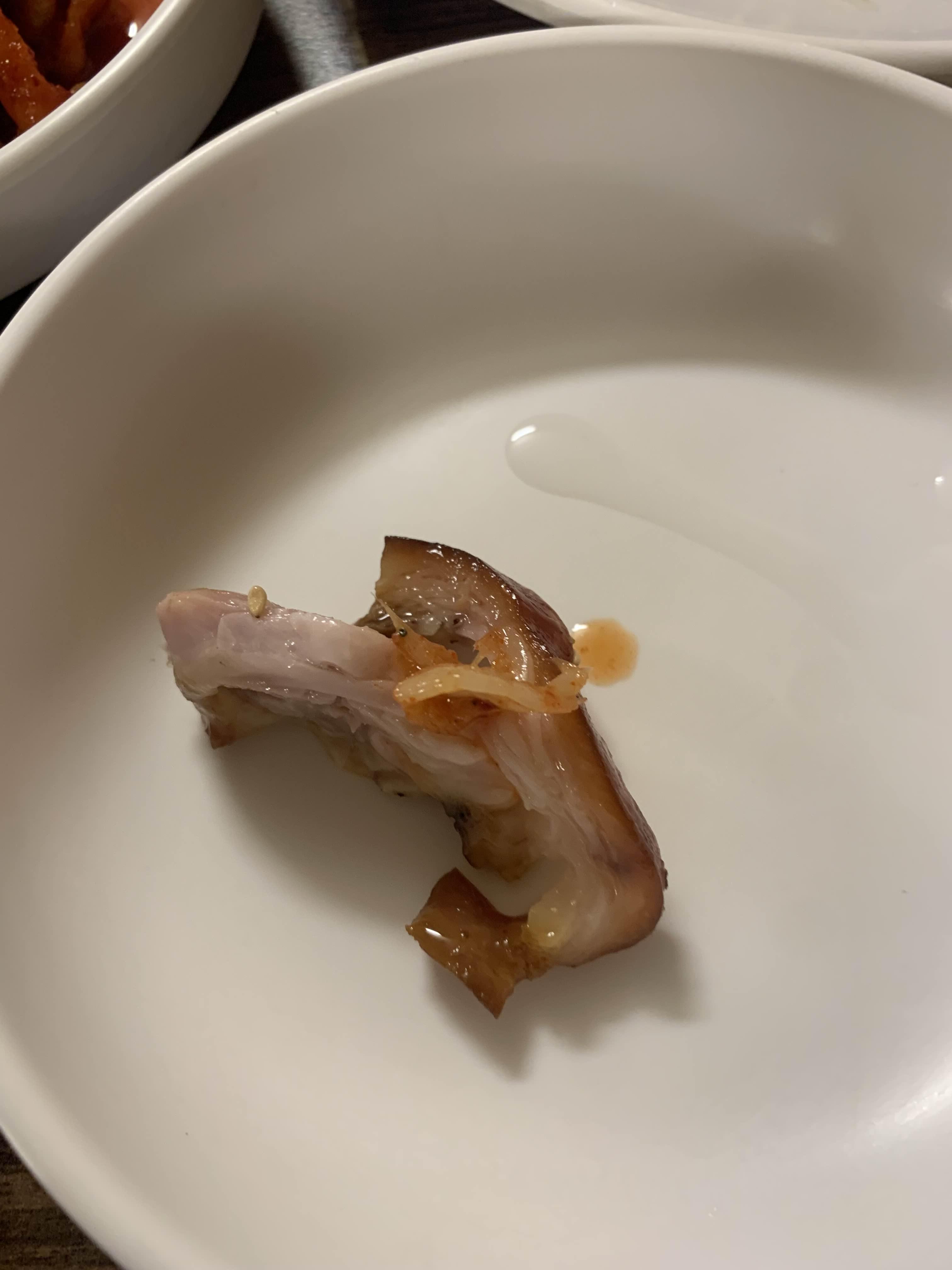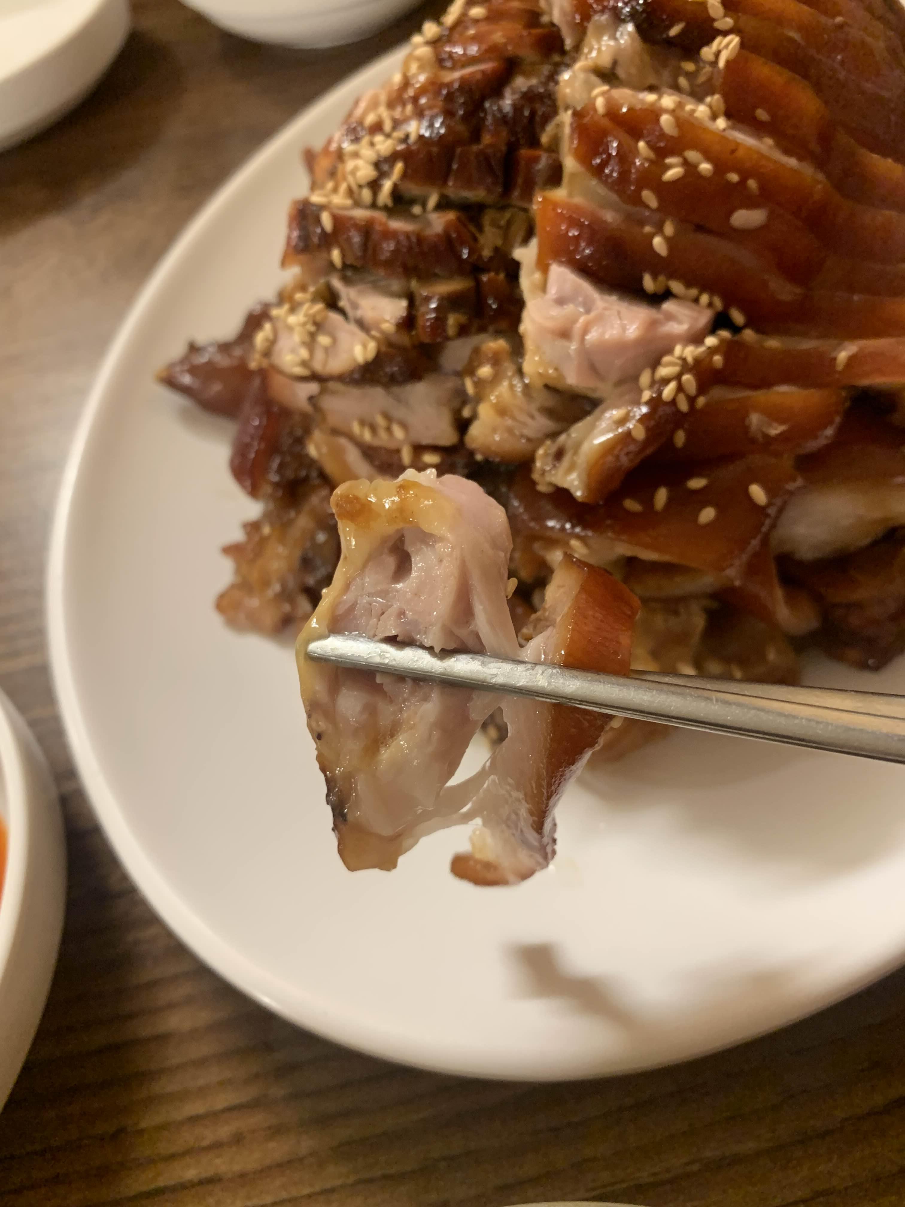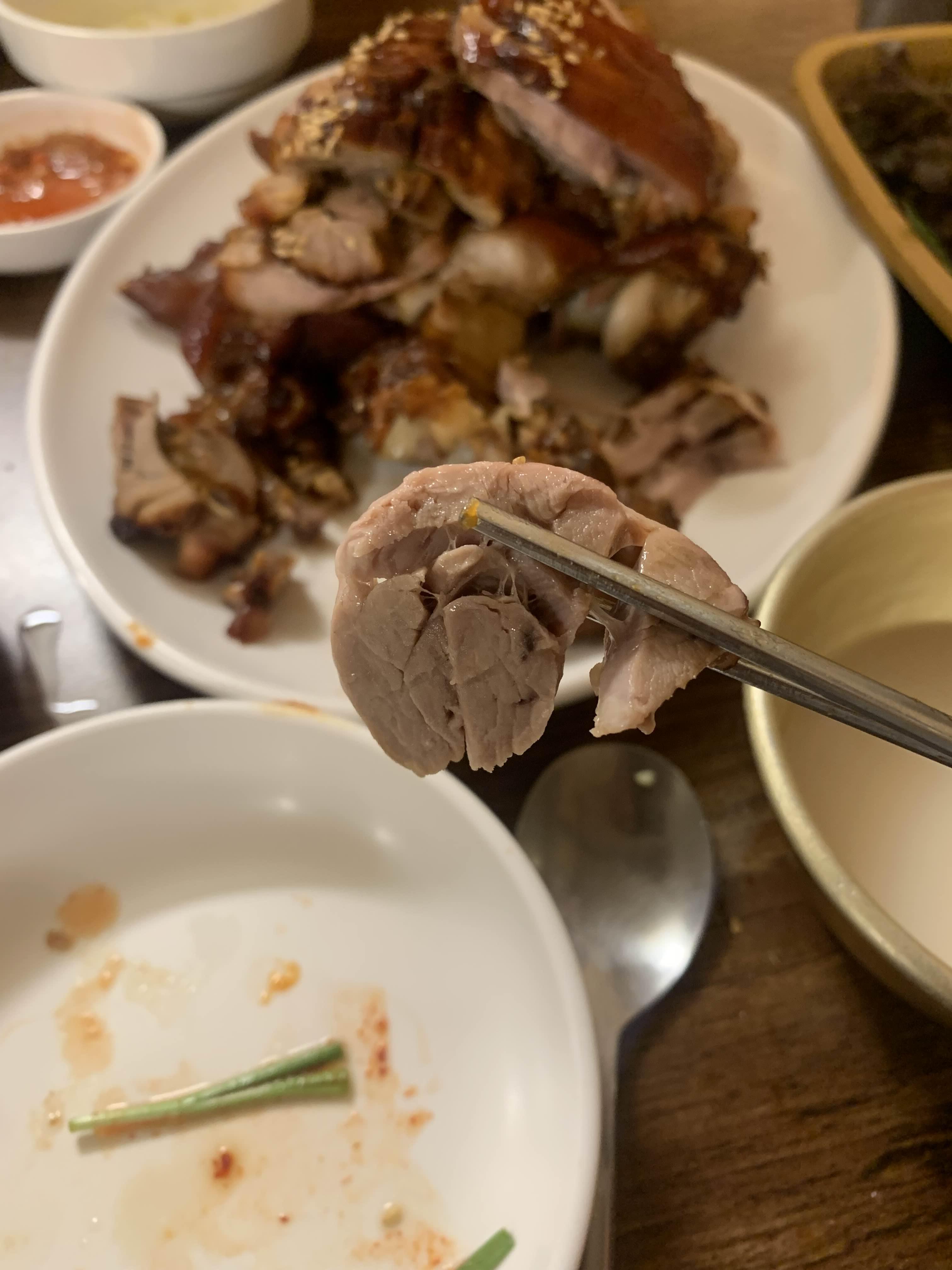 족발을 어느 정도 먹을 때쯤... 다리 부분을 뜯으니, 평소 느끼는 쫄깃한 식감이 느껴지는데.. 그 쫄깃함이 연하게 쫄깃한 느낌이랄까?