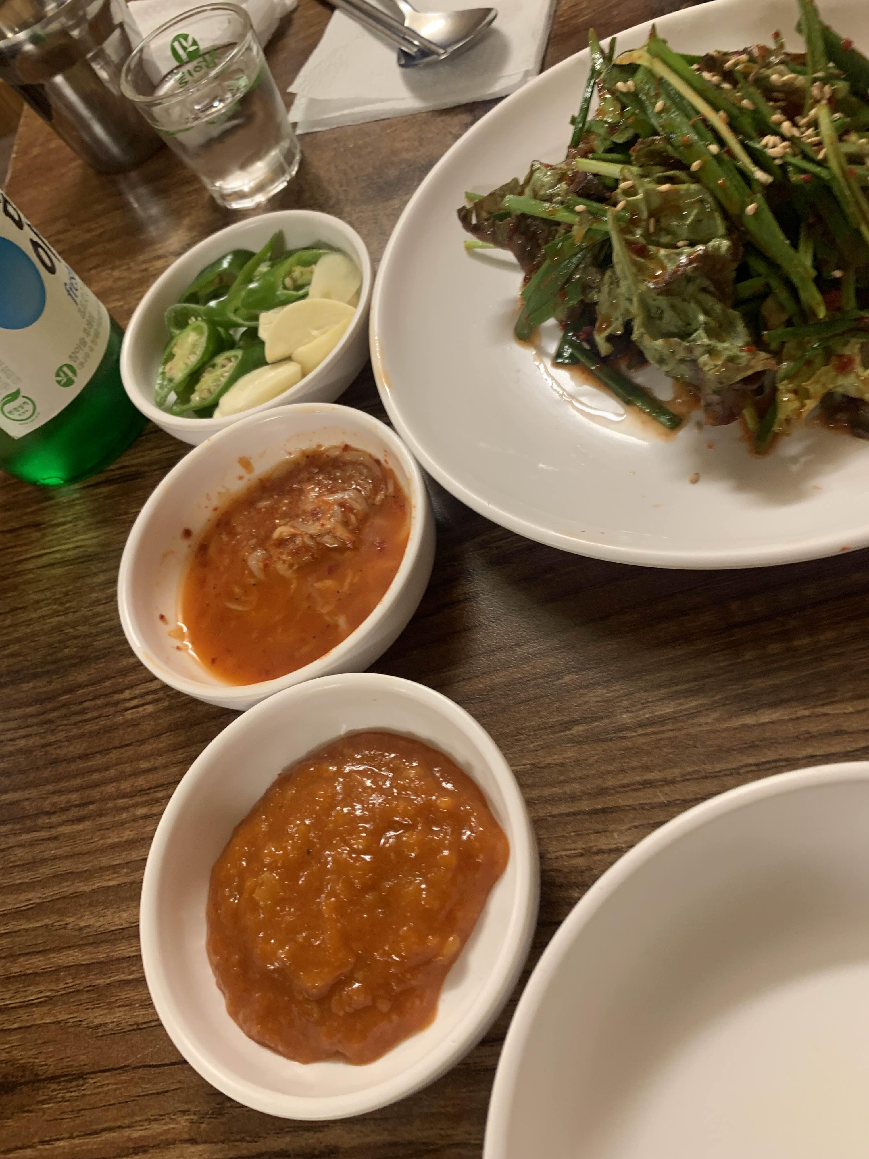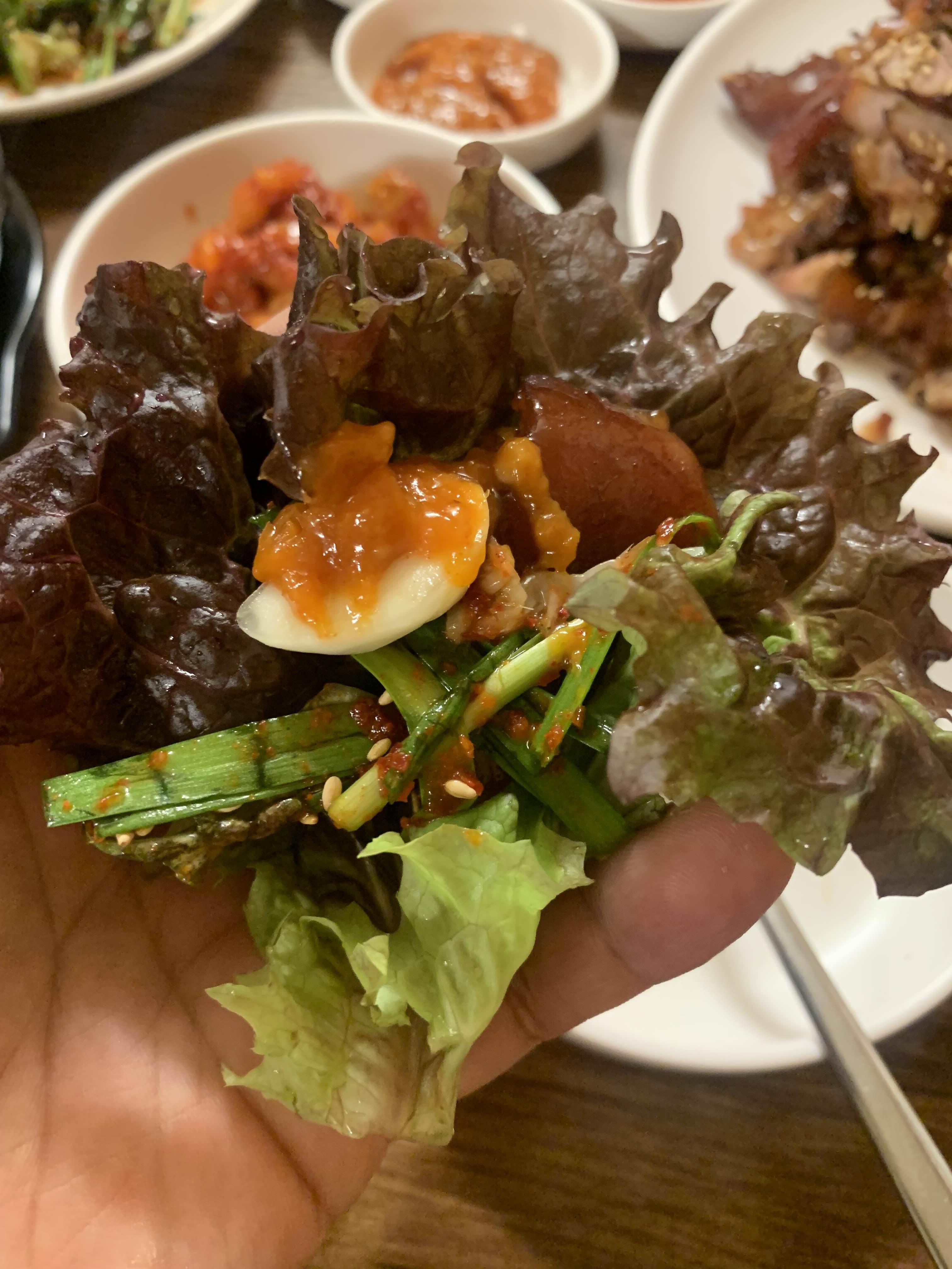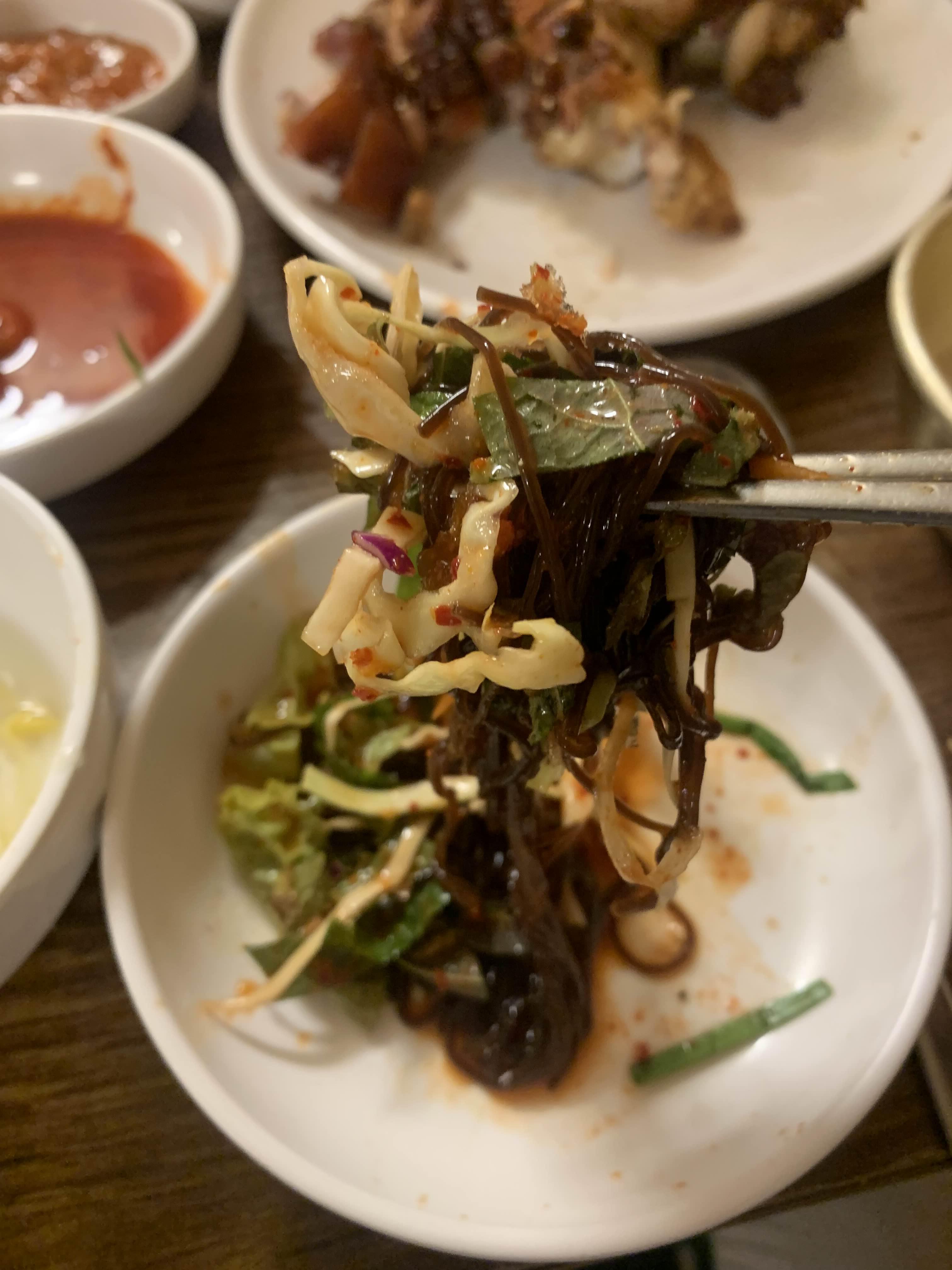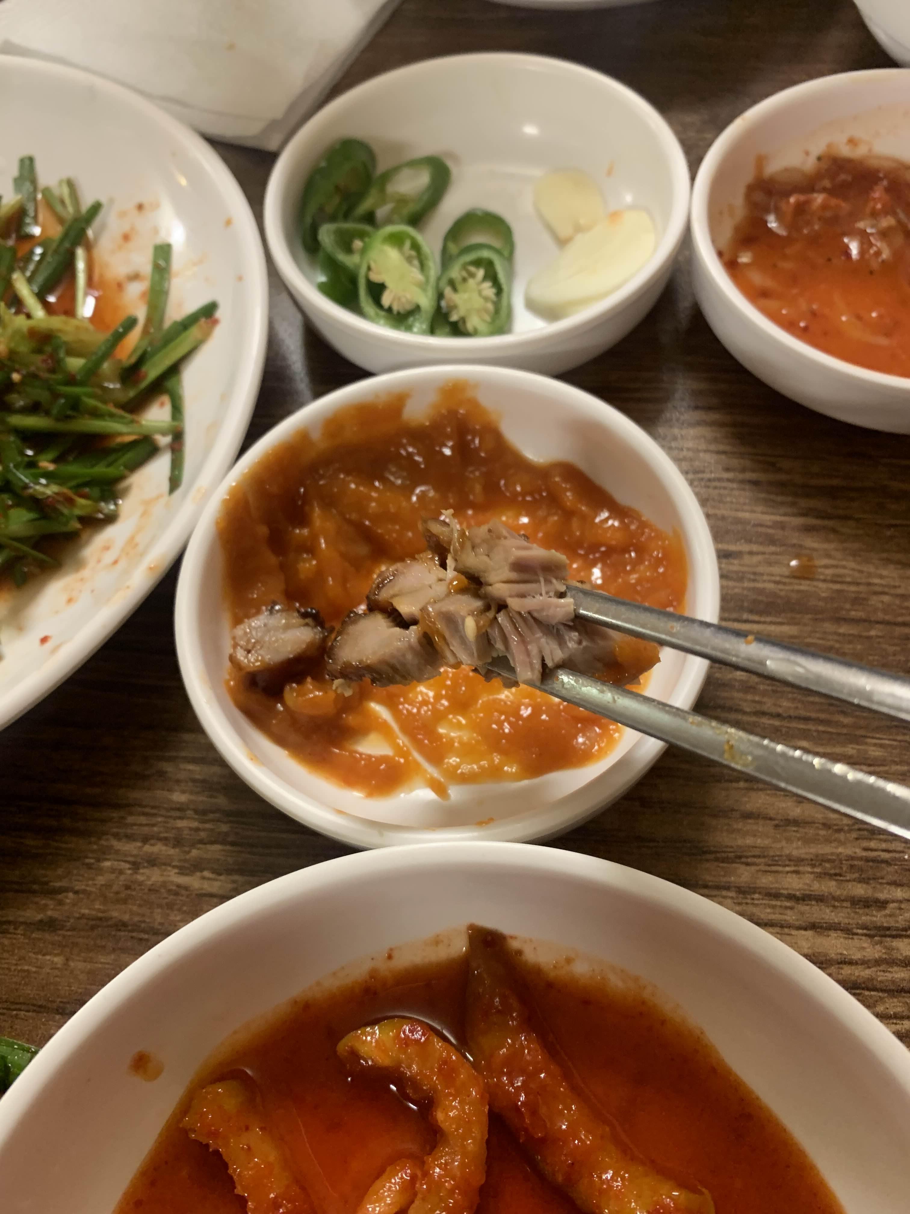 다양한 쌈 재료를 곁들여 족발을 맛보는데.. 족발이 상당히 맛나다. 맛있는 족발집은 양념(매운)과 일반 족발이 있는데... 양념의 매운맛이 없어도 족발의 싱싱함이랄까? 냄새도 안 나도 식감이 굉장히 좋았다.