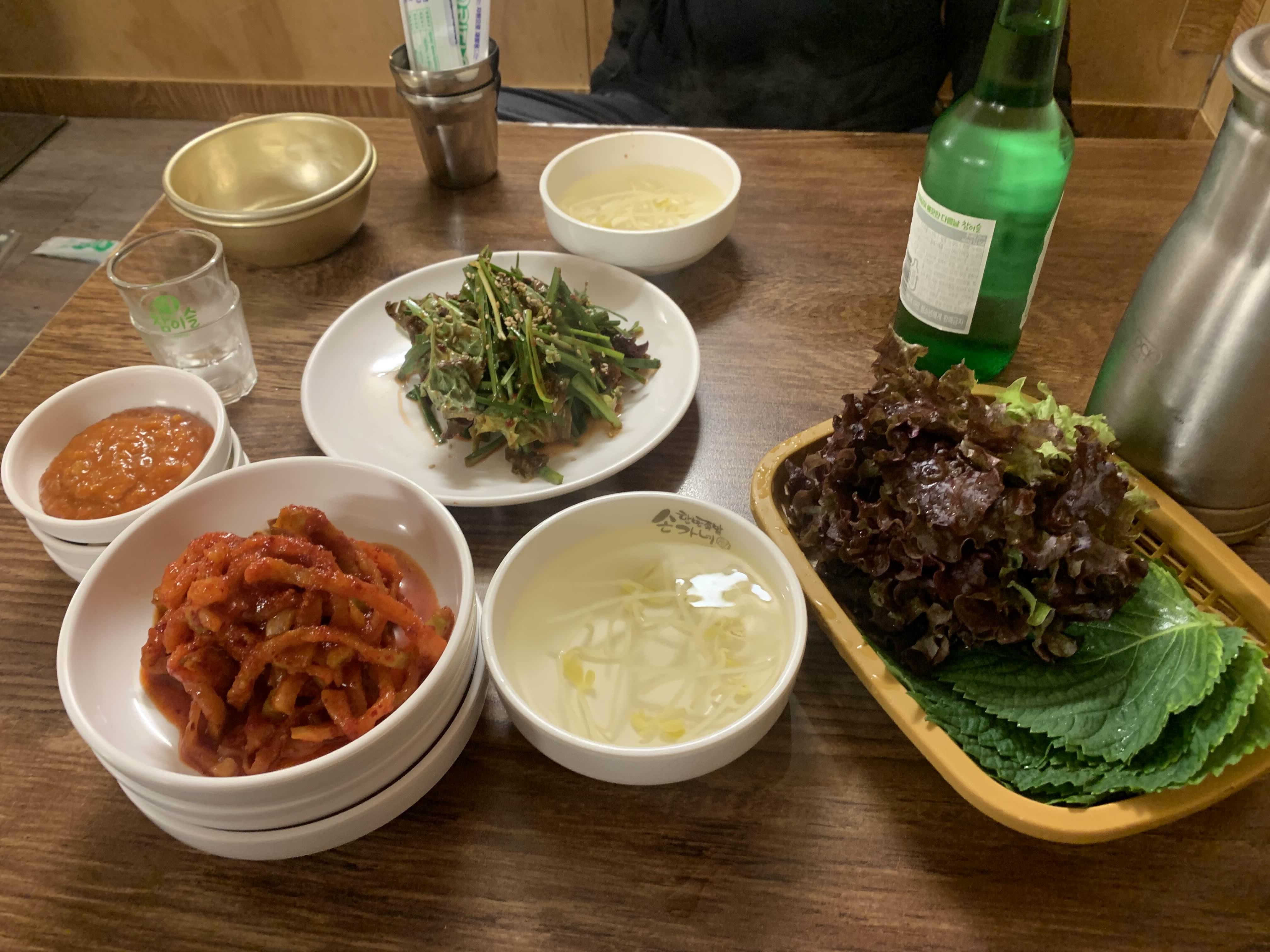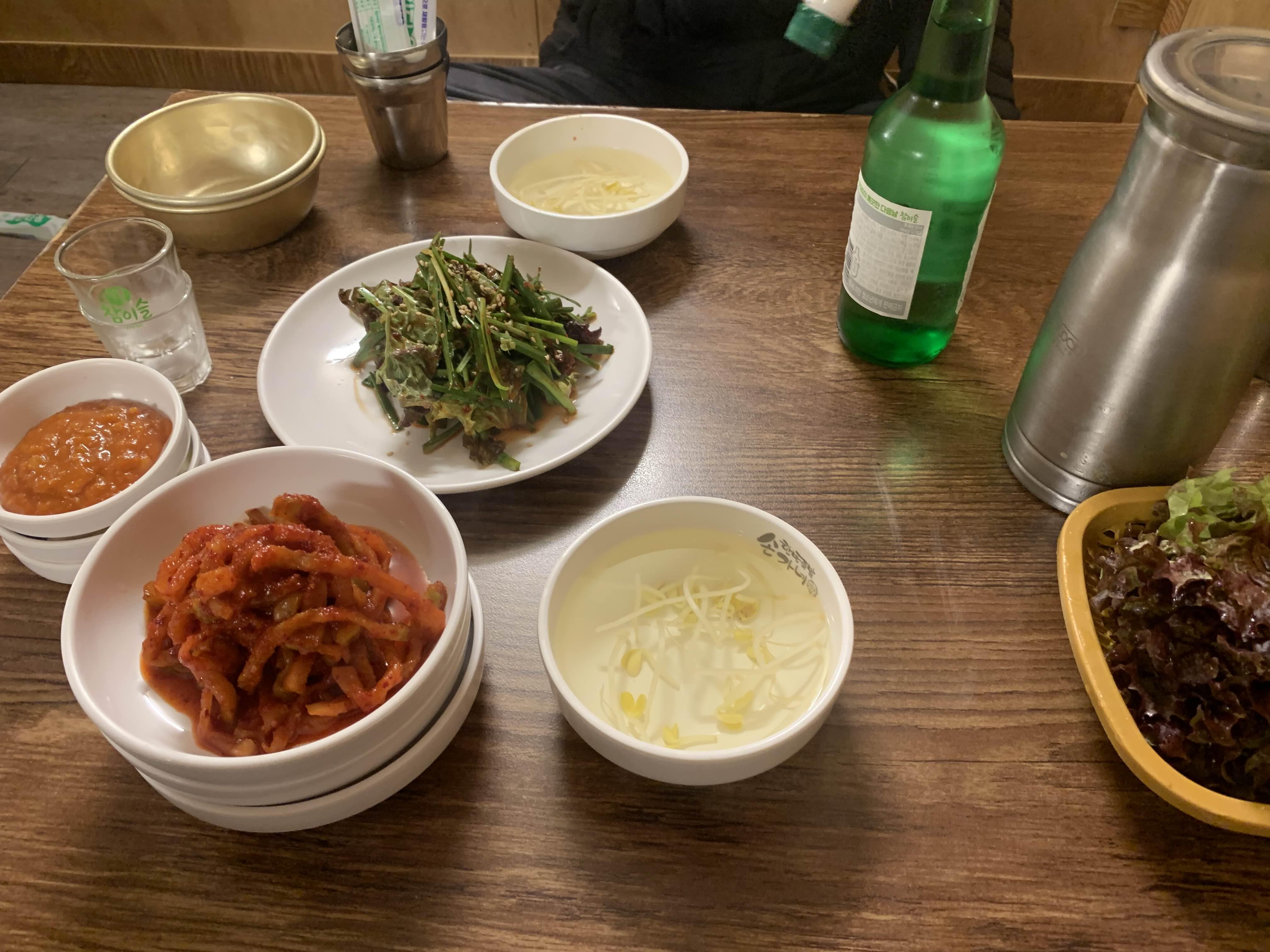 얼마 되지 않아 밑반찬이 나온다. 무말랭이 김치와 족발에 함께 먹는 상추무침과 쌈채소 콩나물국이 나온다. 매인 쪽박이 나오지는 않았지만!! 족발에 술 한잔 마시기 딱 좋은 상차림이었다.