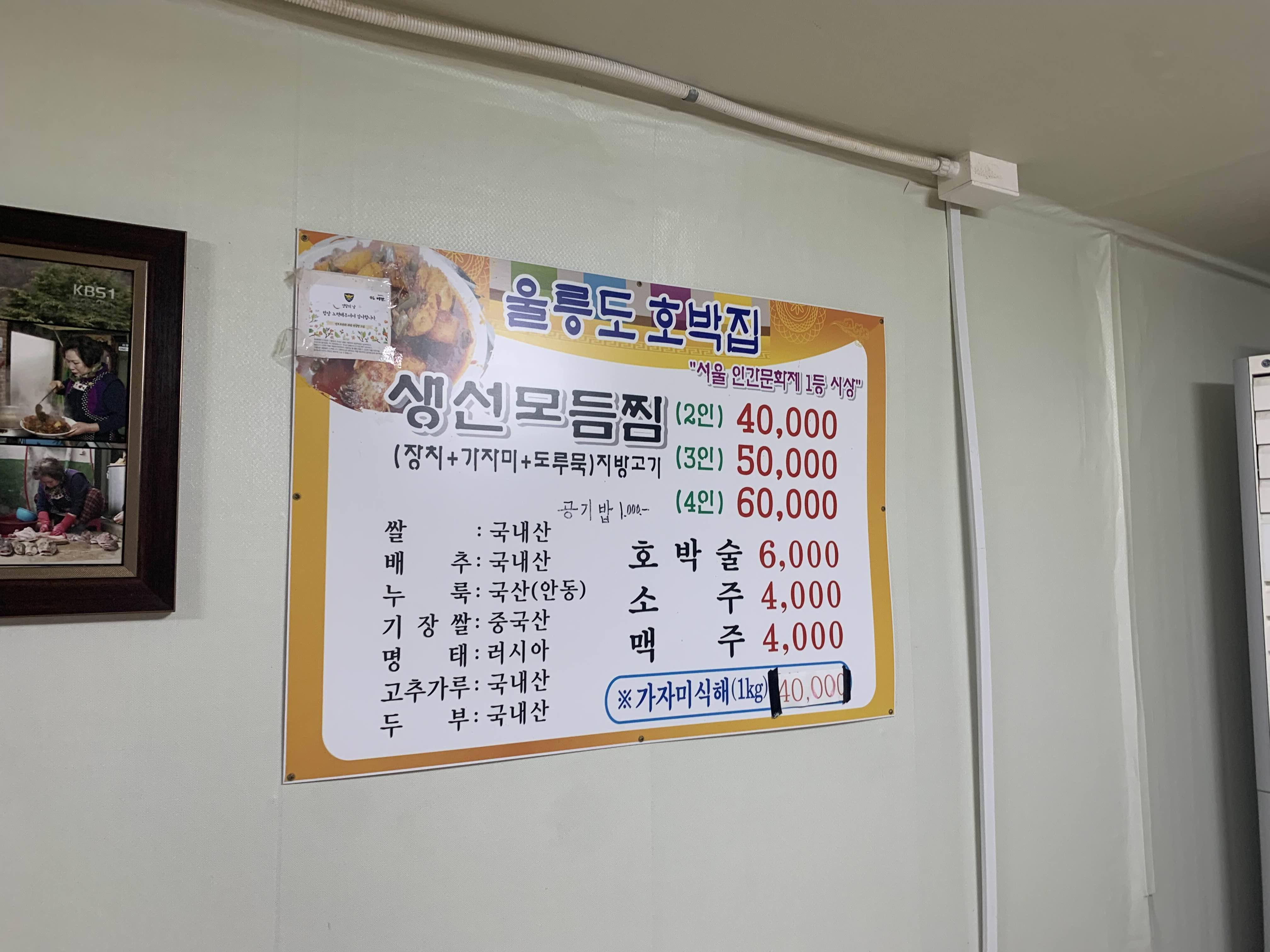 메뉴판은 생선모둠찜만 있고 2인, 3인, 4인 메뉴이고... 4만 원, 5만 원, 6만 원으로 구성되어 있다. 그리고 술은... 호박술!!ㅎㅎ
