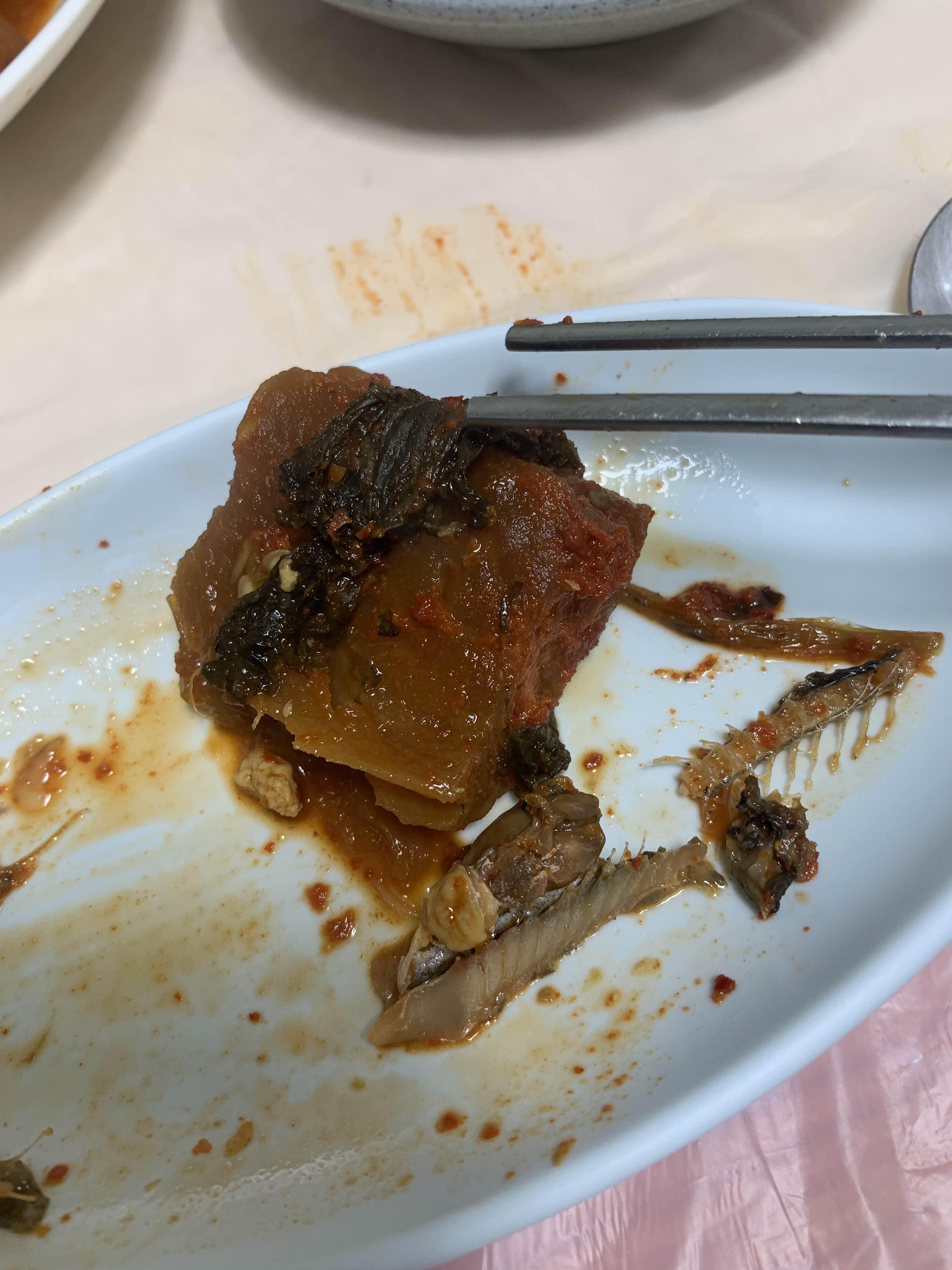 생선찜 먹기 전 무김치를 하나 먹어보니.ㅎㅎ 맛있다.ㅎㅎ 무가 달달하다!