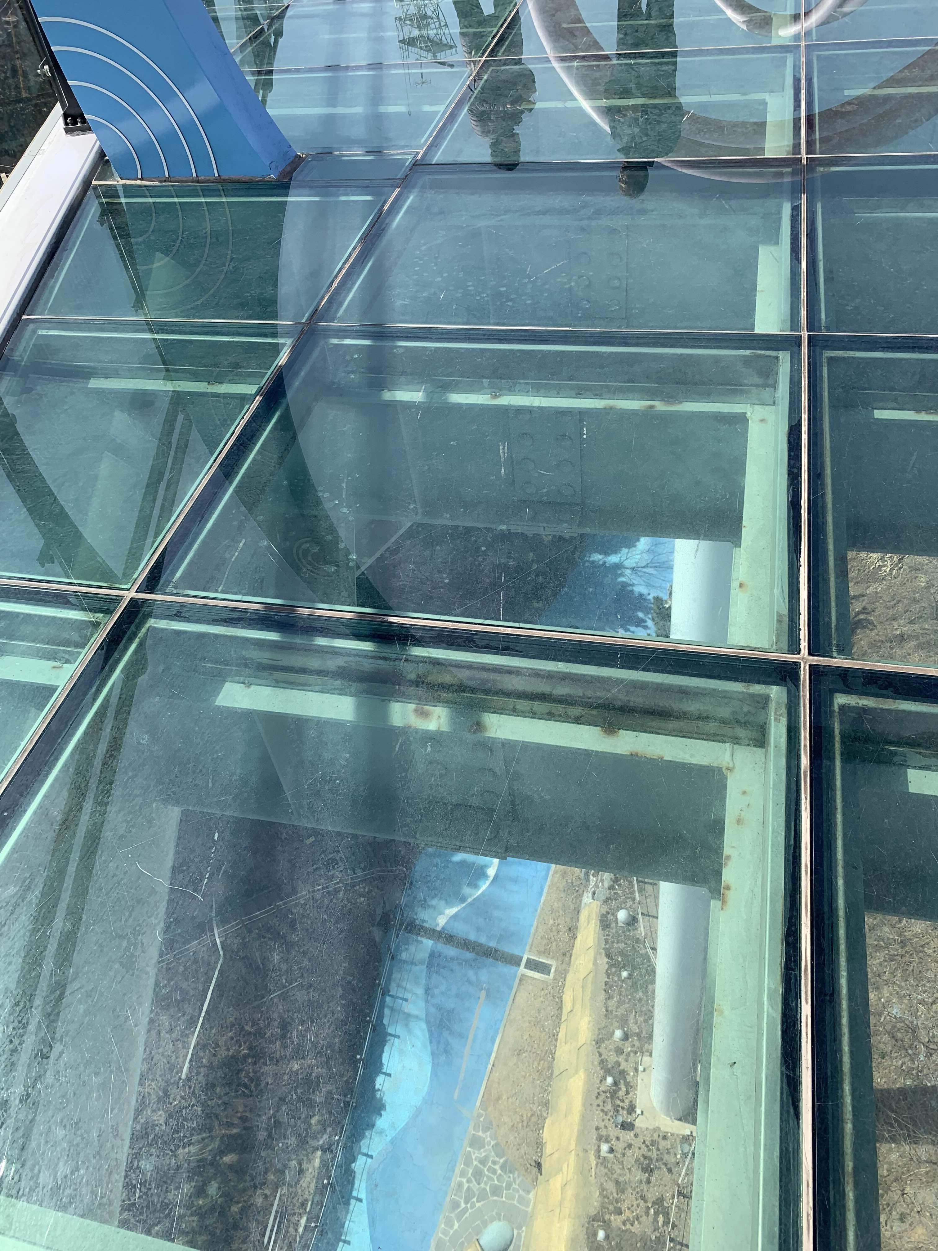 전망대 마지막에는 바닥이 강화유리로 된... 구조물이 설치되어 있다. 중국 어디에선가 강화유리 테스트하려고.... 망치로 타격했다! 강화유리가 파손되는......