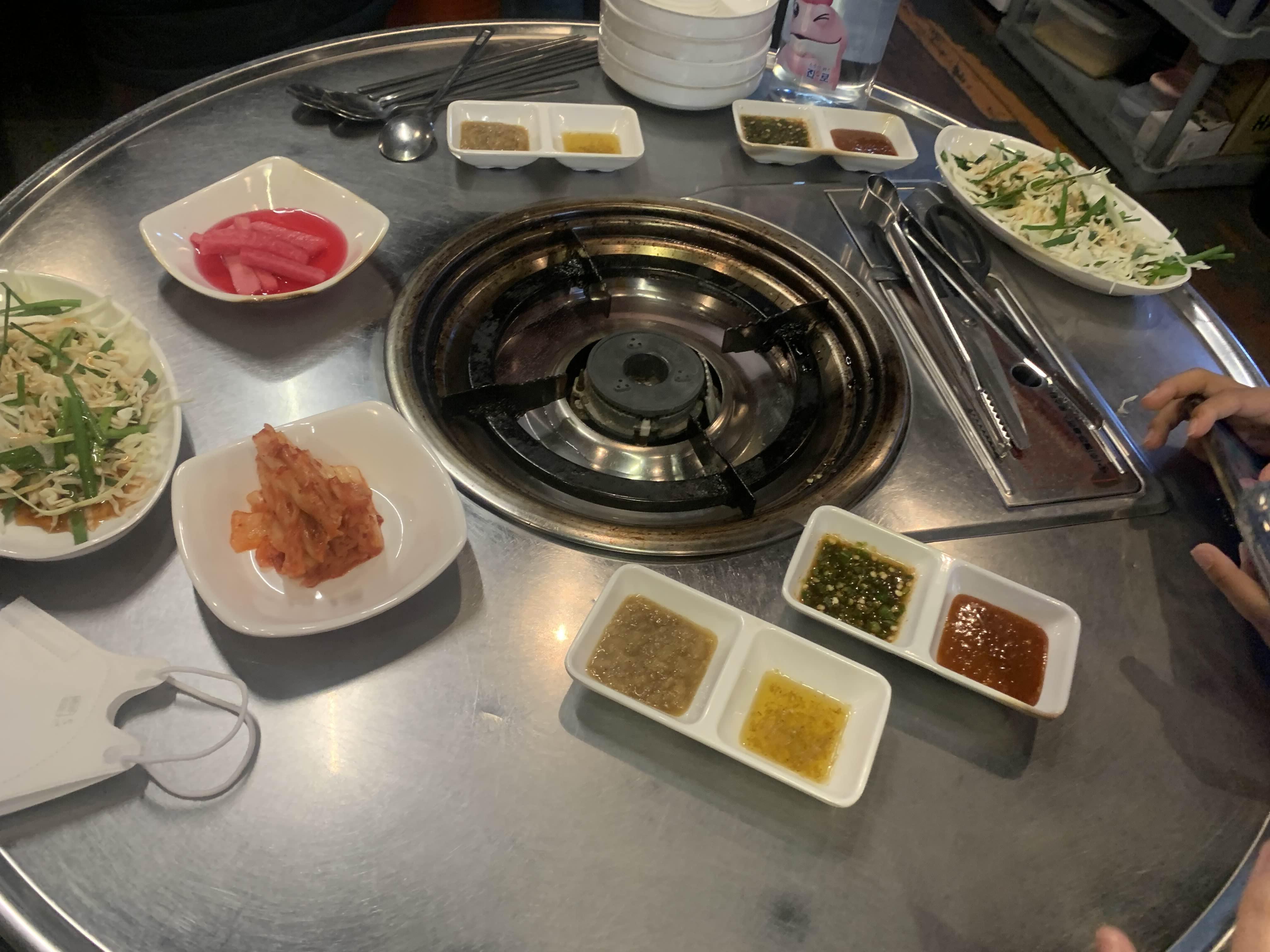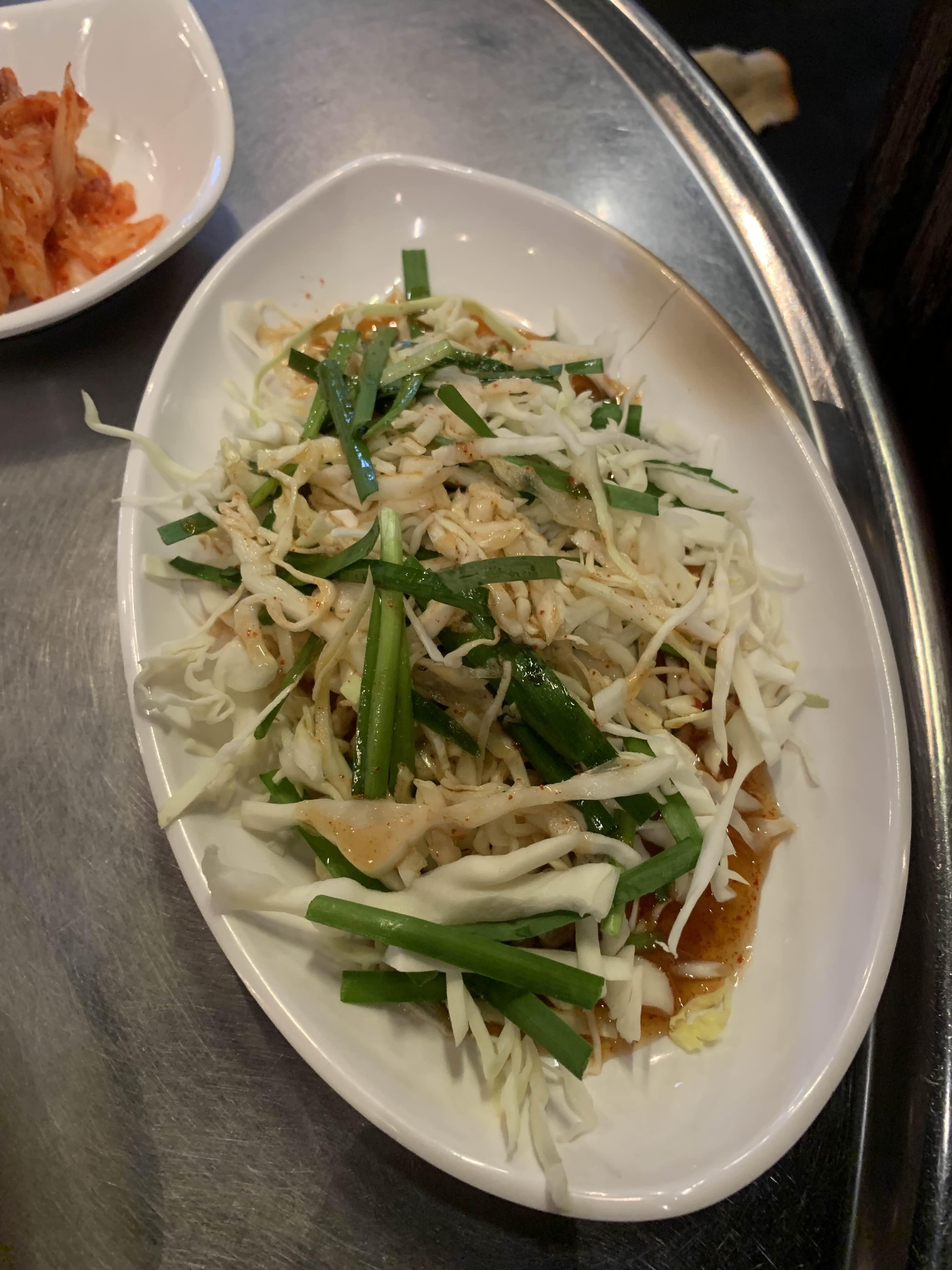 메뉴판을 스캔하고... 다른 테이블 메뉴를 보니!! 대부분 메뉴는 진수성찬 1인분에 18,900원으로 주문하셨더군요. 일단 2개 주문하고.. 부족하면, 추가로 주문해 보기로 했습니다. 음식을 주문하면 김치와 곱창과 곁들여 먹는 양배추가 나오더군요.
