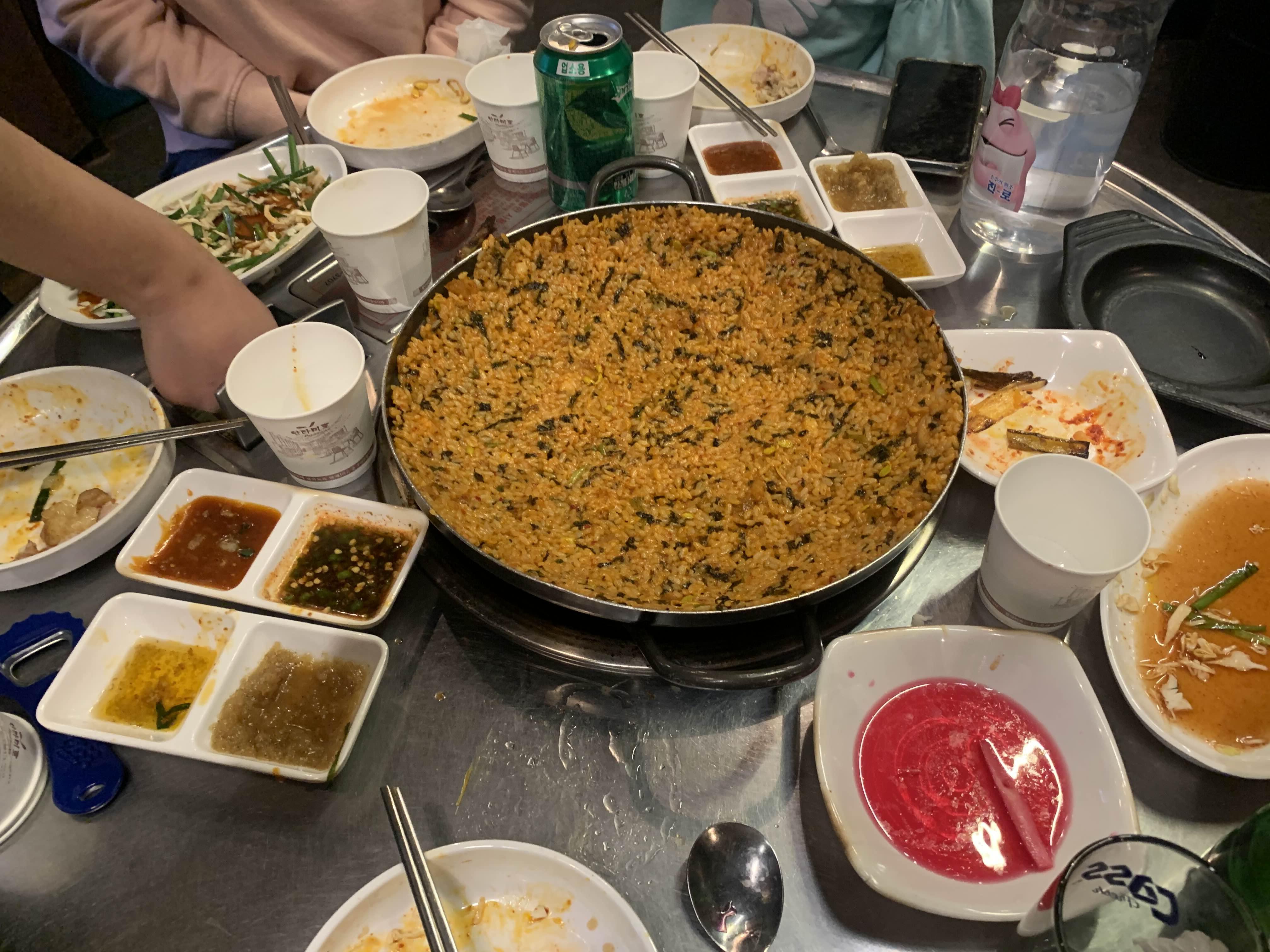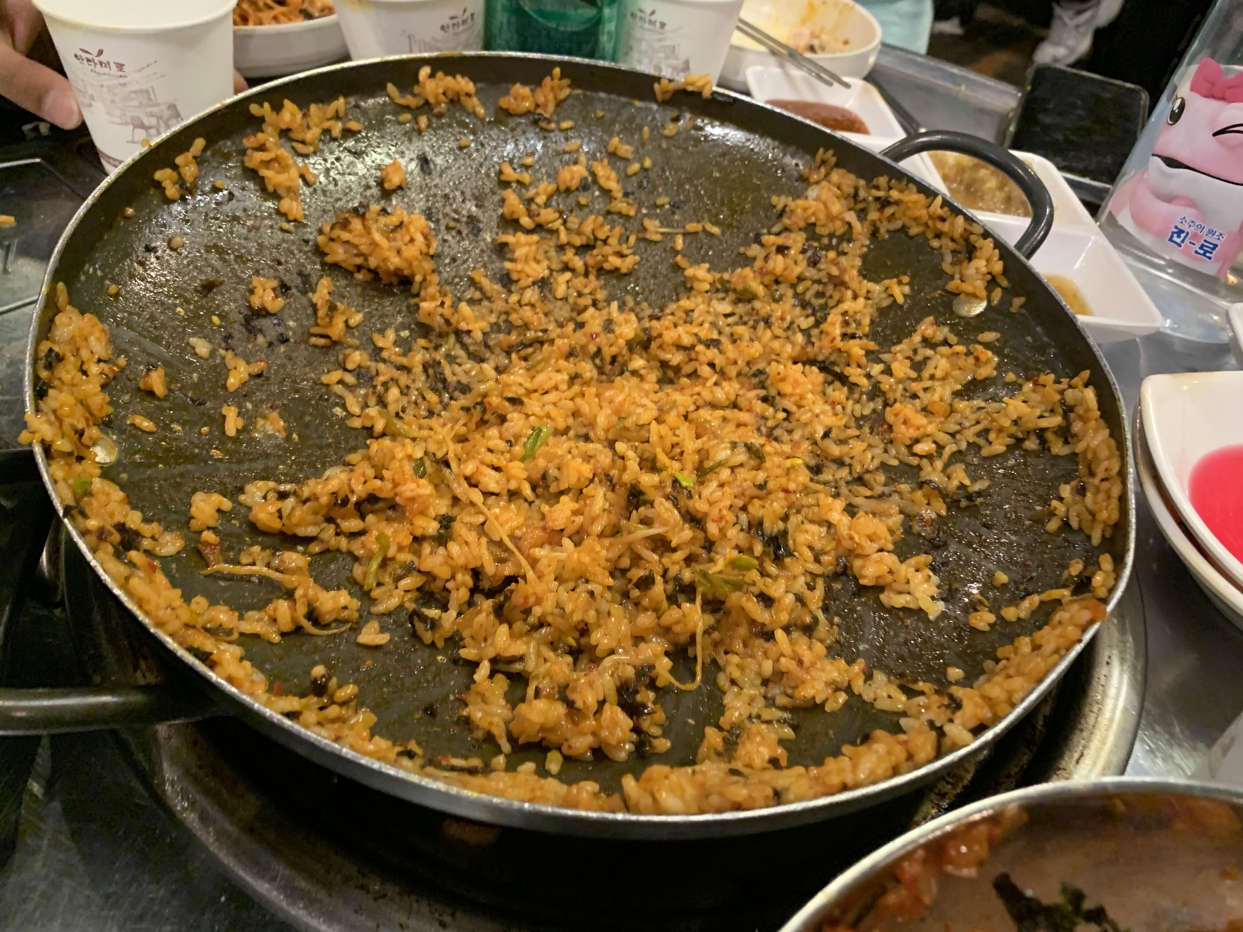 김치를 맛있게 구워 먹고.. 곱창을 추가하려다... 아이들이 먹기에는 좀 질겨서(난 맛있었지만;;;) 바로 후식을 주문해 보았습니다. 후식은 볶음밥 1인분에 2,000원! 메뉴는 2인분부터 주문 가능하여~ 볶음밥 2인분! 그리고 김치말이 국수를 주문해 보았습니다.